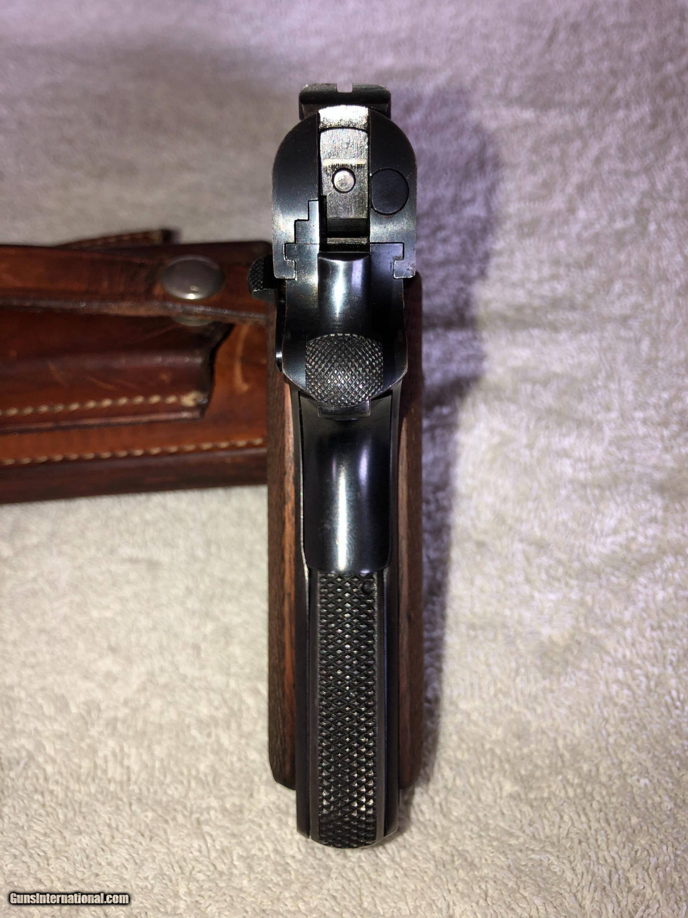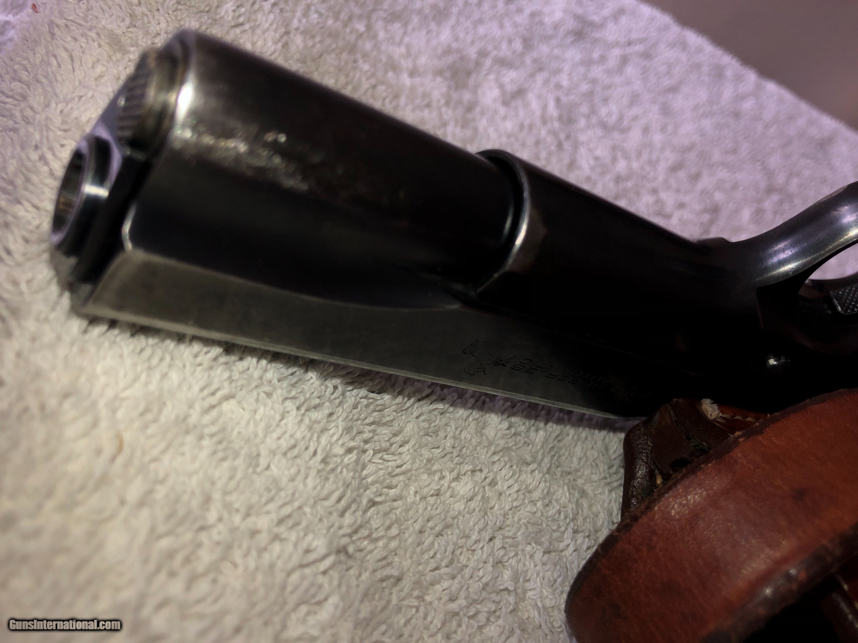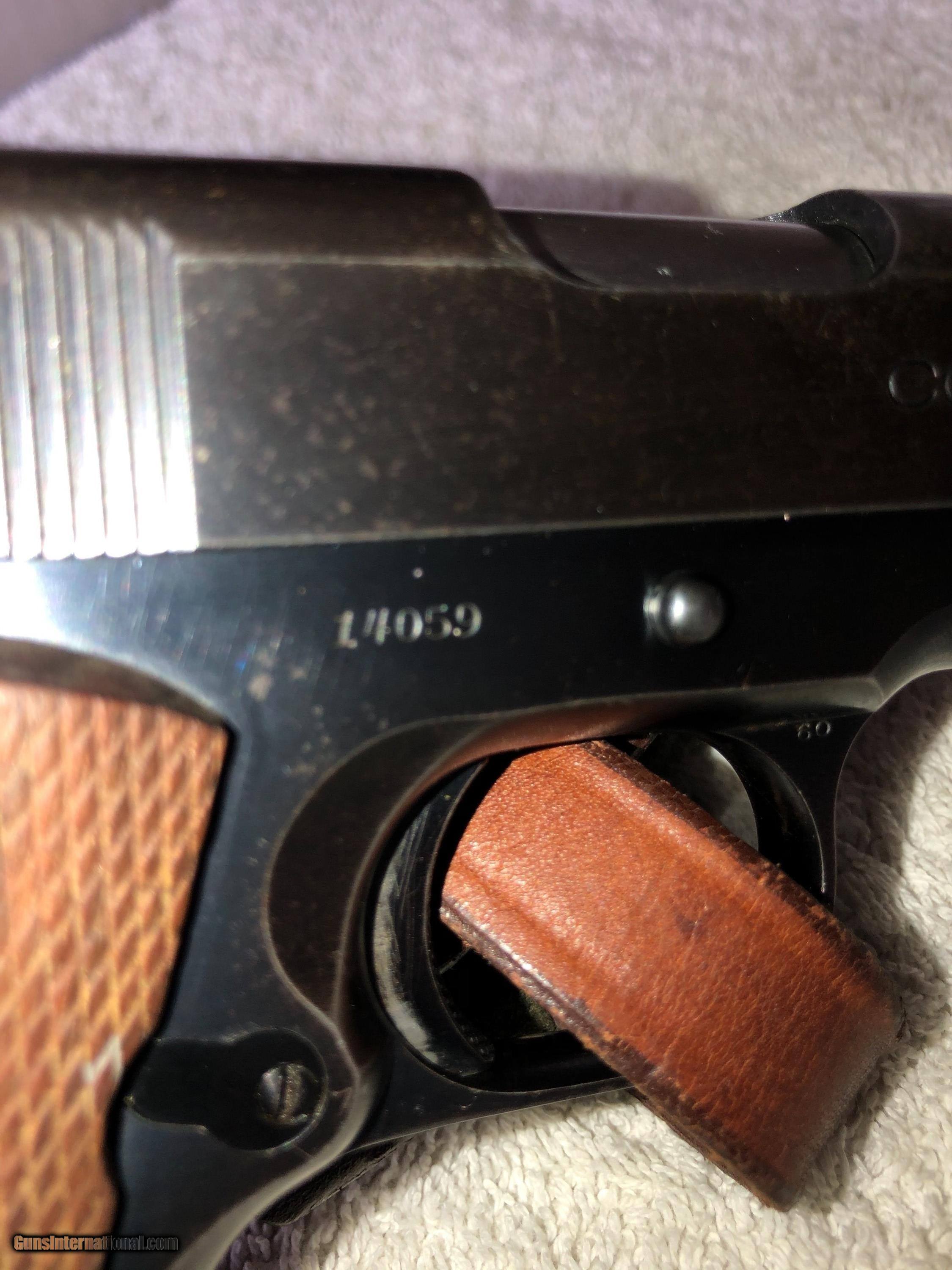 Description: Beautiful 1933 Relic (Pre 45 Pre-War) Colt .38 Automatic Pistol chambered in .38 Super. The pistol is fitted with a 5 inch barrel, fixed sights, full checkered walnut grips, checkered arched main-spring housing, checkered trigger face, checkered wide spur hammer, (1) two tone magazine, and is blue finished. It is in excellent/as goodl condition, retaining much of its original blue finish. The bore and the action function well. The grips are in excellent condition, they fit perfectly, have no cracks or chips and all 4 screw-heads are unmolested. The magazine is in excellent condition and works perfectly in the gun.With original case and one magazine. ***Given to me from my grandfather Senator Loren Kimball of Maine and has been in the family for 88 years.*** Serial number: 14059 / COLT. SOLD Curio/Relic: Yes Handgun Caliber: .38 Super Auto Manufacturer: Colt Model: .38 Super Auto Serial Number: 14059 Condition: Good Metal Condition: Good Wood Condition: Good Bore Condition: Good Manufacture Date: 1933 Engraving: N/A |