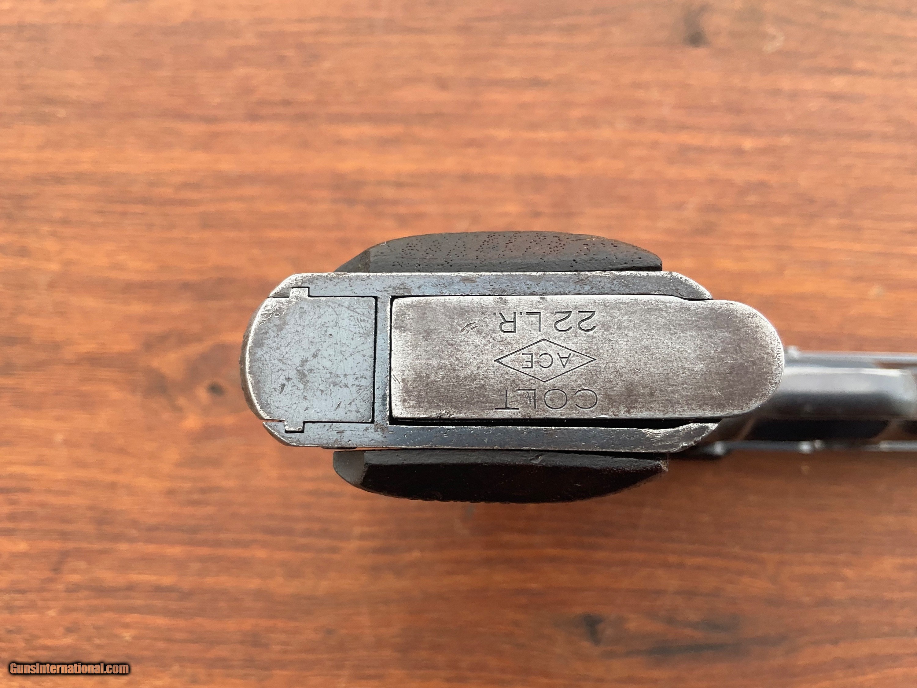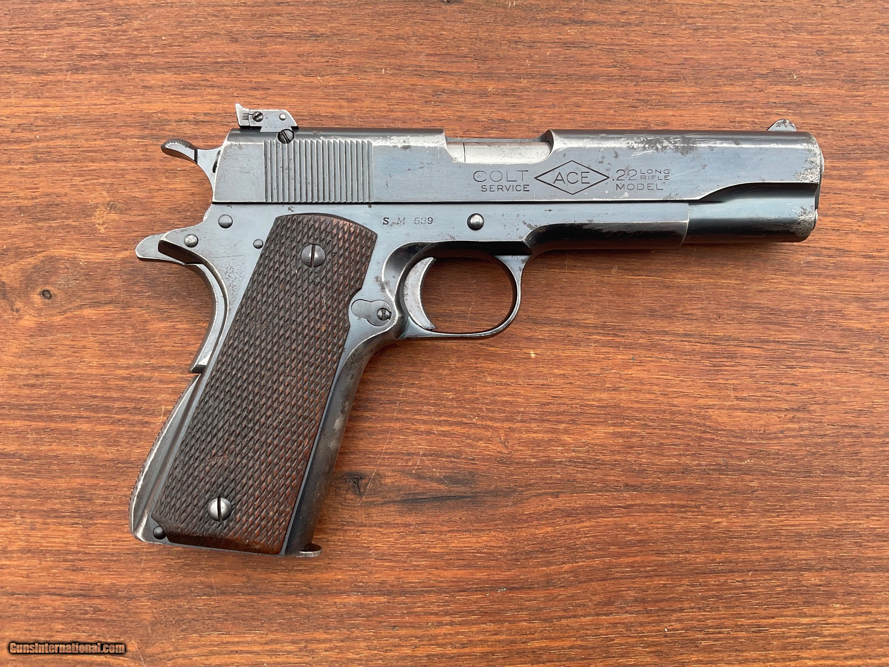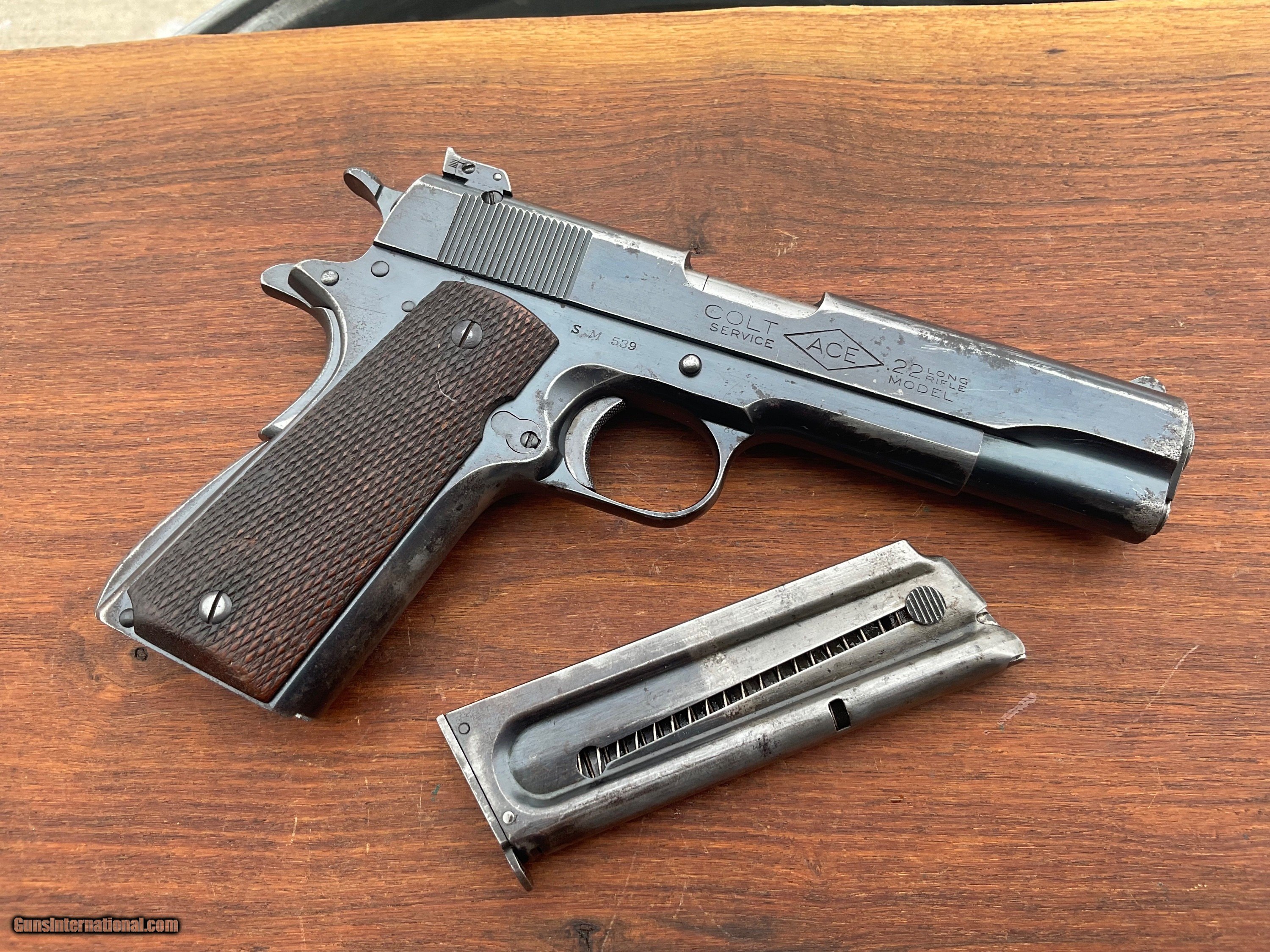 Description: Offered for sale is a fair example of a very hard to find pistol, the Colt Service Model Ace. This model was the most expensive pistol that Colt sold costing about $60, that's $20 more than a .45 at the time. They had hand honed match grade actions and were equal to the National Match and Super Match's. The early guns like this one had a unique roll mark which was essentially the standard ACE roll mark with the words "Service" and "Model" added. At around SN SM 700 the model got its own roll markings. First model Service Aces like this are very rare. Most were shipped to the US Military. Many were known to have been issued to the US Navy and are certainly lost at sea during WW2. This pistol is one of the only 500 that were shipped commercially. Factory letter is on order and will show commercial shipment in 1938. This example would be a good candidate for a Turnbull quality restoration. The pistol is complete with all original parts, grips, matching serial numbered slide and early correct magazine. A rare gun! Price: $3,699.00 Shipping: $45.00 Contact Seller |