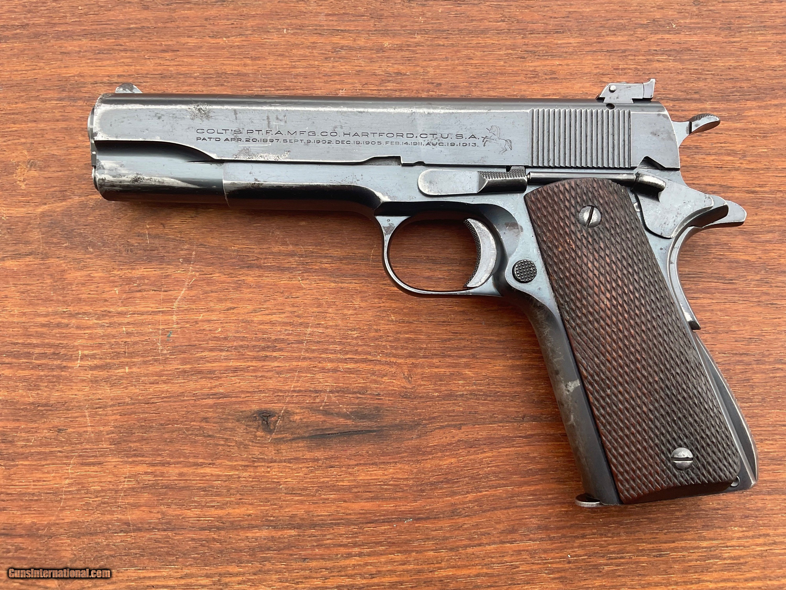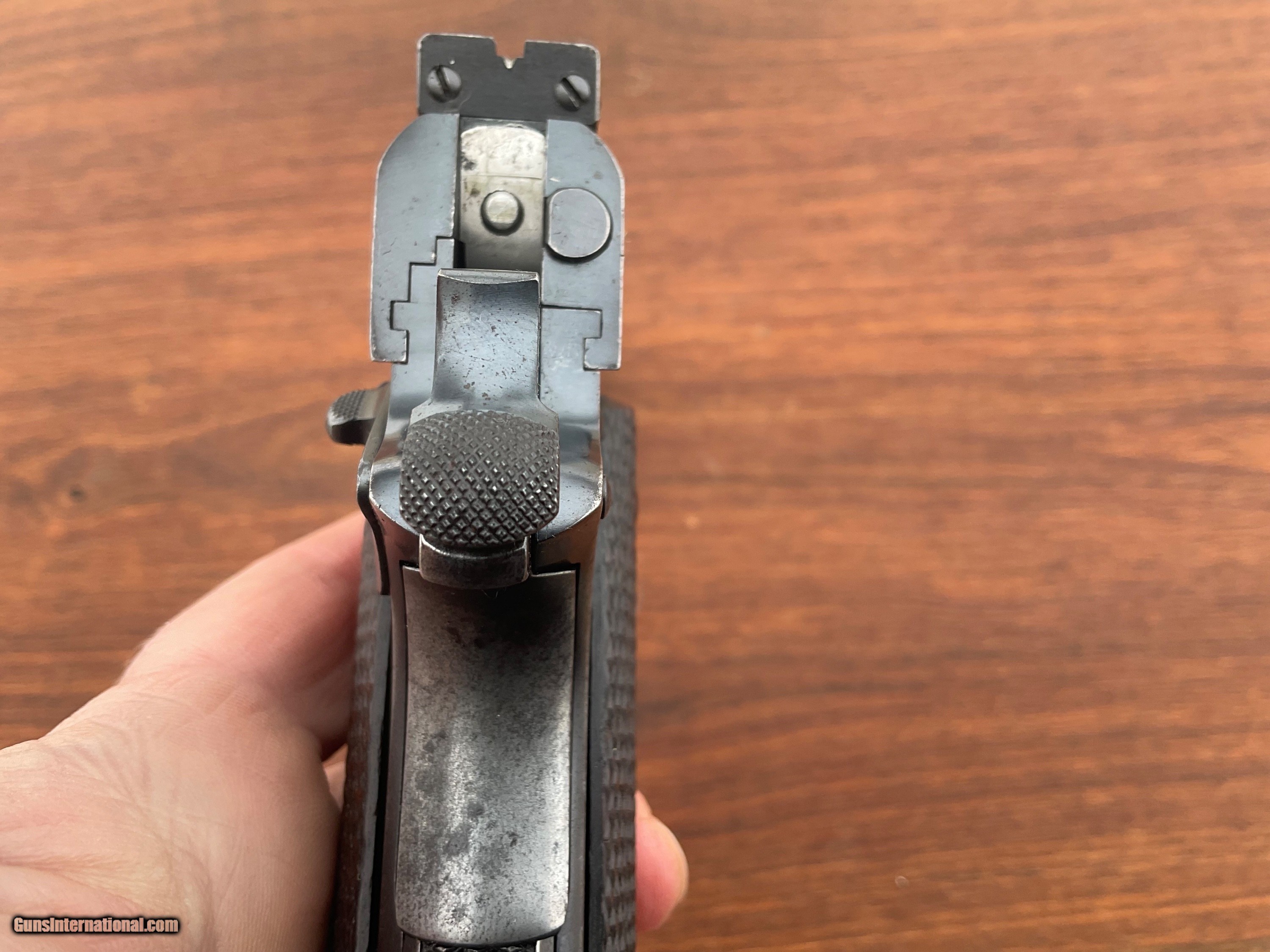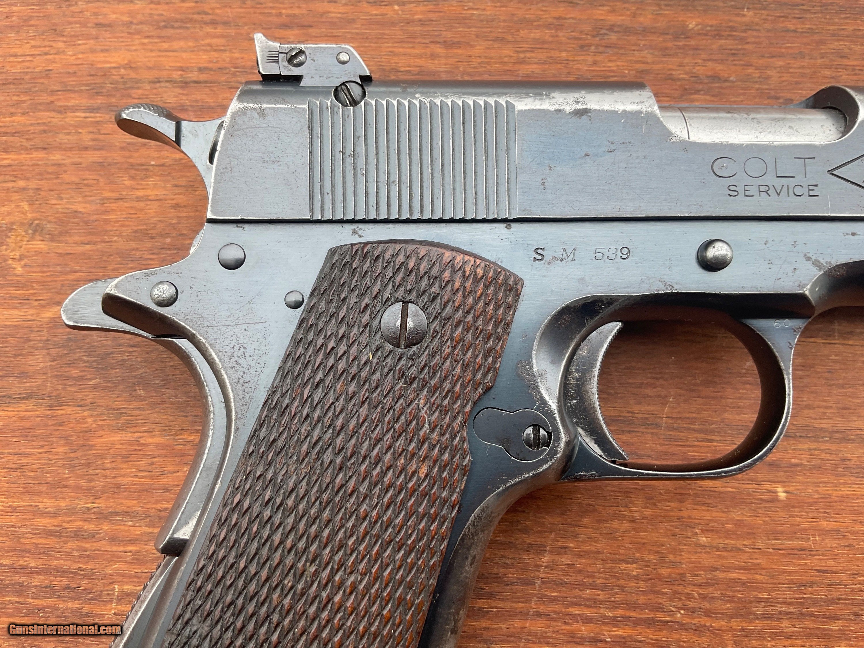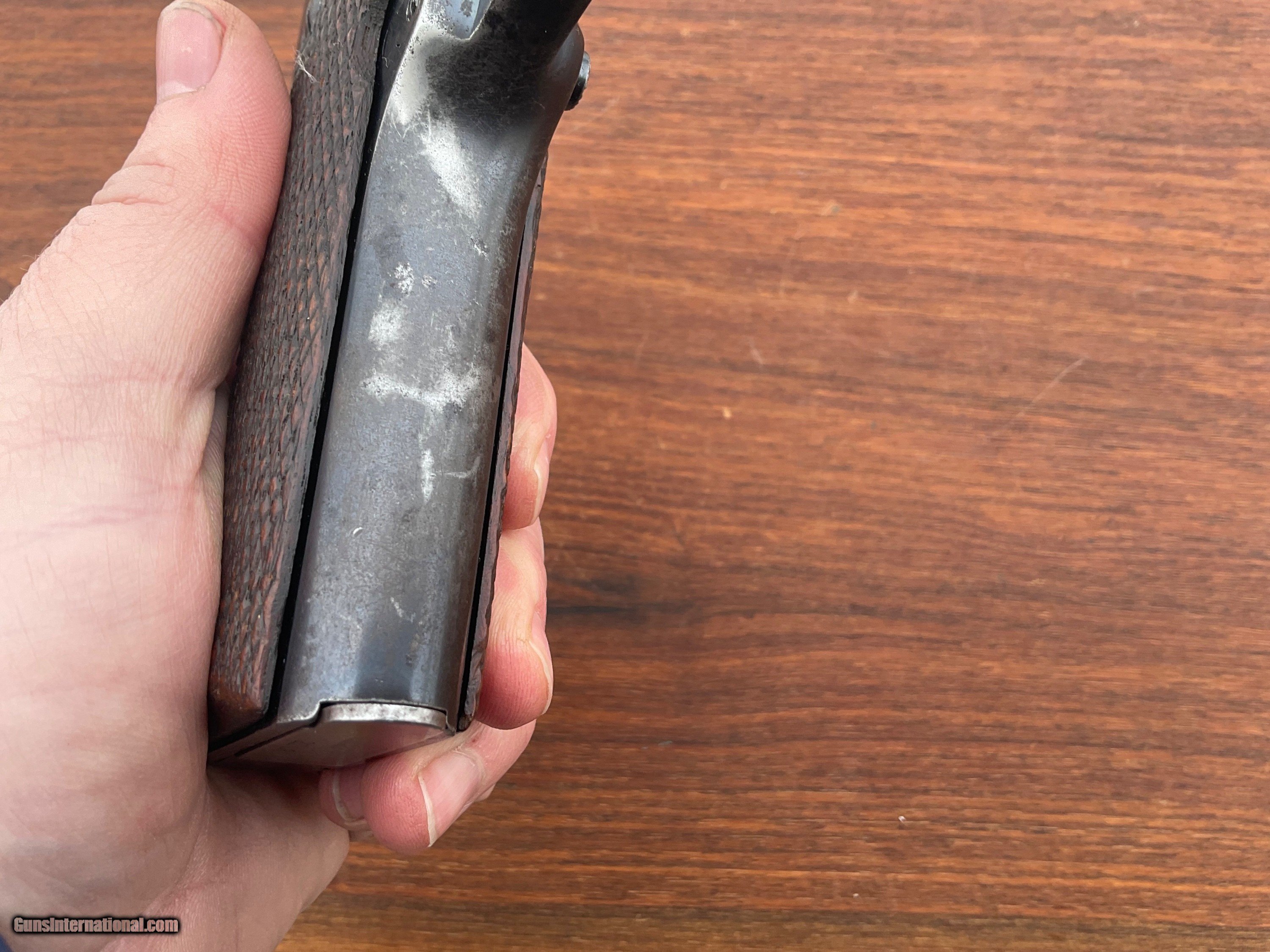 Description: Offered for sale is a fair example of a very hard to find pistol, the Colt Service Model Ace. This model was the most expensive pistol that Colt sold costing about $60, that's $20 more than a .45 at the time. They had hand honed match grade actions and were equal to the National Match and Super Match's. The early guns like this one had a unique roll mark which was essentially the standard ACE roll mark with the words "Service" and "Model" added. At around SN SM 700 the model got its own roll markings. First model Service Aces like this are very rare. Most were shipped to the US Military. Many were known to have been issued to the US Navy and are certainly lost at sea during WW2. This pistol is one of the only 500 that were shipped commercially. Factory letter is on order and will show commercial shipment in 1938. This example would be a good candidate for a Turnbull quality restoration. The pistol is complete with all original parts, grips, matching serial numbered slide and early correct magazine. A rare gun! Price: $3,699.00 Shipping: $45.00 Contact Seller |