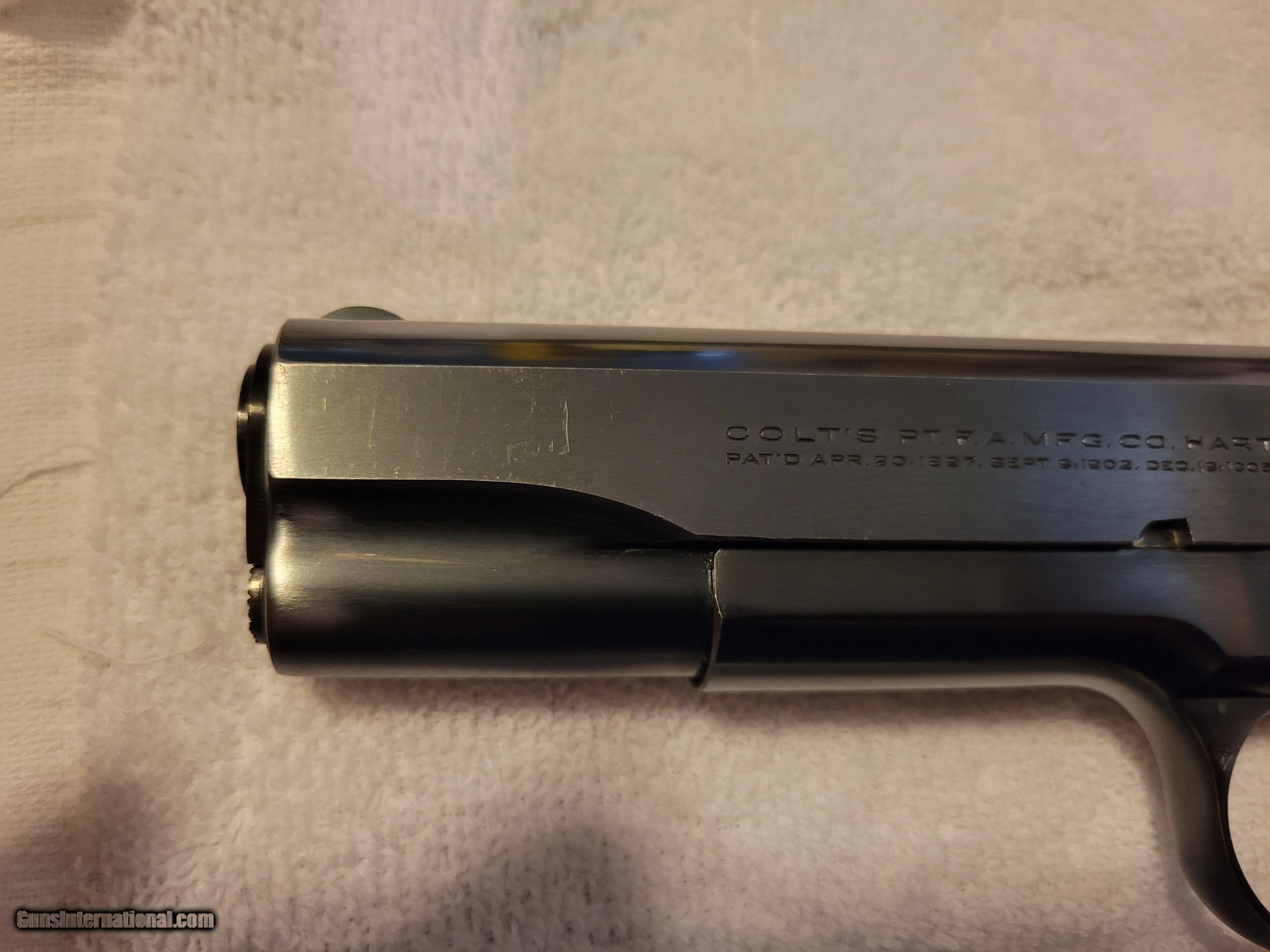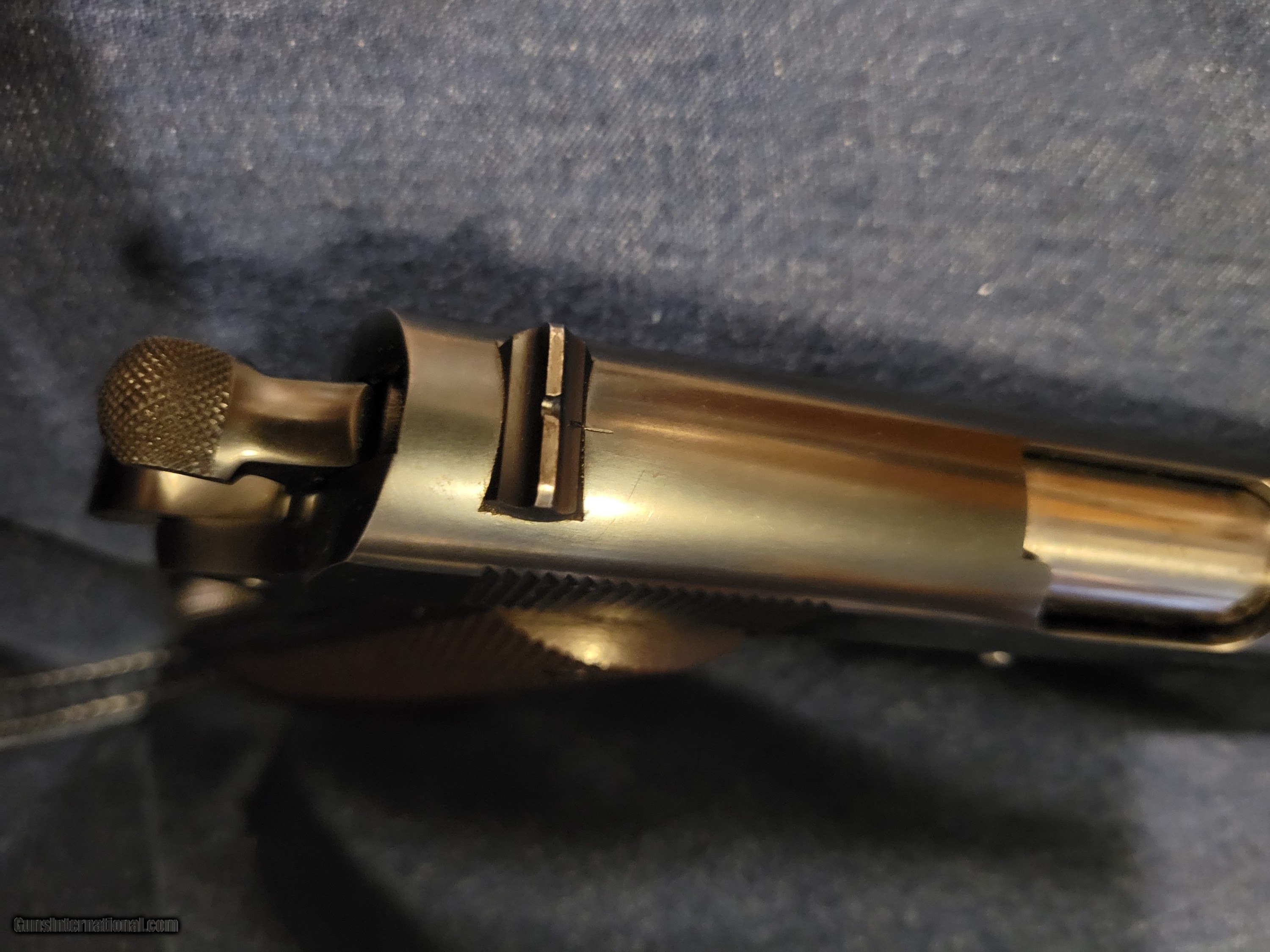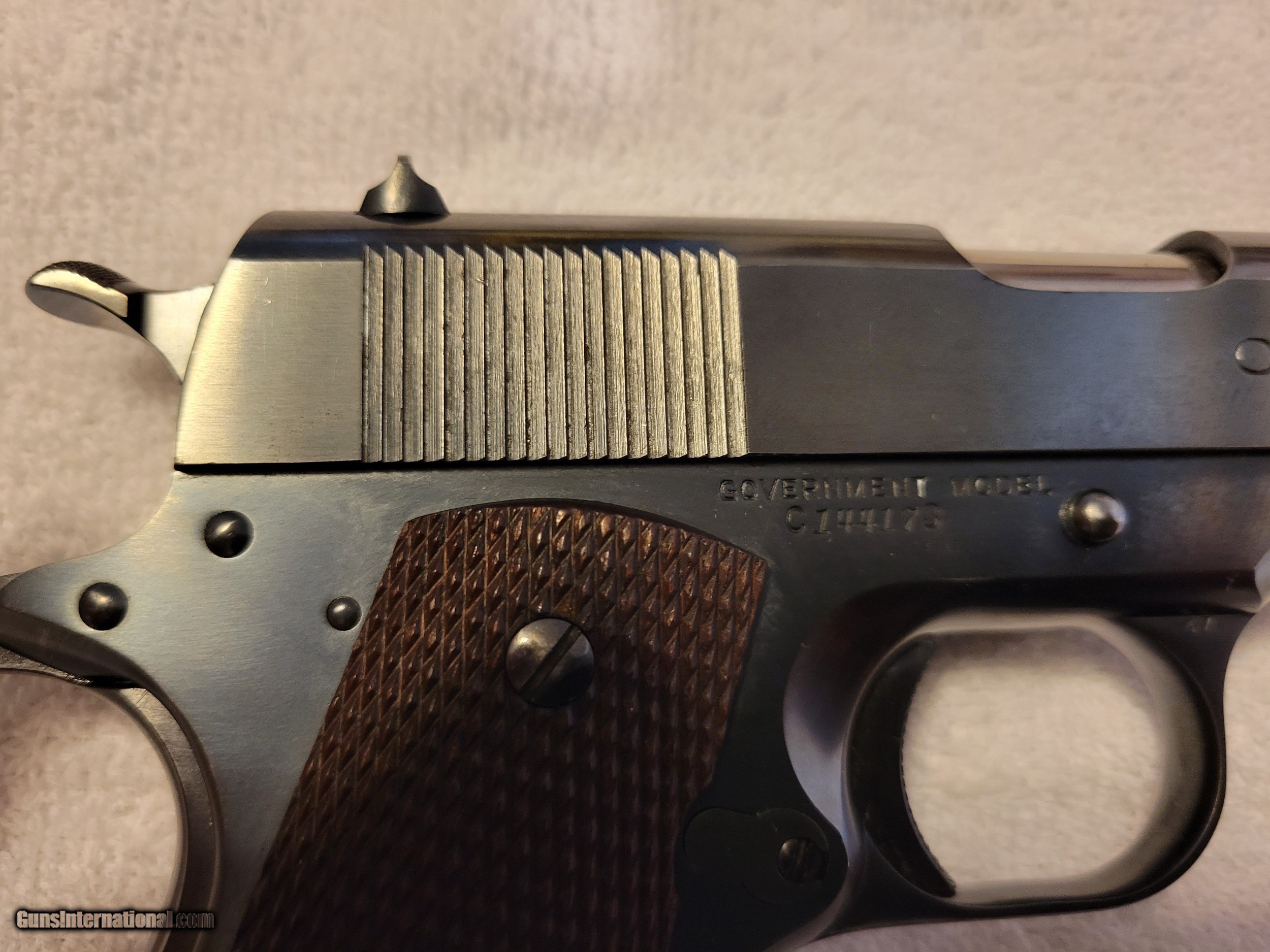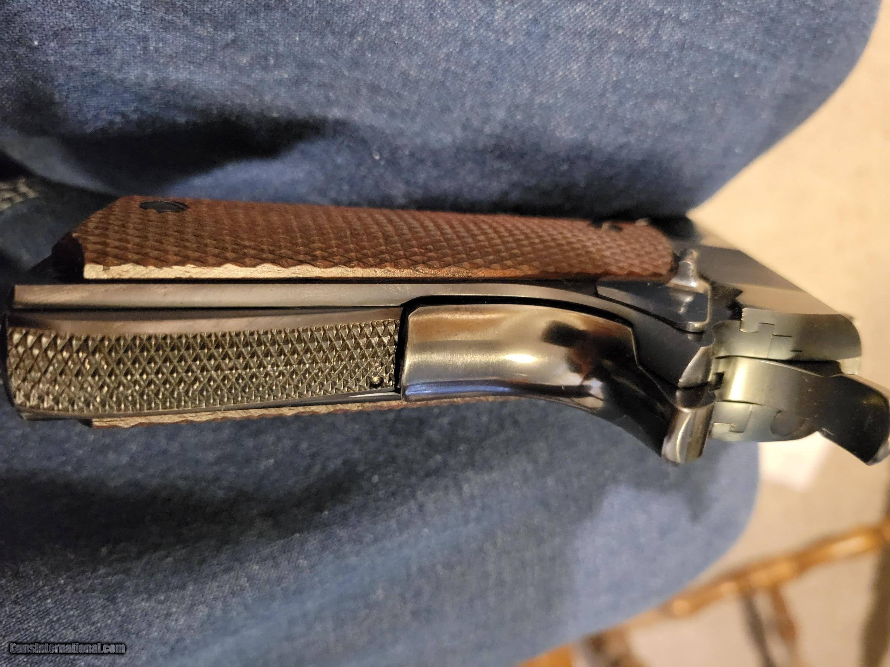 Description: Extremely nice 1911A1 commercial. 45 ACP This colt did not see much use. The blue is excellent with several minor imperfections. No rusted or pitted areas. There is a scuffed area on right side of slide below colt logo. The grips are excellent. Bore is excellent. Circa 1925 SOLD |