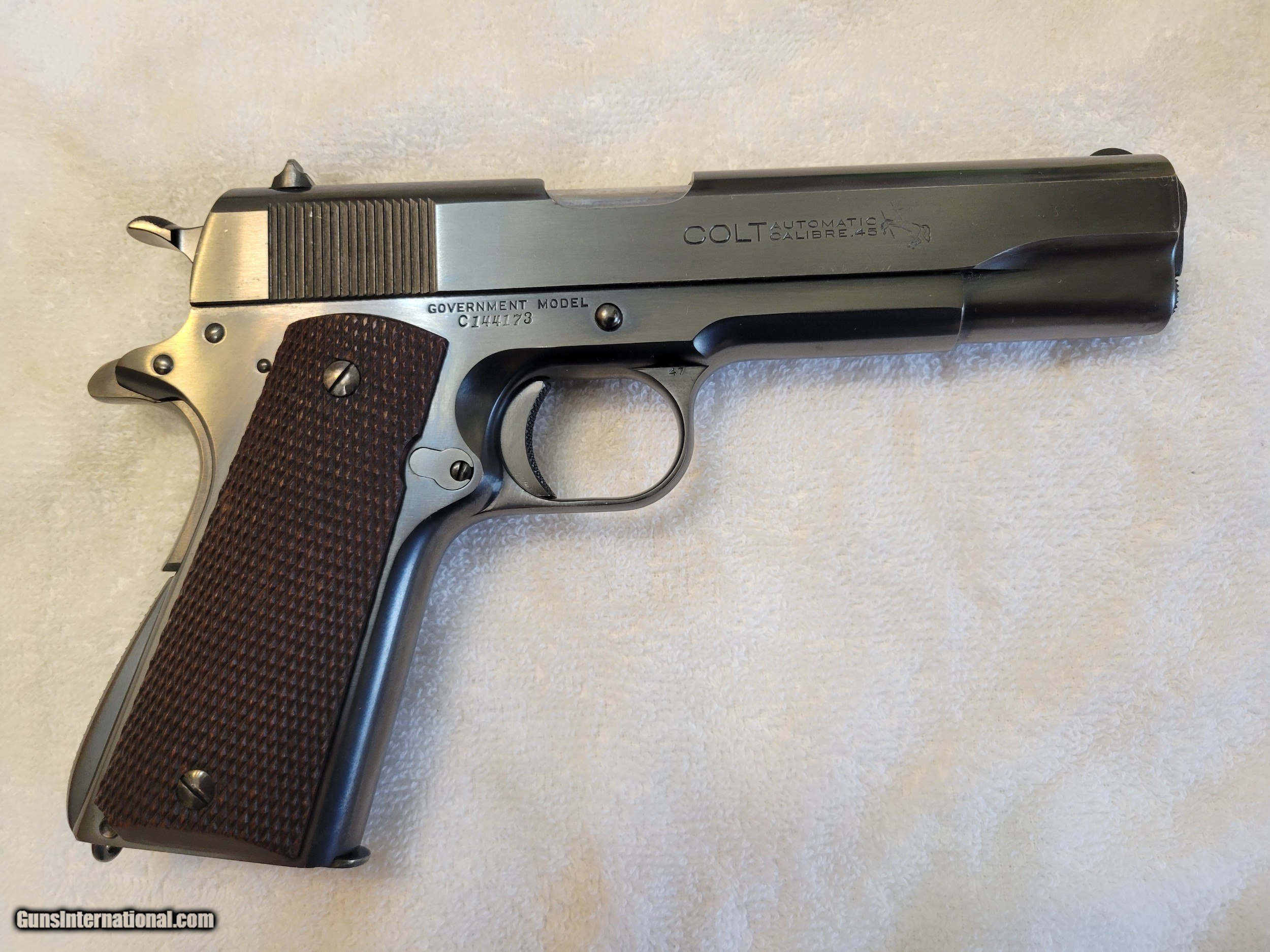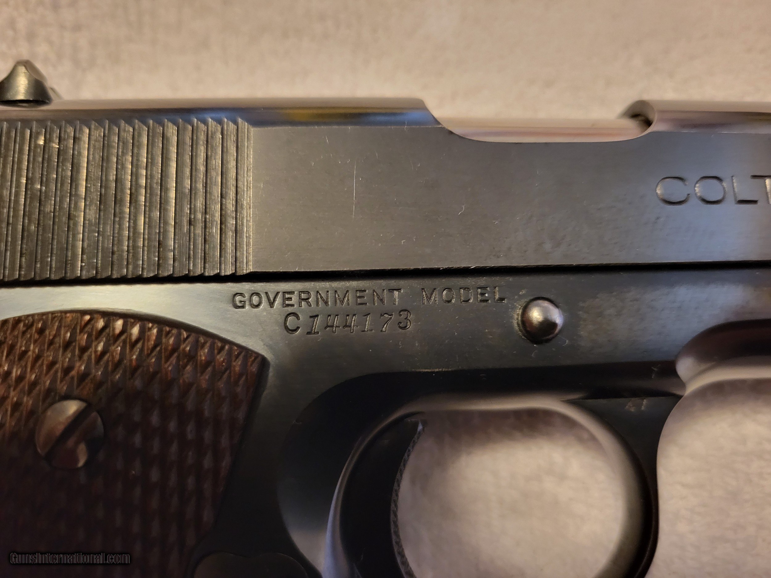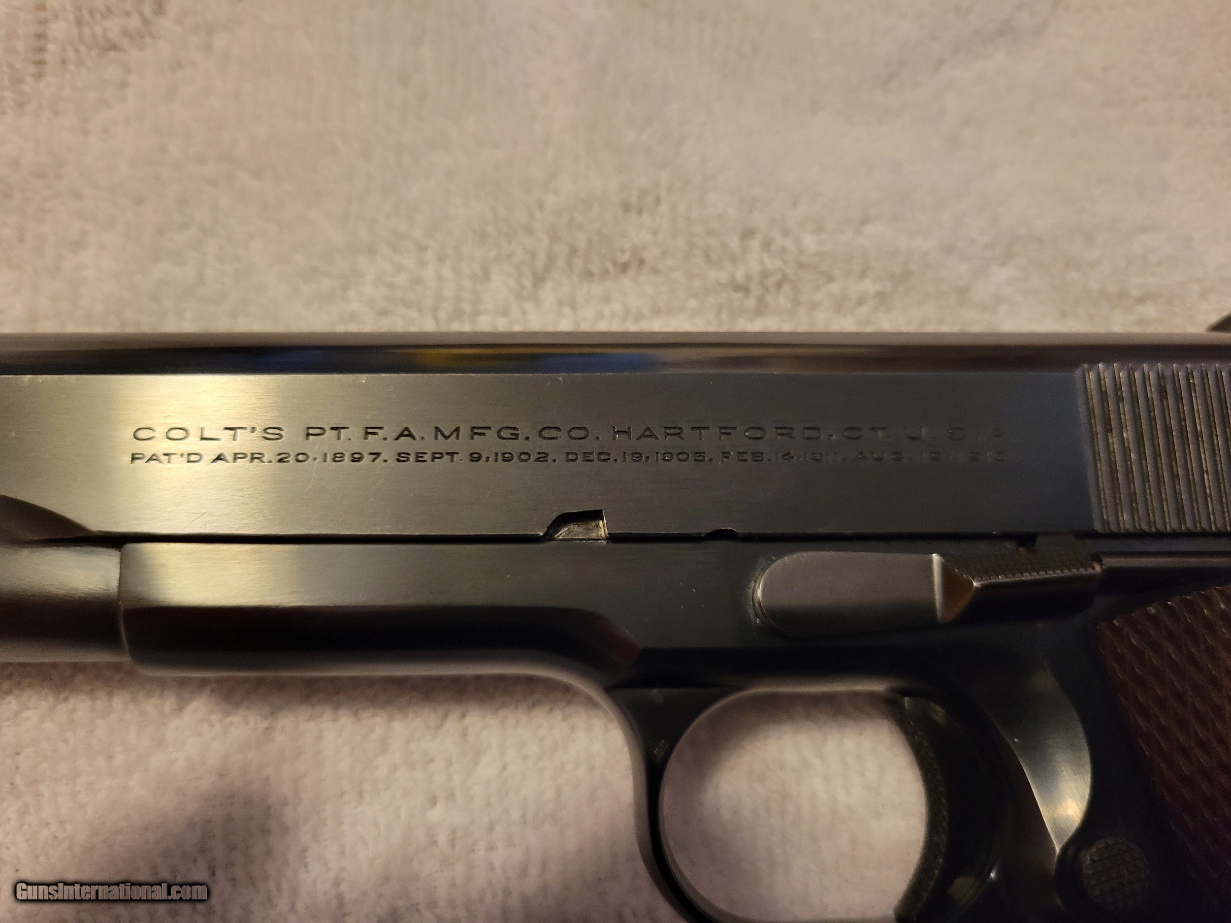 Description: Extremely nice 1911A1 commercial. 45 ACP This colt did not see much use. The blue is excellent with several minor imperfections. No rusted or pitted areas. There is a scuffed area on right side of slide below colt logo. The grips are excellent. Bore is excellent. Circa 1925 SOLD |