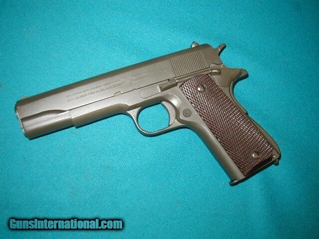 Description: THIS IS A MINTY COLT 1911 A1 MFD . IN 1941, R.S. INSECTED. IT IS IN 99% ORIGINAL CONDITION WTH A BEAUTIFUL GREEN COLT FACTORY PHOSPHATE FINISH. SHARP AND CRISP THROUGH OUT WITH A CORRECT SMALL "G" COLT BARREL WITH EXCELLENT BORE. MATCHING SLIDE, HOLLOW BACK GRIPS . GUN LOOKS TEST FIRED ONLY. COMES IN A CORRECT NUMBERED BOX WITH EXTRA MAG. Curio/Relic: Yes Price: $7,350.00 Shipping: $50.00 Contact Seller |