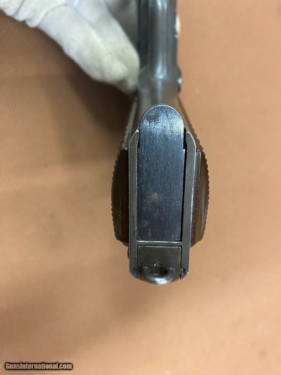 Description: ***SOLD*** Super a nice All Original, WWII Colt 1911A1 U.S Property, 45 auto! This Colt was made in 1945 and shipped to Transportation Officer, Springfield Armory on May 31st, 1945 (one of 2,700 guns in that shipment). It's marked G.H.D for Guy H. Drewry, Brig. General inspector mark. Correct barrel, marked with a "P" on left side of barrel lug, and the proper "C" within a square on right hand side of barrel lug. Good bore condition, with a little frostiness but strong and sharp rifling. "Crossed cannon" final inspection appropriately marked on left side of receiver. Bullet ramp correctly finished (parkerized), as expected on Colts produced after 1944! It comes with WWII Colt magazine made by Risdon (Thus marked with a "R" on top of bottom lip). also in very good condition!. No serial number under the firing plate, as expected, since they stopped this practice between serial numbers 1140000 and 1145000. All correct small parts (Correct short hammer and stamped checkered trigger, grooved slide stop, checkered safety lock, grooved mainspring housing with 7 ribs, etc...). Original correct Coltwood plastic stocks with mold numbers, wide rings, and strengthening ribs, in excellent condition! The action on this pistol is super crisp and it operates flawlessly! Overall, a beautiful example of a historic WWII tested Colt 1911A1! This piece is in great condition, as the pictures clearly show! Buy with Confidence! These WWII Colts are getting harder and harder to find, Don't miss out on this one! Shipping with insurance will be $75 to Continental US ONLY (AK & HI extra). No shipping to California. Personal Checks will be held till funds clear (usually 3-5 business days). Cashiers checks and USPS Money Orders same as cash! SOLD Handgun Caliber: .45 ACP (.45 Auto) |