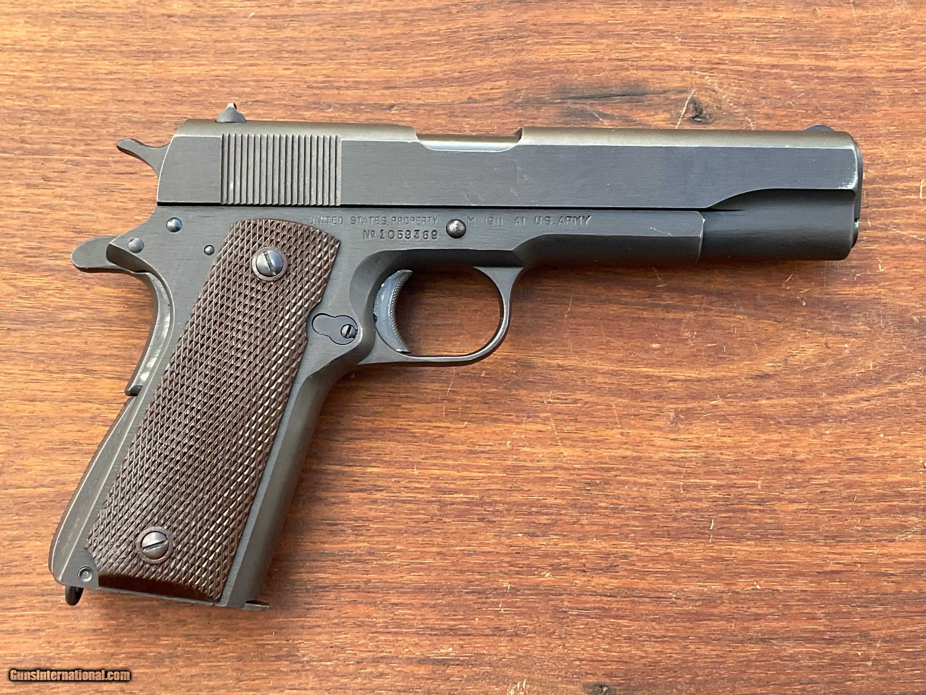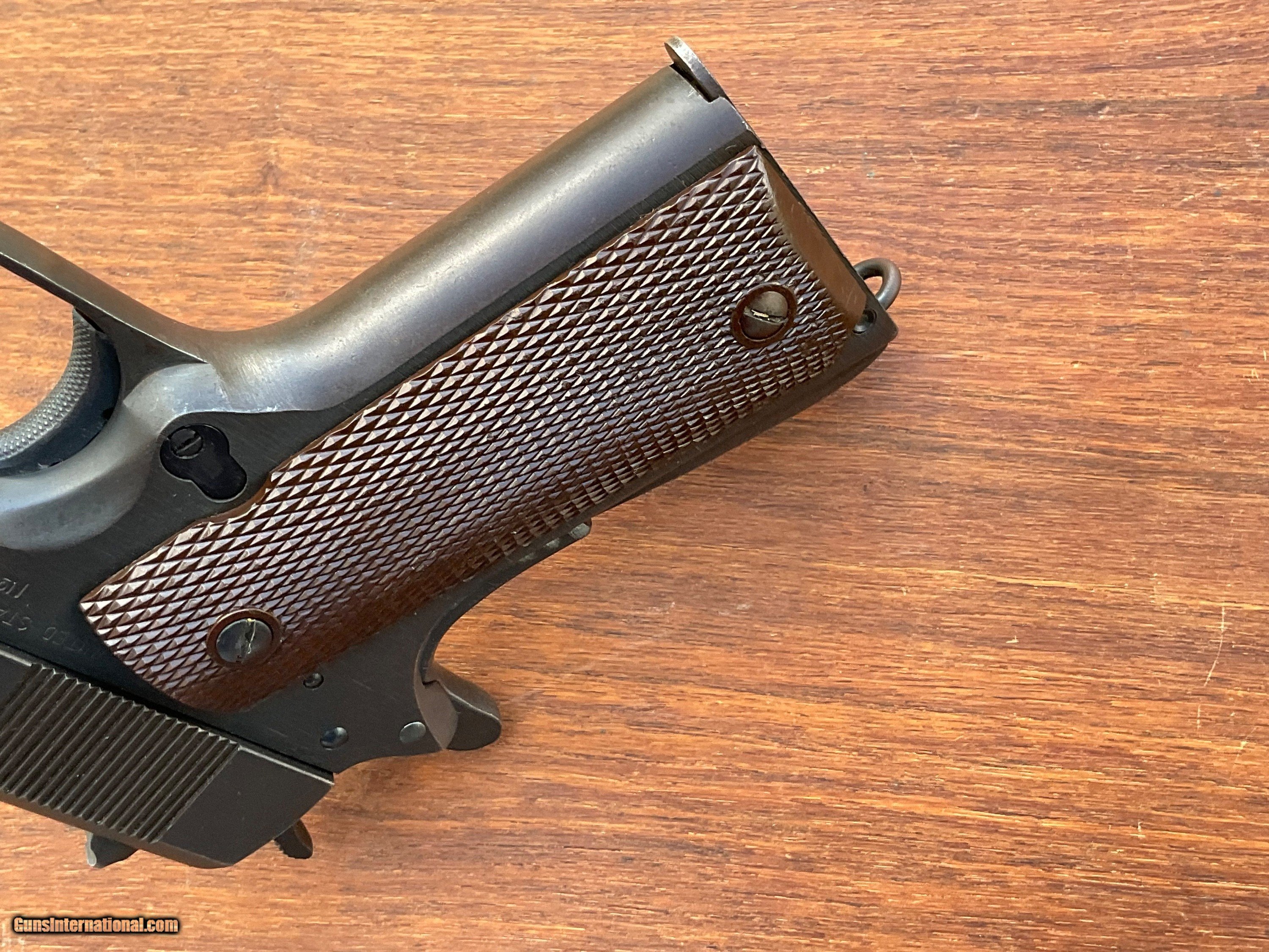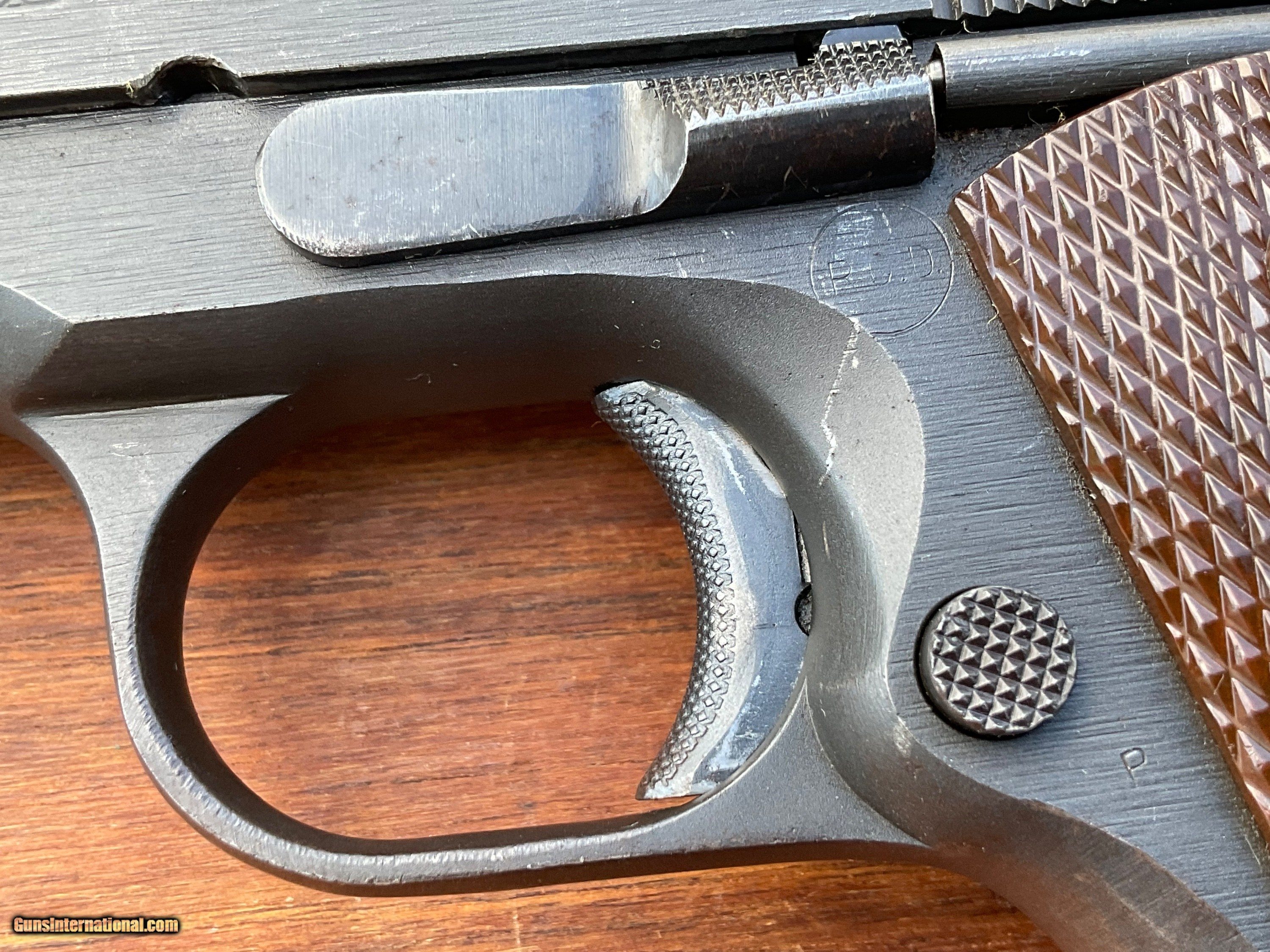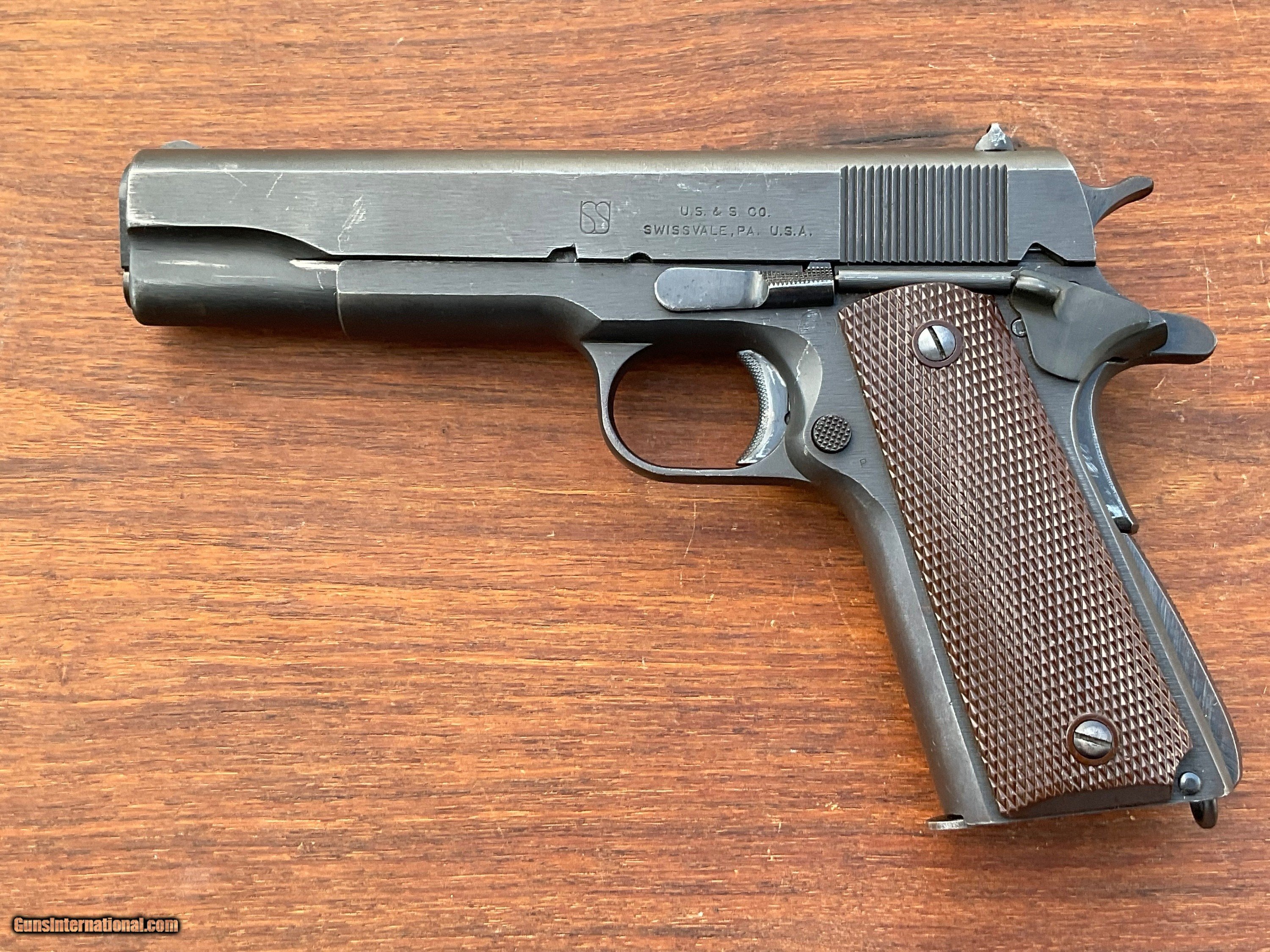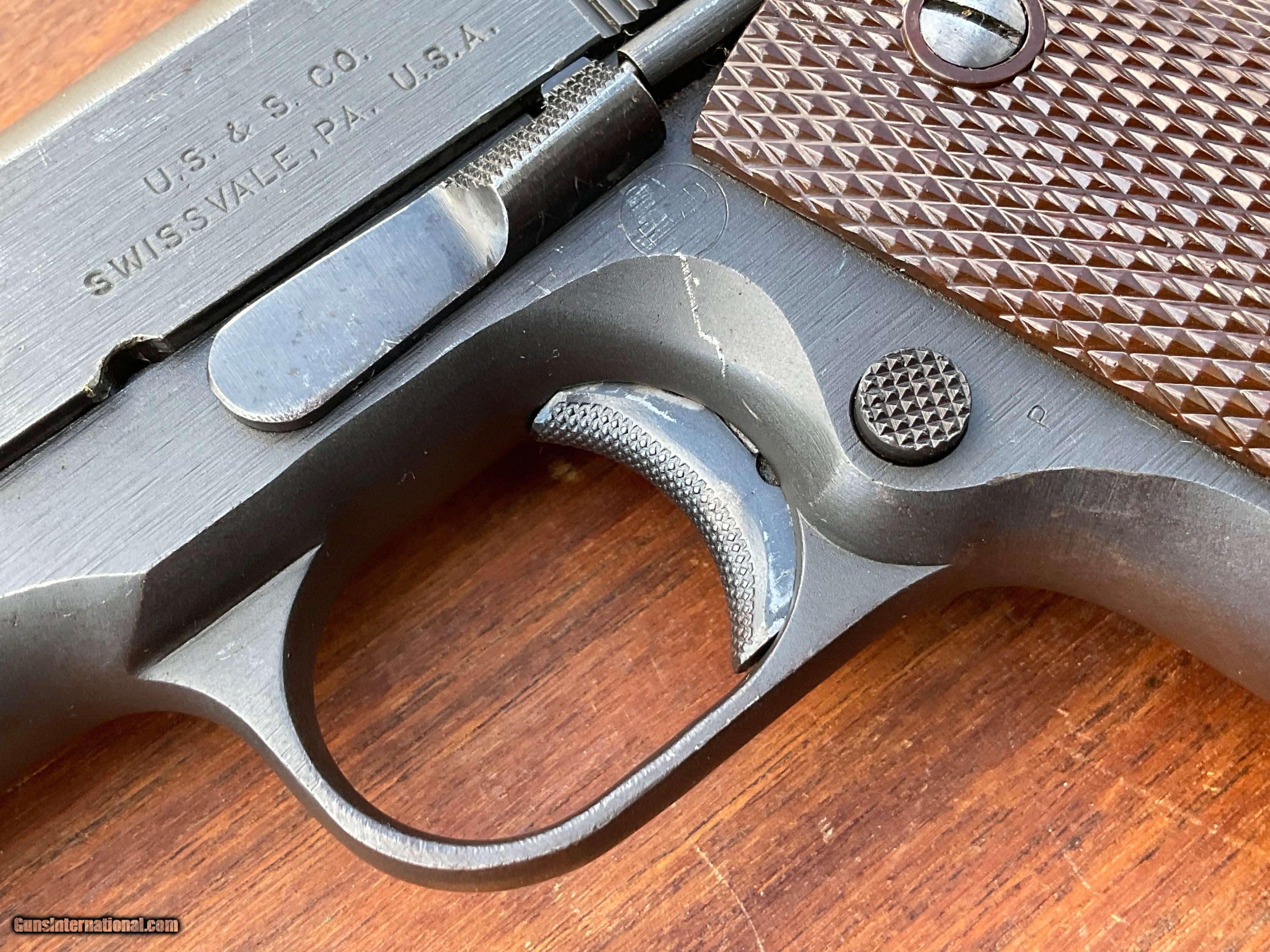 Description: Offered for sale this week is a nice original example of the Union Switch and Signal M1911A1 pistol. Dulite blue finish. Proper High Standard Barrel marked "HS" and the barrel bushing has the proper concentric rings. Blued stamped trigger and milled white feed ramp. An honest gun with some use and and minor patina. P marks on the slide and frame also match as this is one of the first guns to recieve the P inspection. Magazine is an early war pinned base full blued mag marked with a "R" for Risdon on the toe. Curio/Relic: Yes Price: $7,999.00 Shipping: $25.00 Contact Seller |