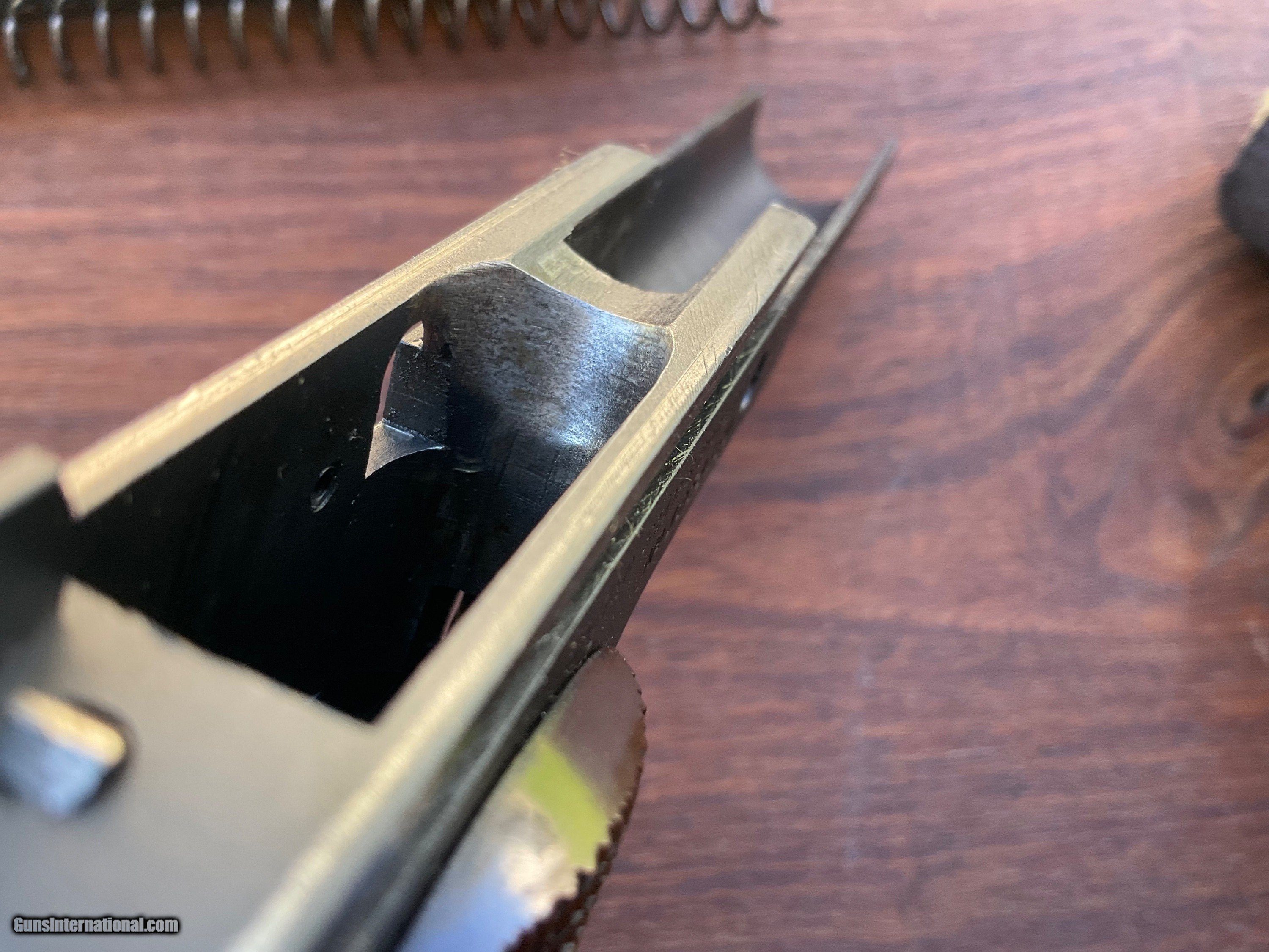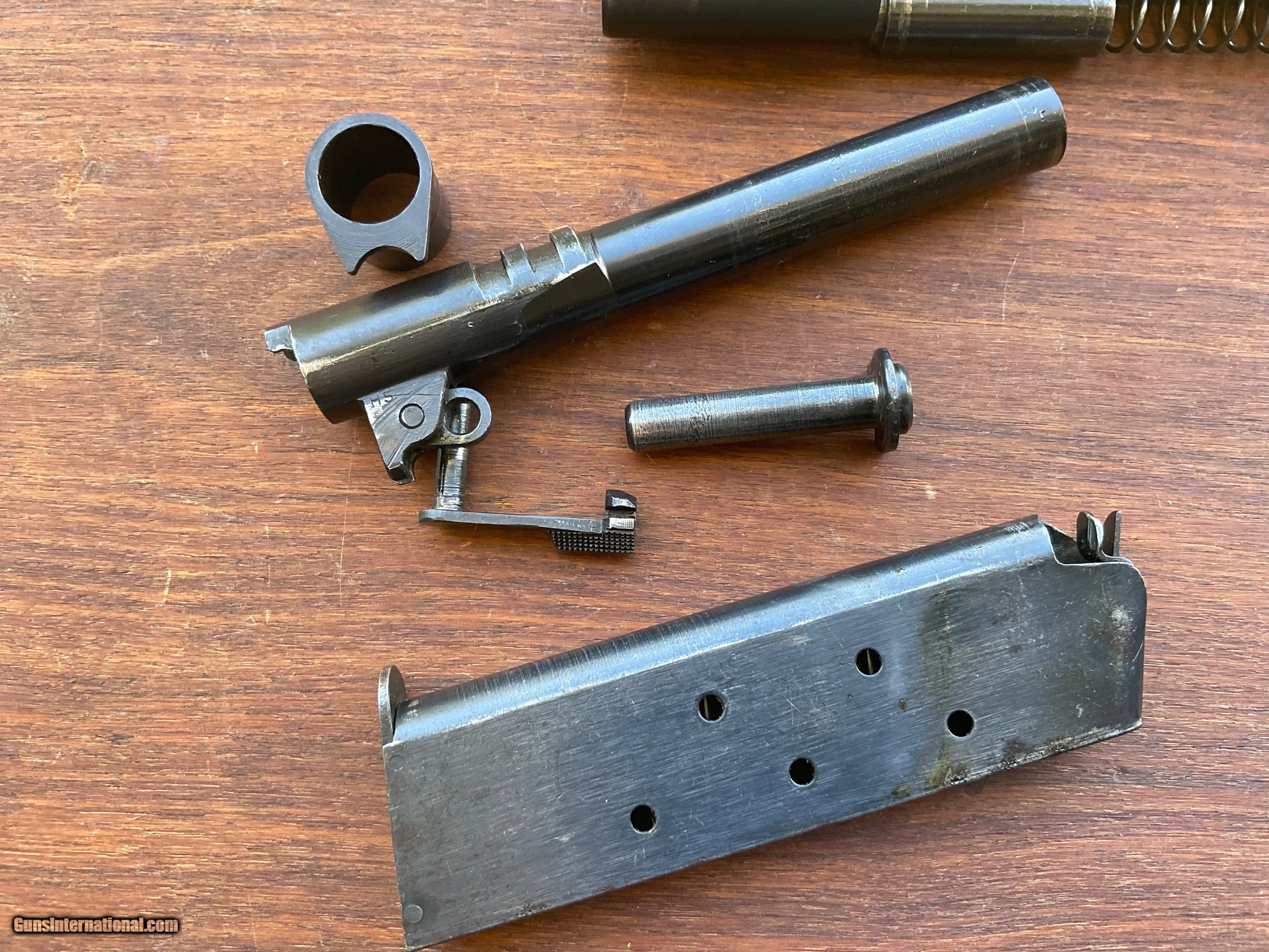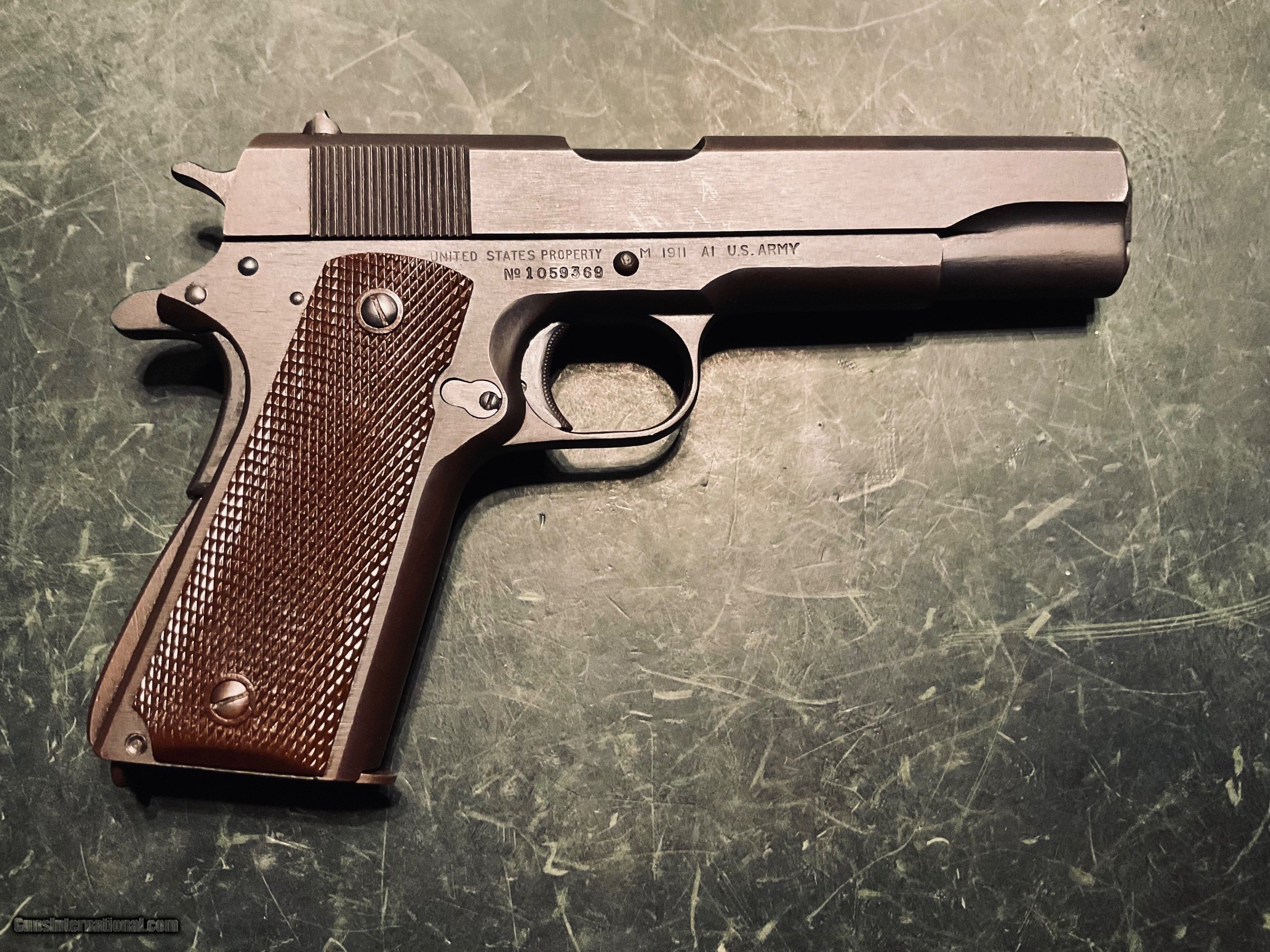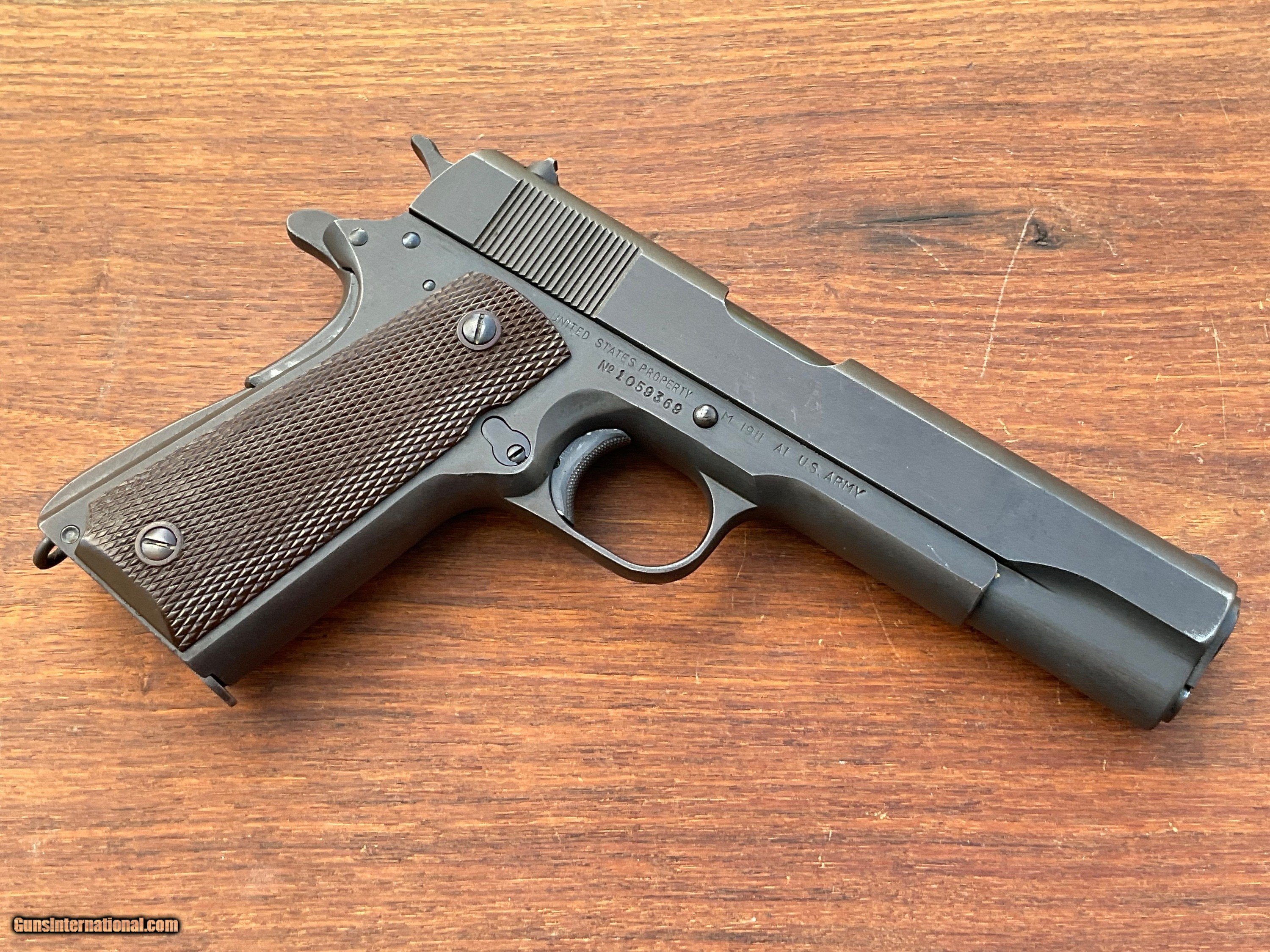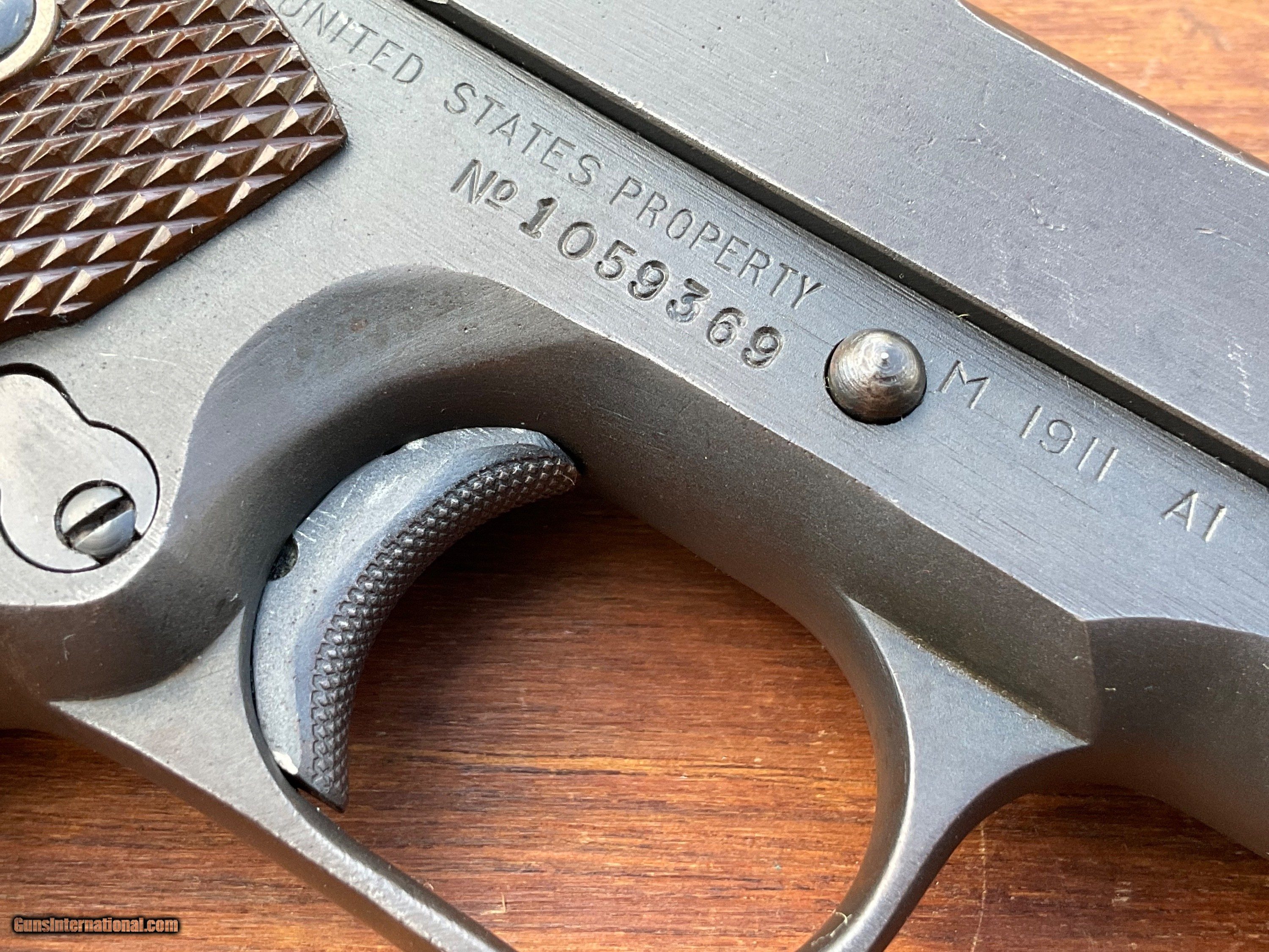 Description: Offered for sale this week is a nice original example of the Union Switch and Signal M1911A1 pistol. Dulite blue finish. Proper High Standard Barrel marked "HS" and the barrel bushing has the proper concentric rings. Blued stamped trigger and milled white feed ramp. An honest gun with some use and and minor patina. P marks on the slide and frame also match as this is one of the first guns to recieve the P inspection. Magazine is an early war pinned base full blued mag marked with a "R" for Risdon on the toe. Curio/Relic: Yes Price: $7,999.00 Shipping: $25.00 Contact Seller |