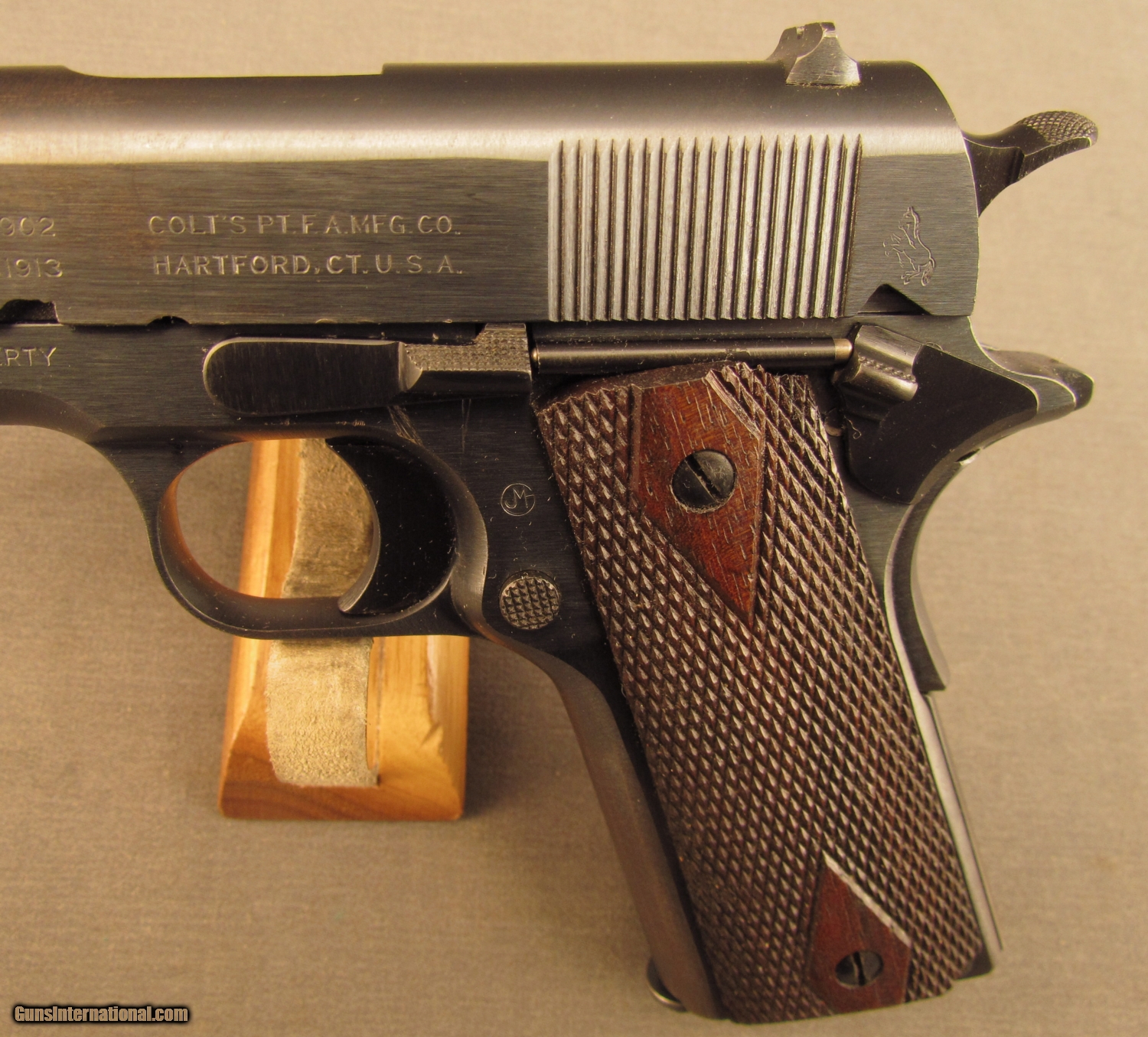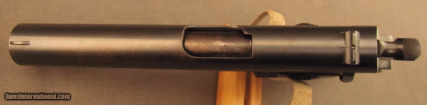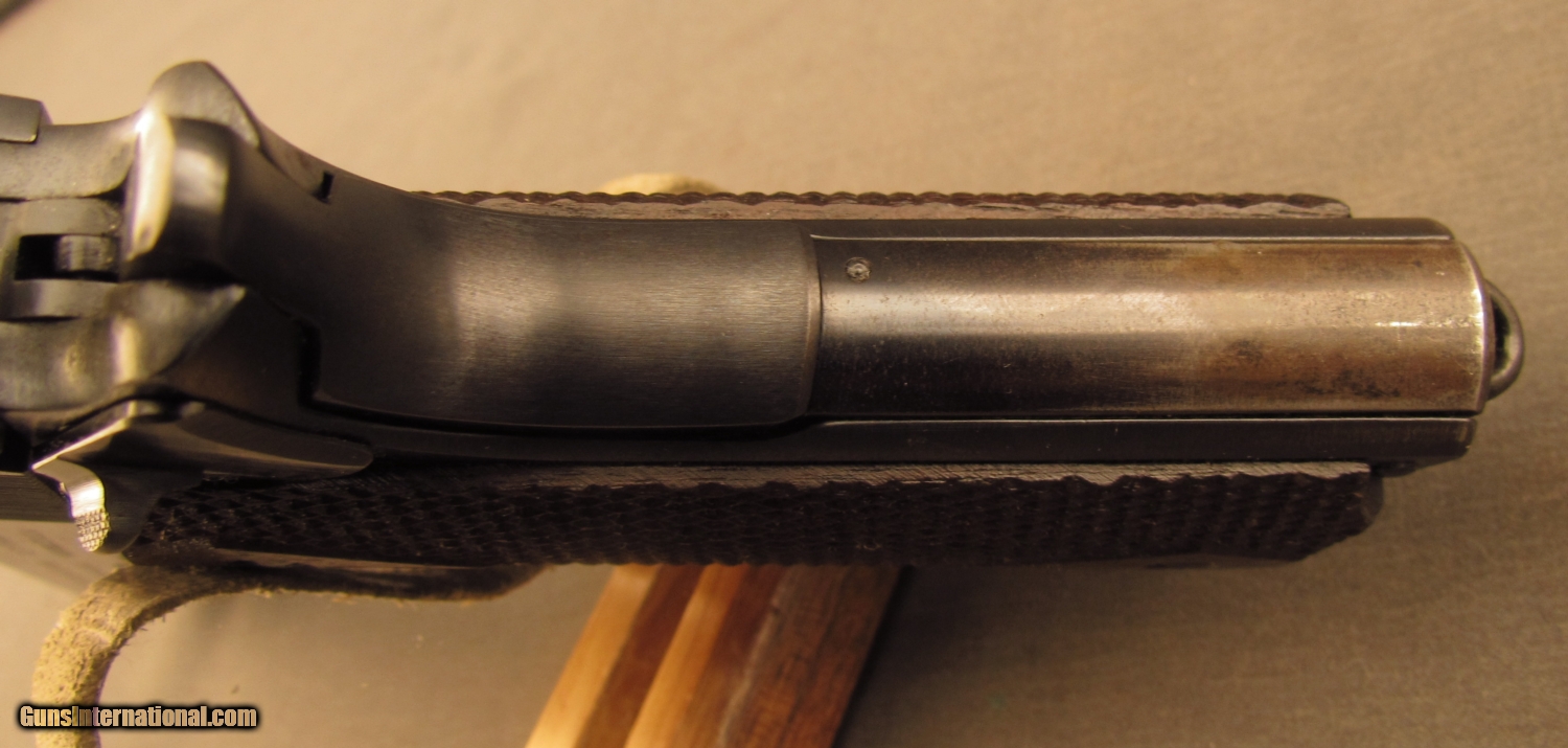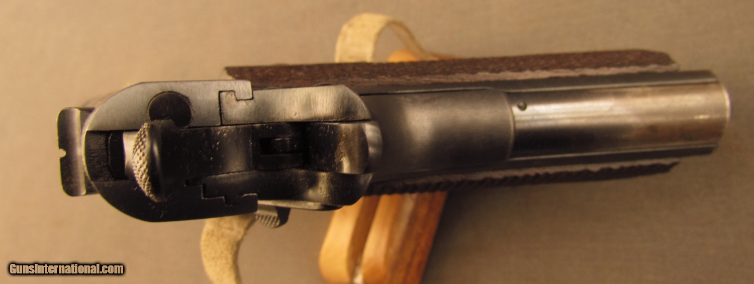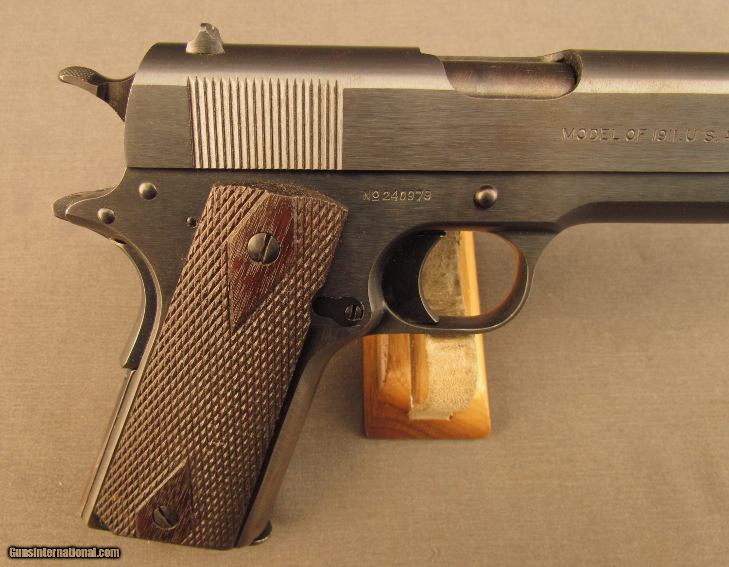 Description: Here is a survivor. Serial #240979, .45 ACP, 5” barrel with an excellent, bright bore. This is a 1918 manufactured pistol that has retained almost all of its original blue finish with only some negligible silvering along a few of the high edges and projections. The only real finish loss occurs on the left side of the frame which has a few small disassembly marks around the slide latch. The checkered walnut double-diamond grips are in fine-excellent shape with only some minor wear on either side and a small amount of flattening to the points. The pistol comes with a single, correct lanyard loop, two-tone magazine that matches the condition of the pistol. Also included is a 2014 dated Colt factory letter that lists this gun as being one of 3,800 shipped to Springfield Armory on February 26, 1918. This is an absolutely fantastic 1918-made Model 1911 and would make a great addition to any collection of high grade U.S. military firearms. FFL or C&R SOLD Curio/Relic: Yes Manufacturer: Colt Model: 1911 Serial Number: 240979 Caliber Info: .45 ACP Gauge Info: .45 ACP |