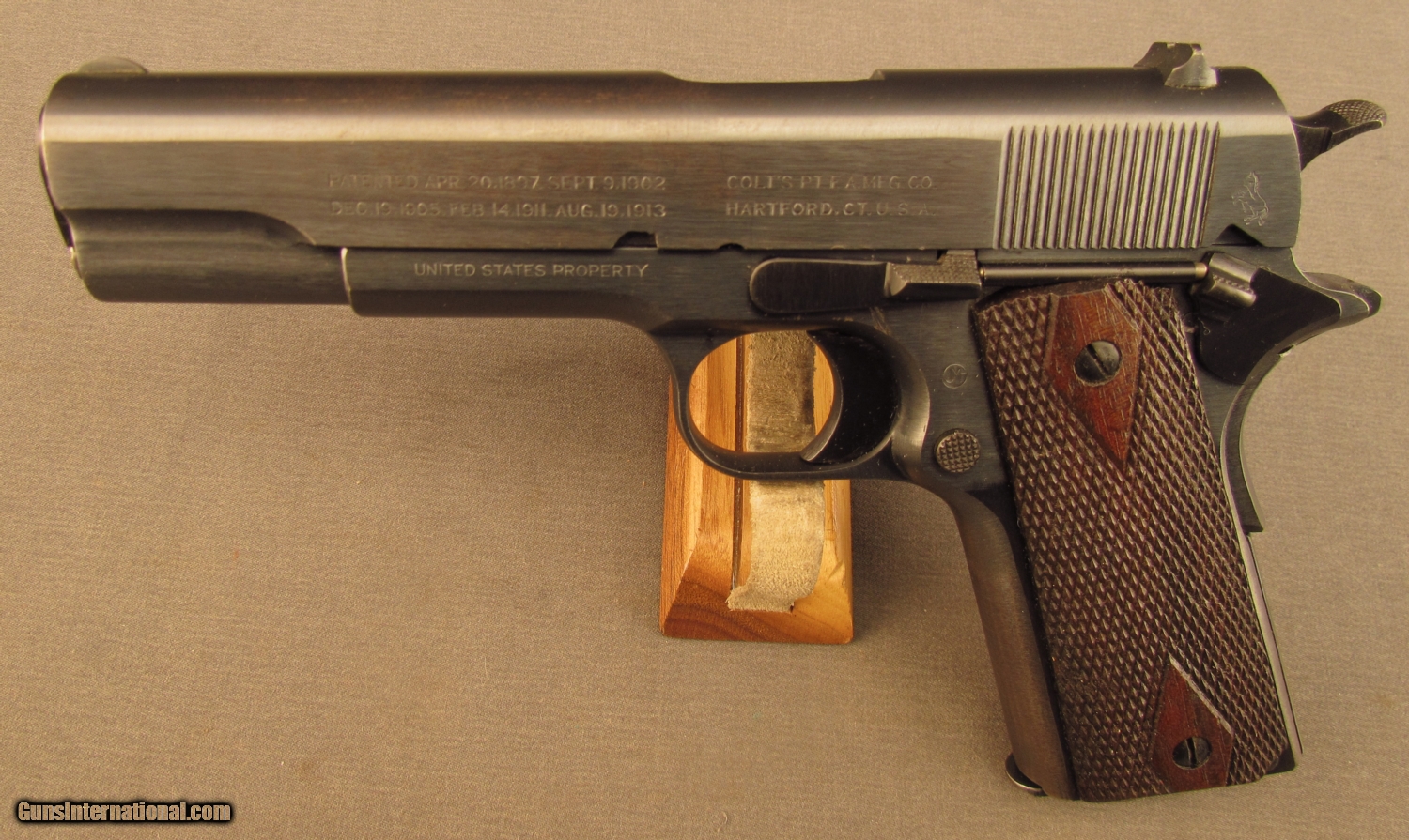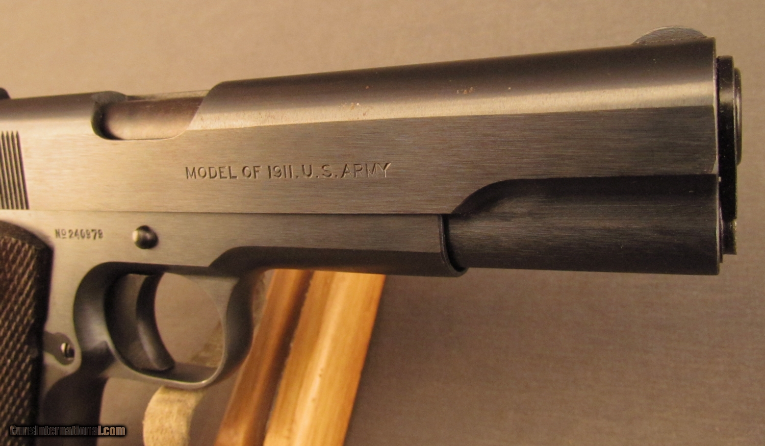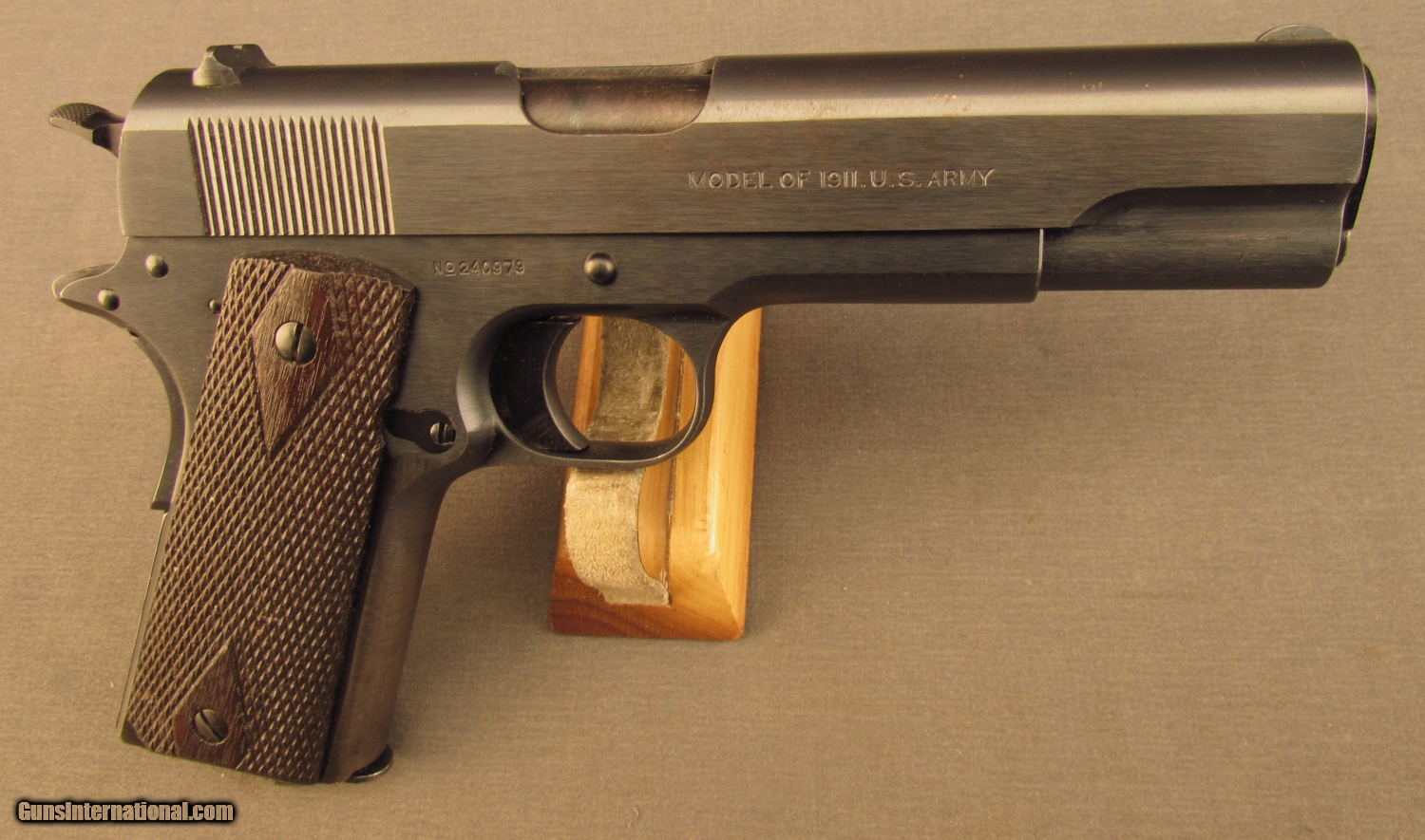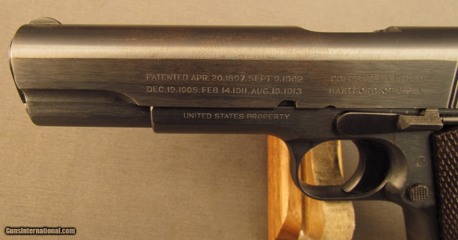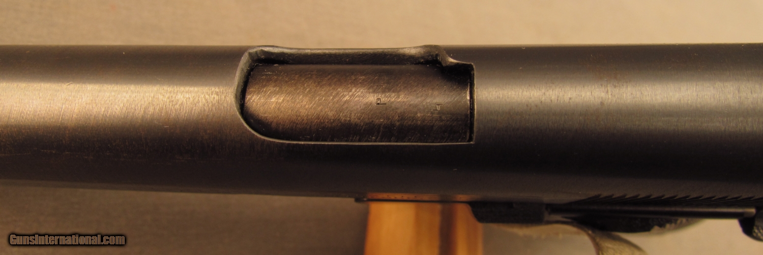 Description: Here is a survivor. Serial #240979, .45 ACP, 5” barrel with an excellent, bright bore. This is a 1918 manufactured pistol that has retained almost all of its original blue finish with only some negligible silvering along a few of the high edges and projections. The only real finish loss occurs on the left side of the frame which has a few small disassembly marks around the slide latch. The checkered walnut double-diamond grips are in fine-excellent shape with only some minor wear on either side and a small amount of flattening to the points. The pistol comes with a single, correct lanyard loop, two-tone magazine that matches the condition of the pistol. Also included is a 2014 dated Colt factory letter that lists this gun as being one of 3,800 shipped to Springfield Armory on February 26, 1918. This is an absolutely fantastic 1918-made Model 1911 and would make a great addition to any collection of high grade U.S. military firearms. FFL or C&R SOLD Curio/Relic: Yes Manufacturer: Colt Model: 1911 Serial Number: 240979 Caliber Info: .45 ACP Gauge Info: .45 ACP |
