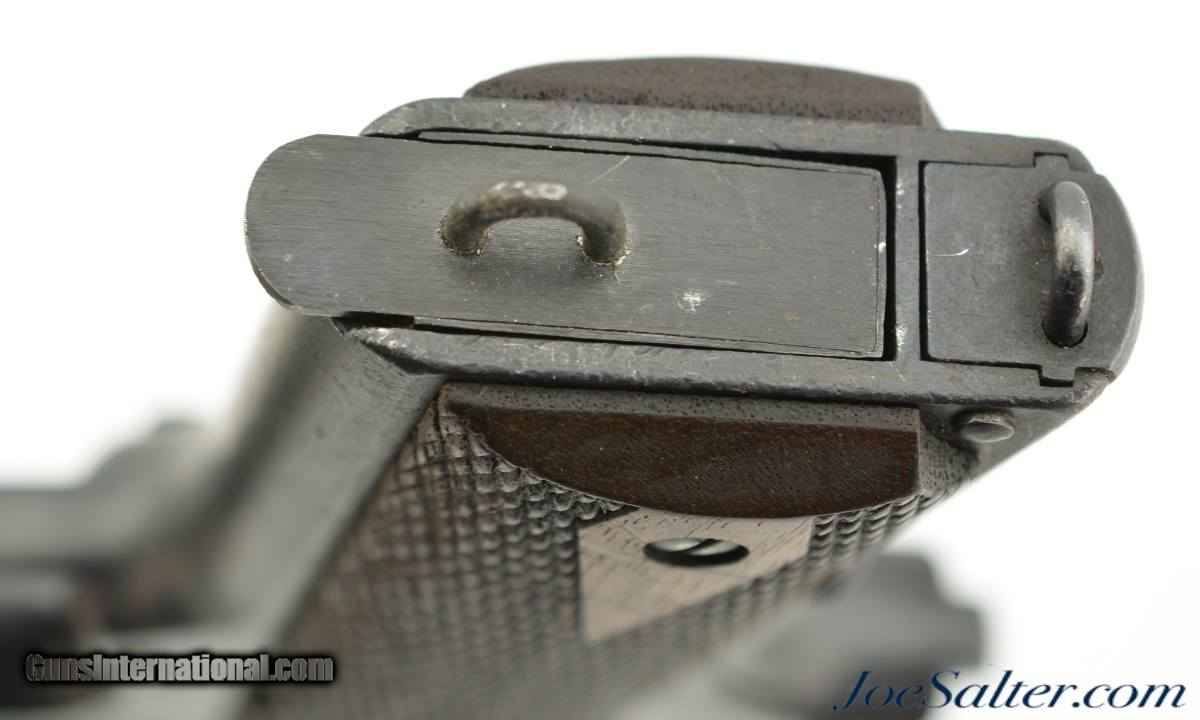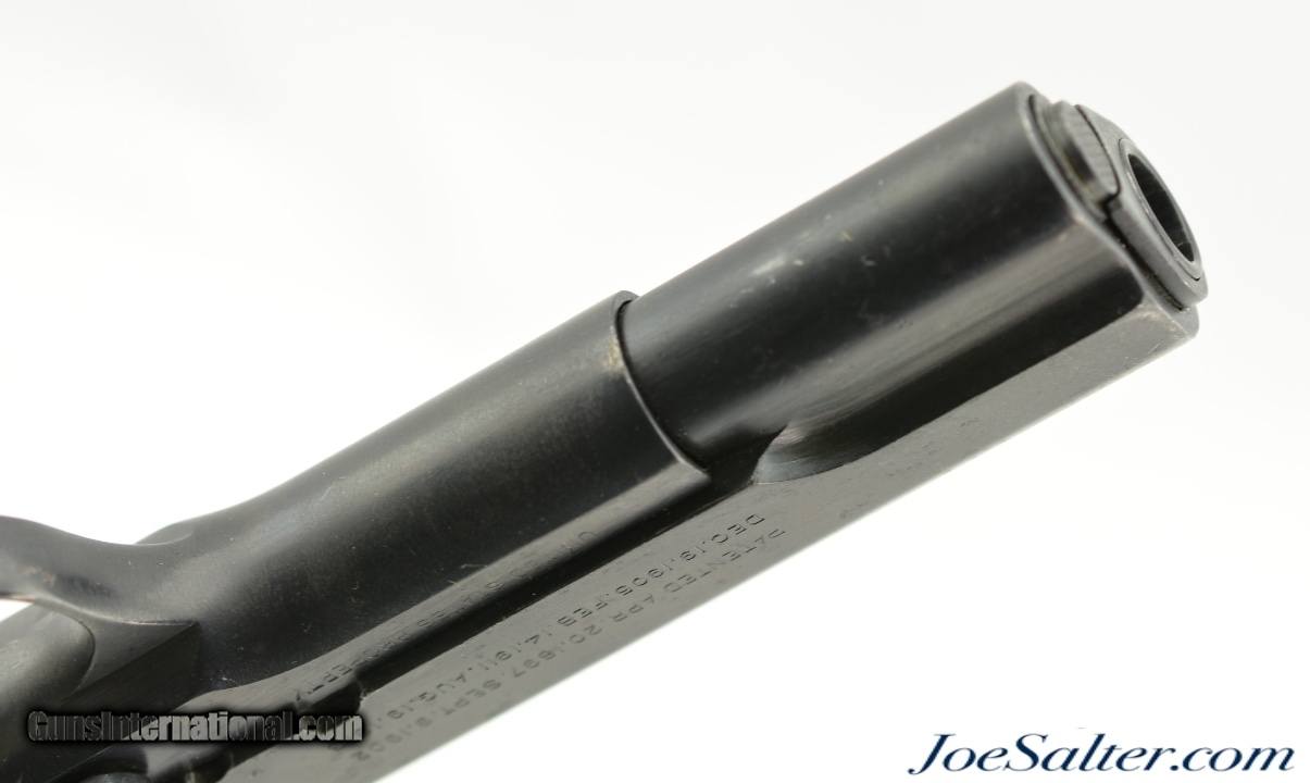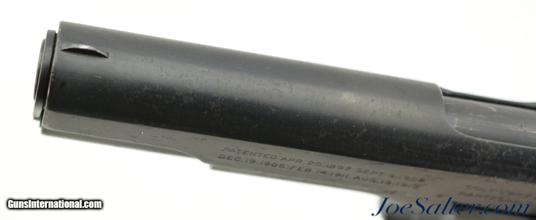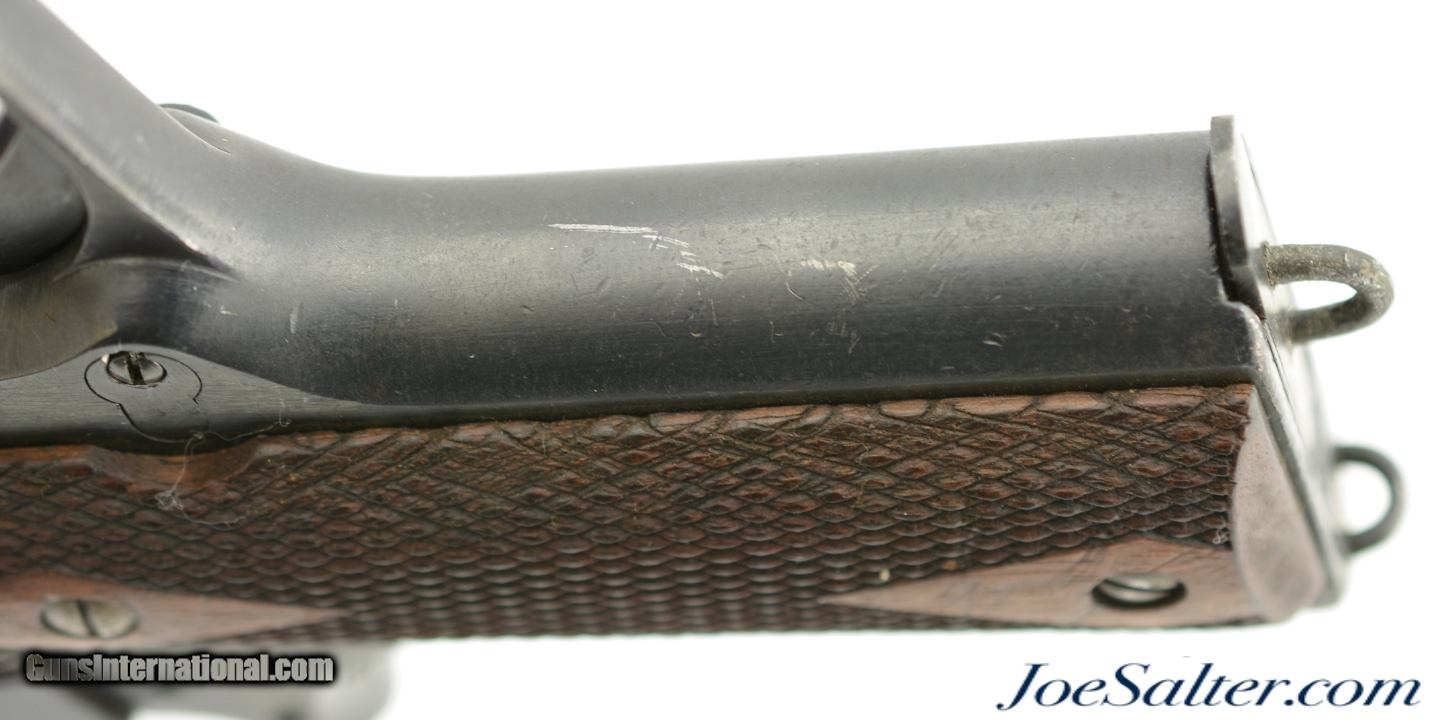 Description: Serial #189775, .45 ACP, 5" barrel with a fine, bright bore that has some trace freckling within the grooves. This is a 1918-made, "GHS" inspected pistol that retains 97-98% of a very well done added blue finish that closely matches the original black finish applied to these late-WW1 contract pistols. There is some mild silvering present along the edges and projections, with some minor surface scratches and small abrasions through the finish scattered about as well. The markings remain clear and fully legible, although the "H P" barrel barrel markings are rather faintly visible. The pistol is fitted with some fairly new double diamond wooden grips that have light handling marks and minor flattening to the points on either side. A single lanyard loop magazine is included that has been polished at the top to mimic an original two-tone magazine. This is a great looking WW1 Colt Model 1911 that has been refurbished to nearly fine condition overall. FFL or C&R SOLD Curio/Relic: Yes |