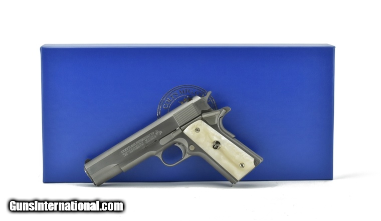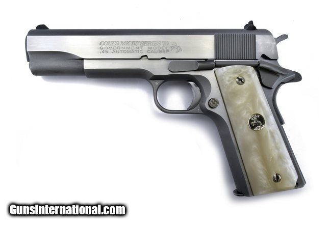 Description: Colt Government MKIV .45 caliber pistol. Series 70 reissue with faux pearl grips and stainless finish. Excellent condition with box.