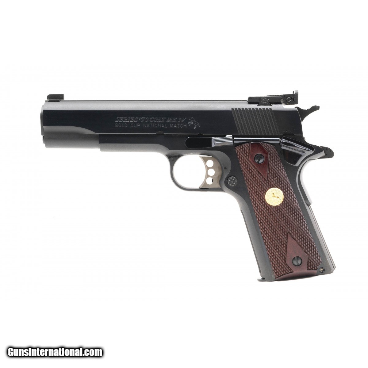 Gold Cup National Match. 5"" national match barrel, carbon steel receiver and slide, blue finish, colt champion bomar style sights, 7rd, 3-hole aluminum trigger. NEW. UPC:098289042927.