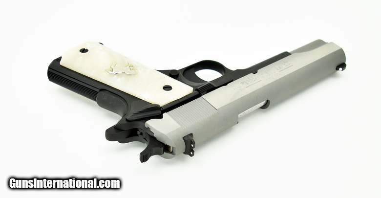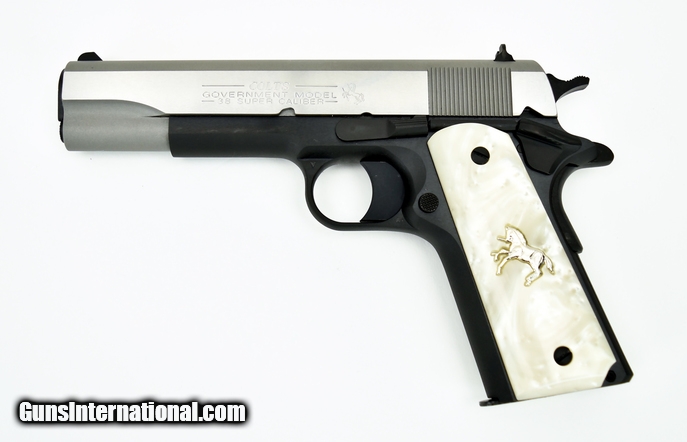 Description: " Colt Government .38 Super caliber pistol. Two tone model with stainless steel slide, blued frame and pearl grips. New SOLD |
