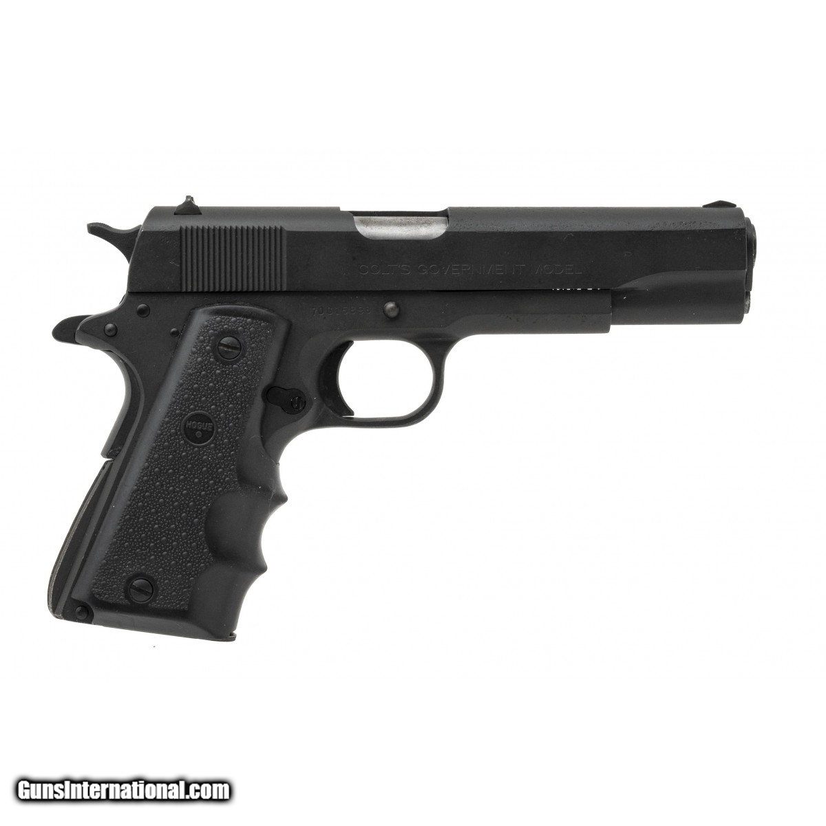 SN: 70G15898. Made in 1971. .45 with a 5"" barrel. Bore is bright with strong rifling. '70 Series MK IV Colt Pistol. Finish is in good condition with light pitting noted on the left side of the frame and on top of the slide. Hogue rubber grips show light handling wear. Overall good condition. Consignment.