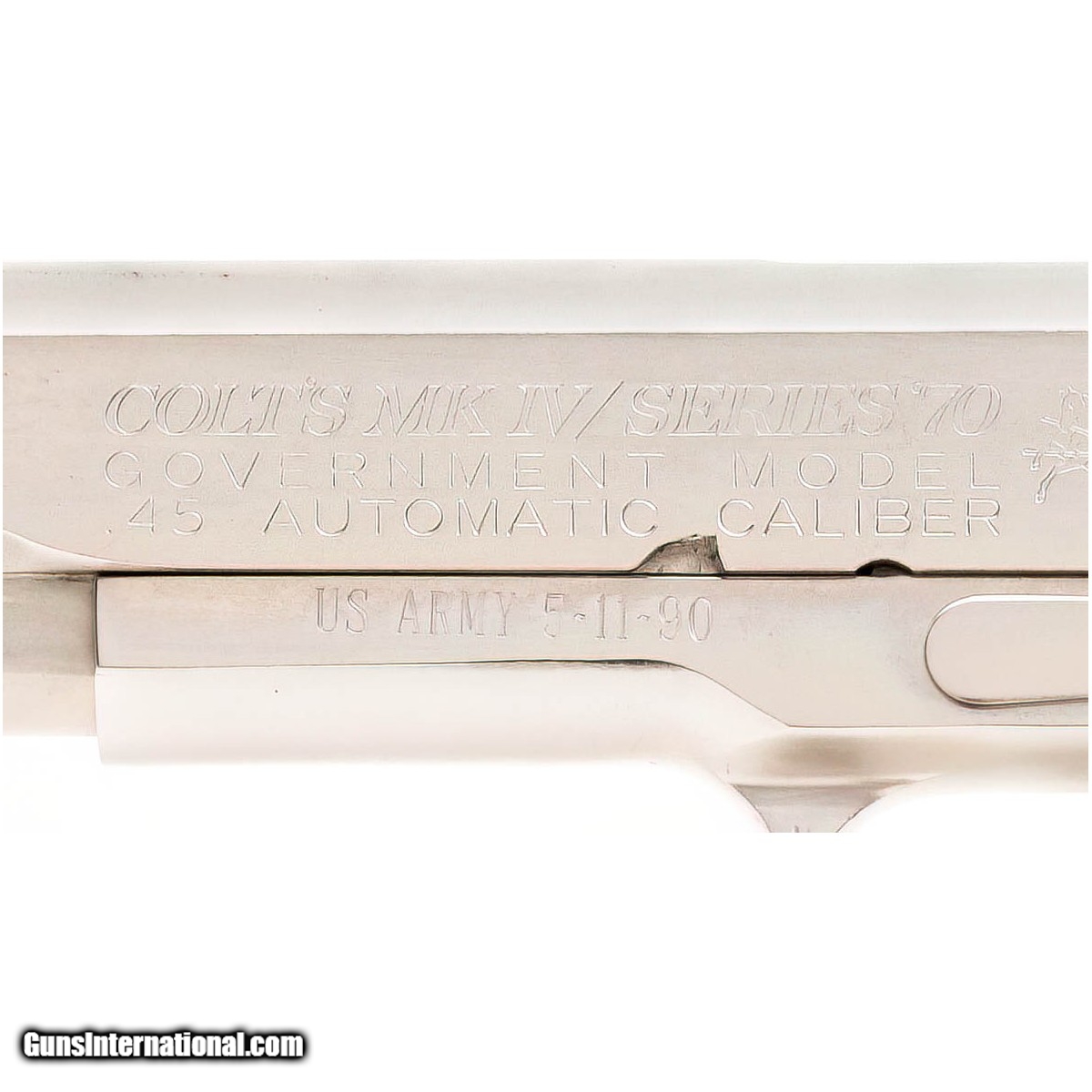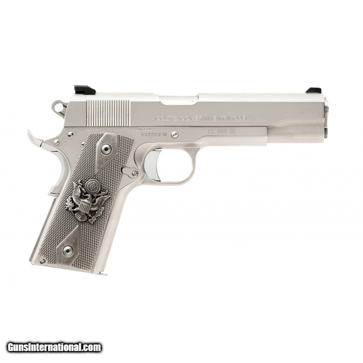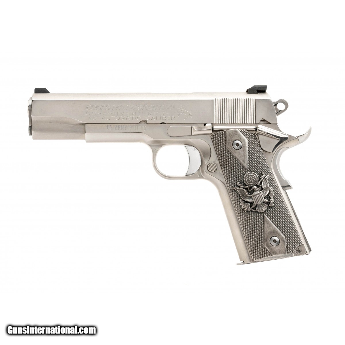 Description: " SN: 53228G70. Original Series 70 model made in 1978 with nickel finish. Has an interesting Gulf War era inscription on the frame, ""Lt. DMB III"" on one side and ""US Army 5-11-90"" on the other side. Has custom metal grips with the US Army logo. Shows some holster wear, overall very good condition. SOLD |