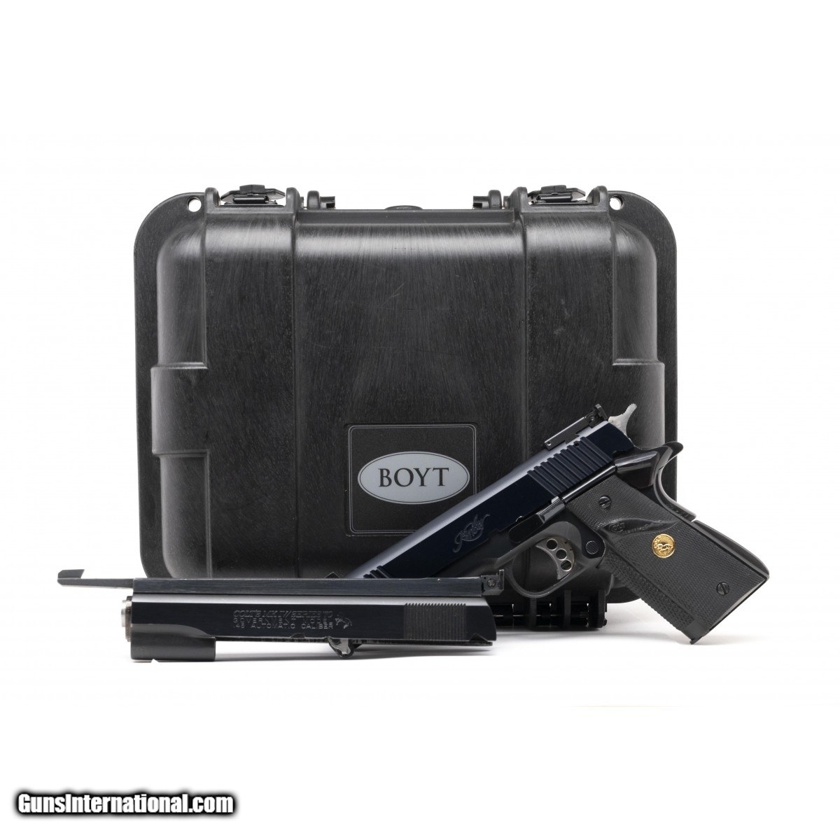 Colt Series 70 Government Model .45 auto with a Kimber .22LR conversion unit. The base gun has been customized for Bullseye shooting, with a Bo-Mar sight rib and extended front sight. The Kimber .22LR slide is currently on the gun, and the customized Colt top end is included. A great target rig, in excellent condition with carry case.