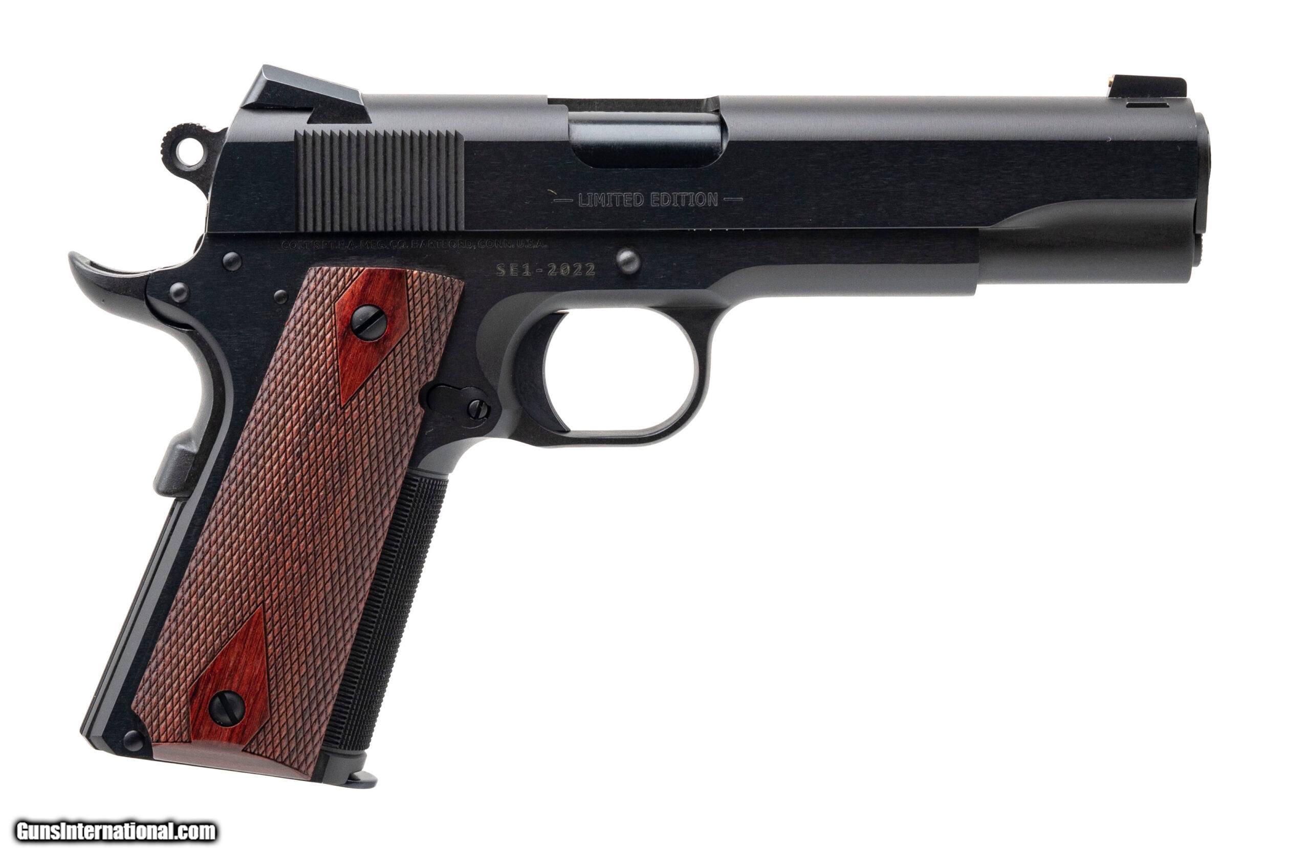 Description: "SN: SE1-2022. Modern production, .45 Auto with a 5"" barrel. Bore is bright with strong rifling. Limited Edition Government 1911 pistol with checkered wood grips. Overall condition is excellent. Comes with case. SOLD |