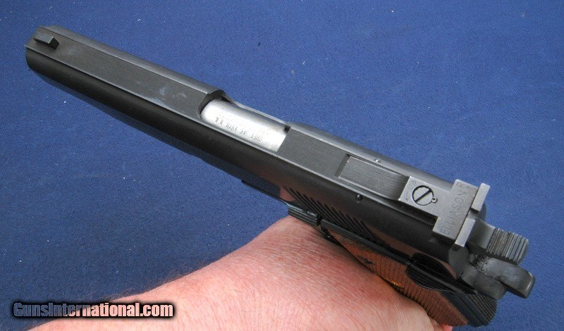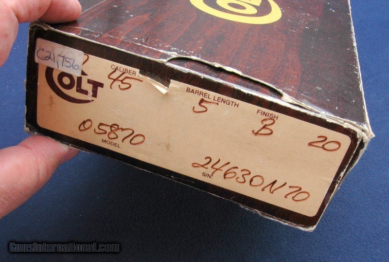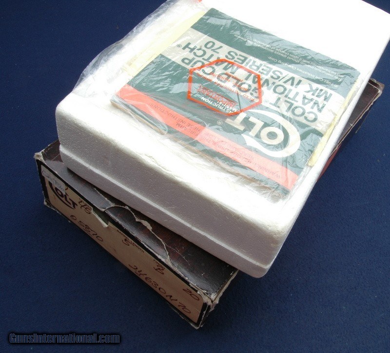 Description: Very nice gun, all original, supposedly fired 100 rounds. Good slide to frame fit, good trigger. No exterior wear. Comes with one factory Colt magazine. The box is complete, matching, original, a mite tattered, but has the manual and most paperwork as shown. Clean, oiled bore. Fairly priced. $45 shipping to the lower 48, 3% surcharge for using a CC. If you choose to pay with a personal check, we will hold the item for up to 10 days to make sure that it clears. Please expedite such pymts as we will hold an item on your word for 5 days. SOLD Handgun Caliber: .45 ACP (.45 Auto) |