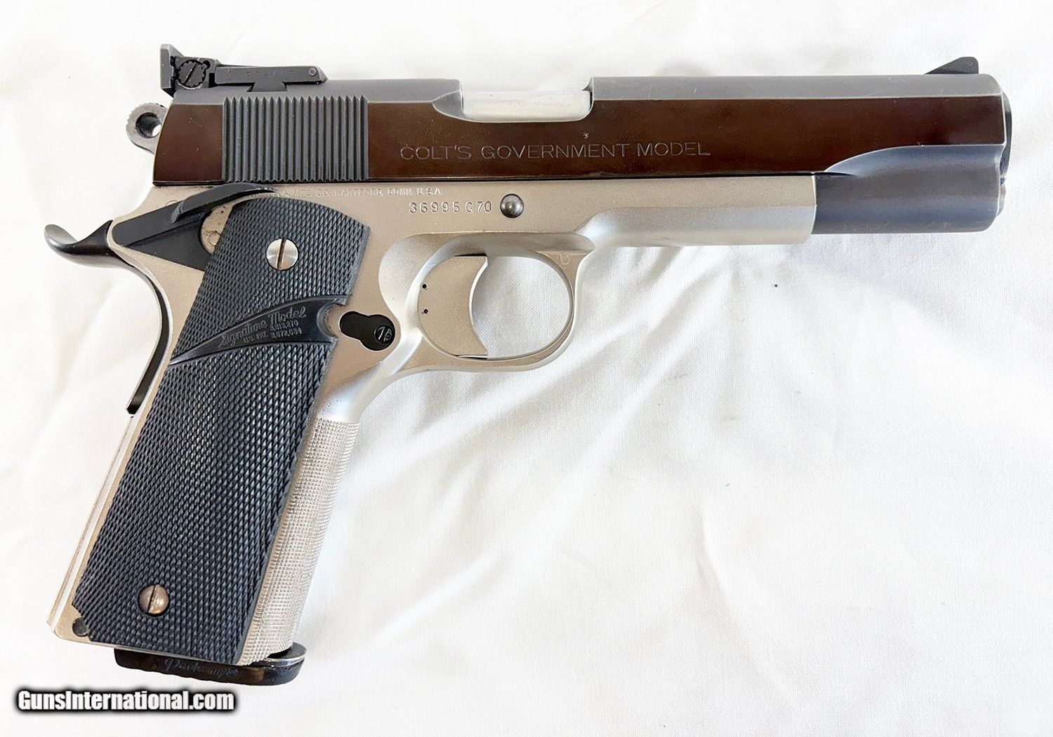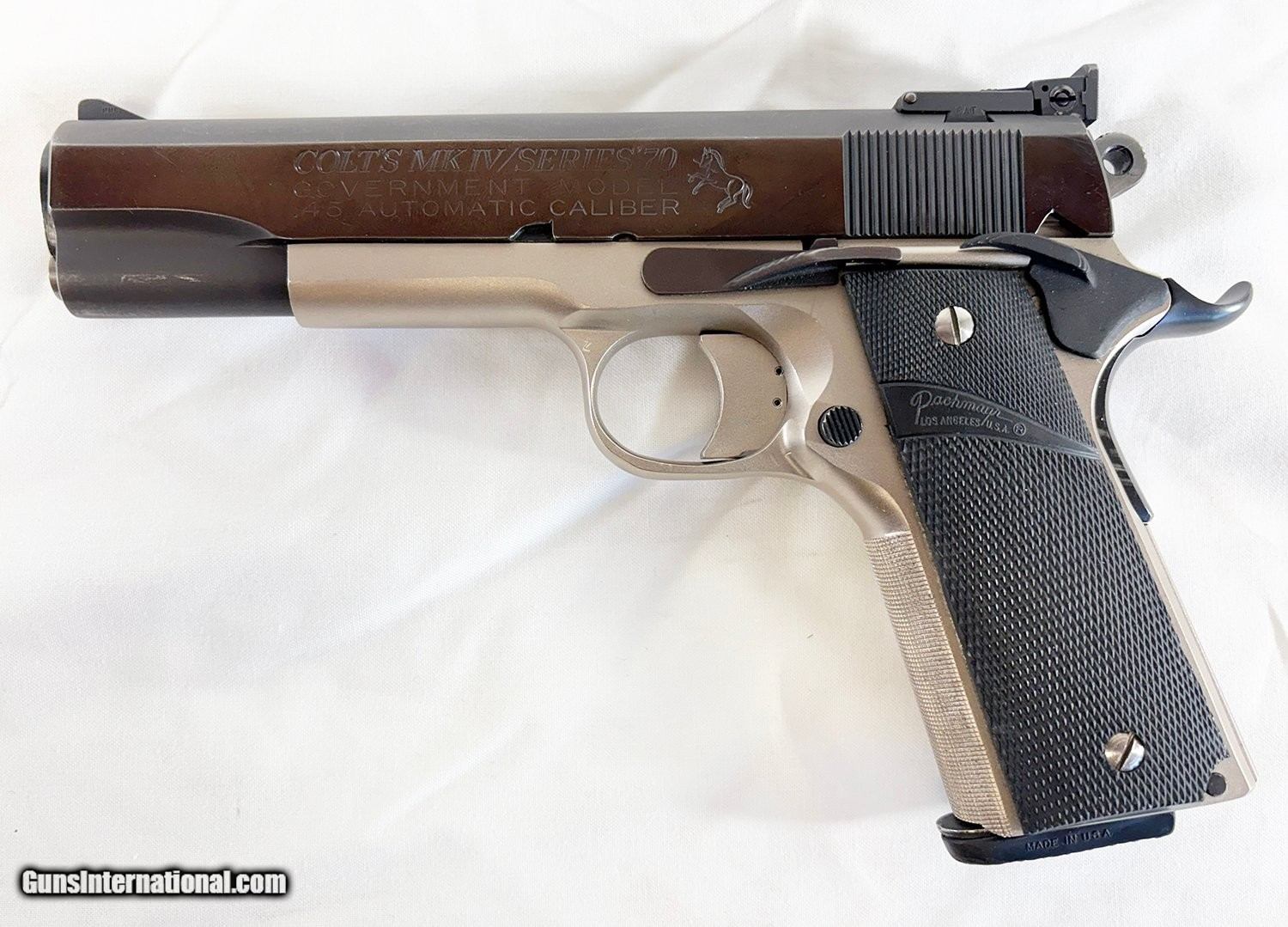 Description: Guns Listing ID: 573599 Colt Series 70 1911 in .45 ACP built and customized for bullseye and target competition. The superb work on this pistol was done in 1989 by Fred Sadowski of 300 Gunsmith in Denver, Colorado. In its era this was a nationally recognized, highly regarded shop. The gentleman who commissioned the gun fired a box of ammo through it, then put it away until today. The included letter from 300 Gunsmith details the work: • Low mount Bo-Mar sights • Safari Arms ambi safety • Safari Arms beavertail grip safety • Wilson extended slide stop • Colt checkered mainspring housing • Mason target trigger • Pachmayr stocks • Checkered front strap • Electroless nickel on frame • Slide is a Colt Series 70 and barrel is a Colt National Match All ammunition, magazines, and accessories in photos are included. This is a fine opportunity to secure a beautifully executed pistol built by a master. SOLD Manufacturer: COLT Model: 1911 Caliber Info: .45 ACP Condition: Used - Non-Certified Barrels: 5" BARREL Action: SEMI AUTOMATIC Finish: BLUE AND SILVER |