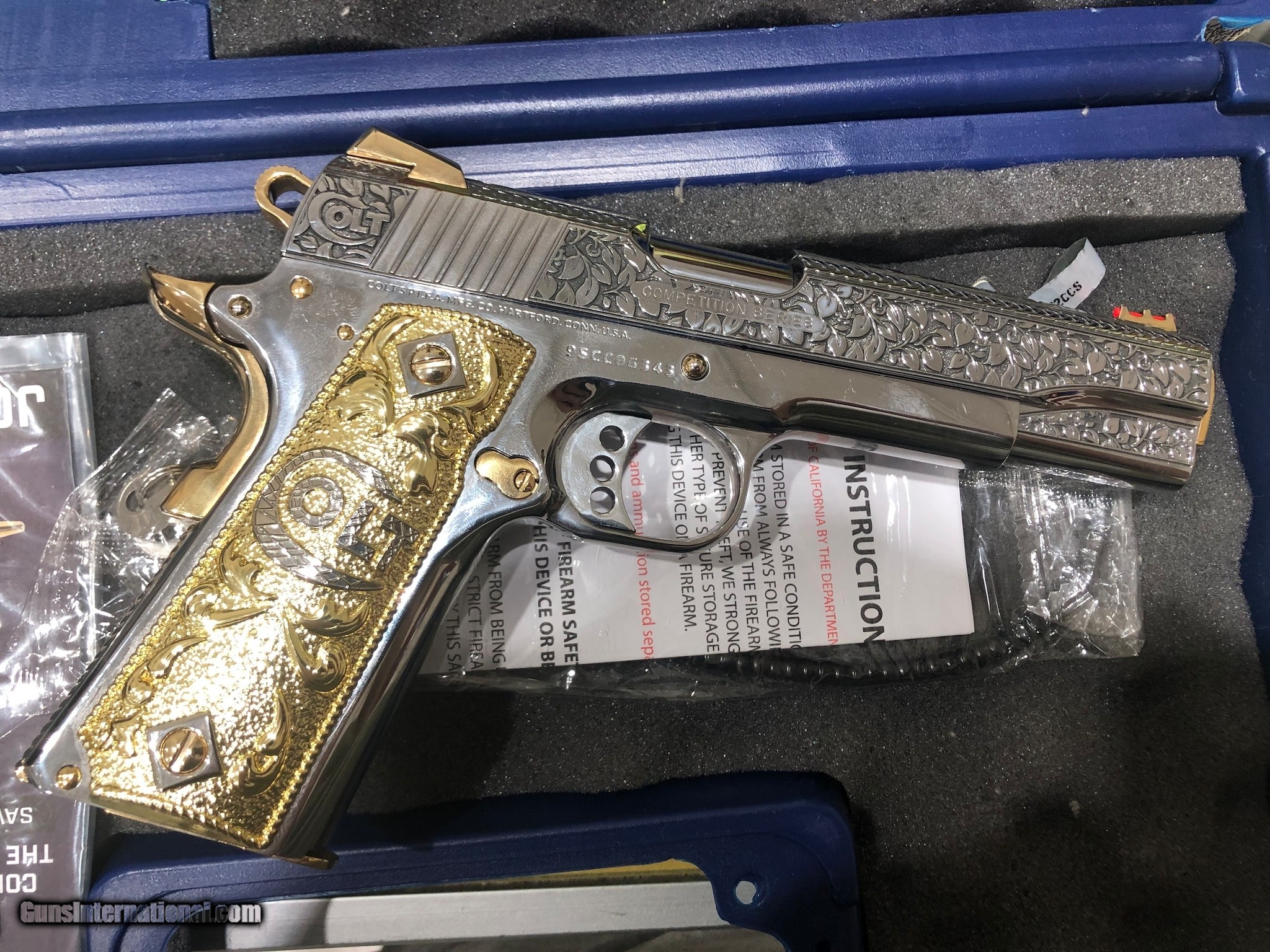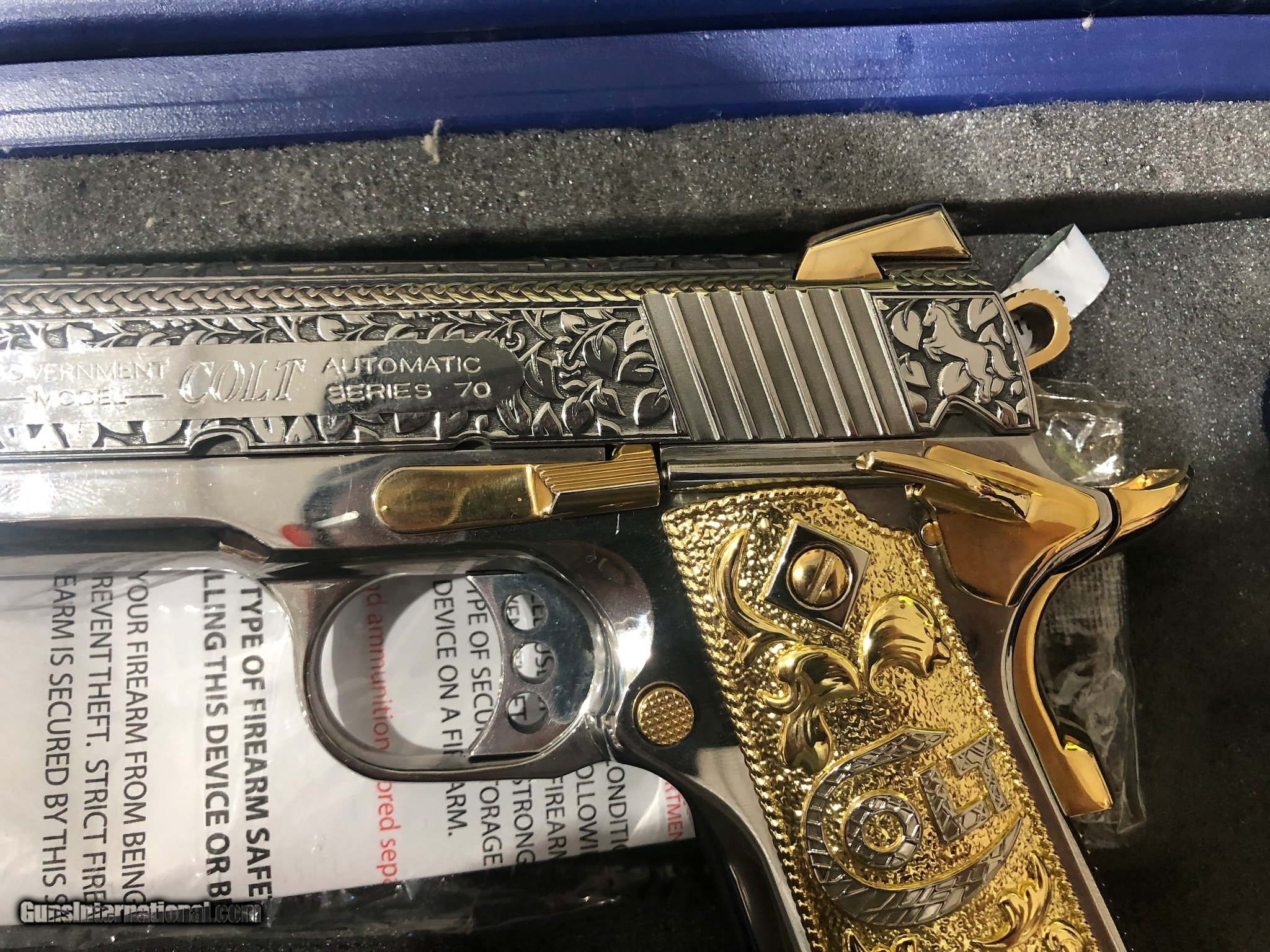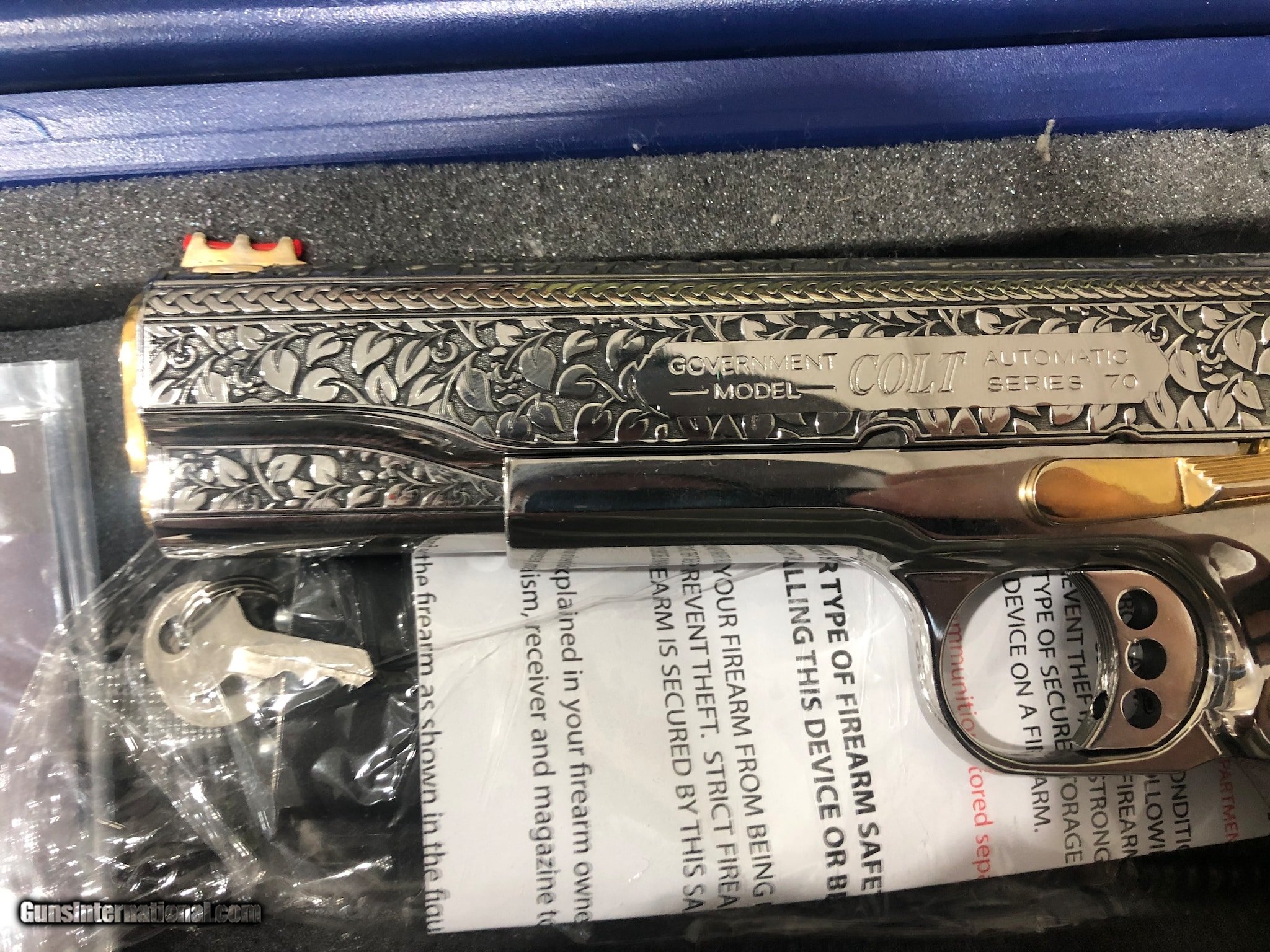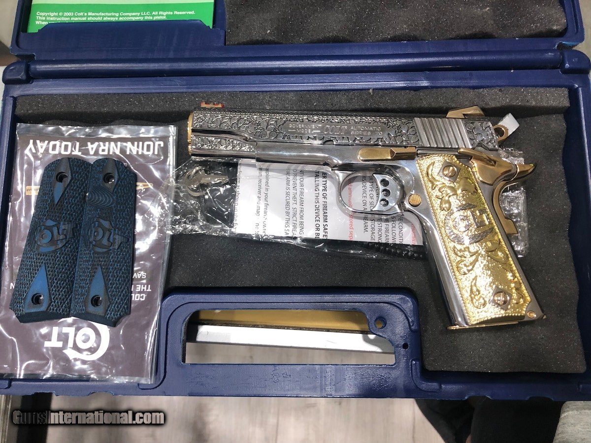 Description: Guns Listing ID: 672845 Colt 1911 9mm with nickel plated engraved finish and gold plated controls. The bottom fifth of the magazine is also gold plated. SOLD Manufacturer: COLT Model: 1911 COMPETITION SERIES 70 Caliber Info: 9MM Condition: Used - Non-Certified Barrels: 5 BARREL Finish: NICKEL |