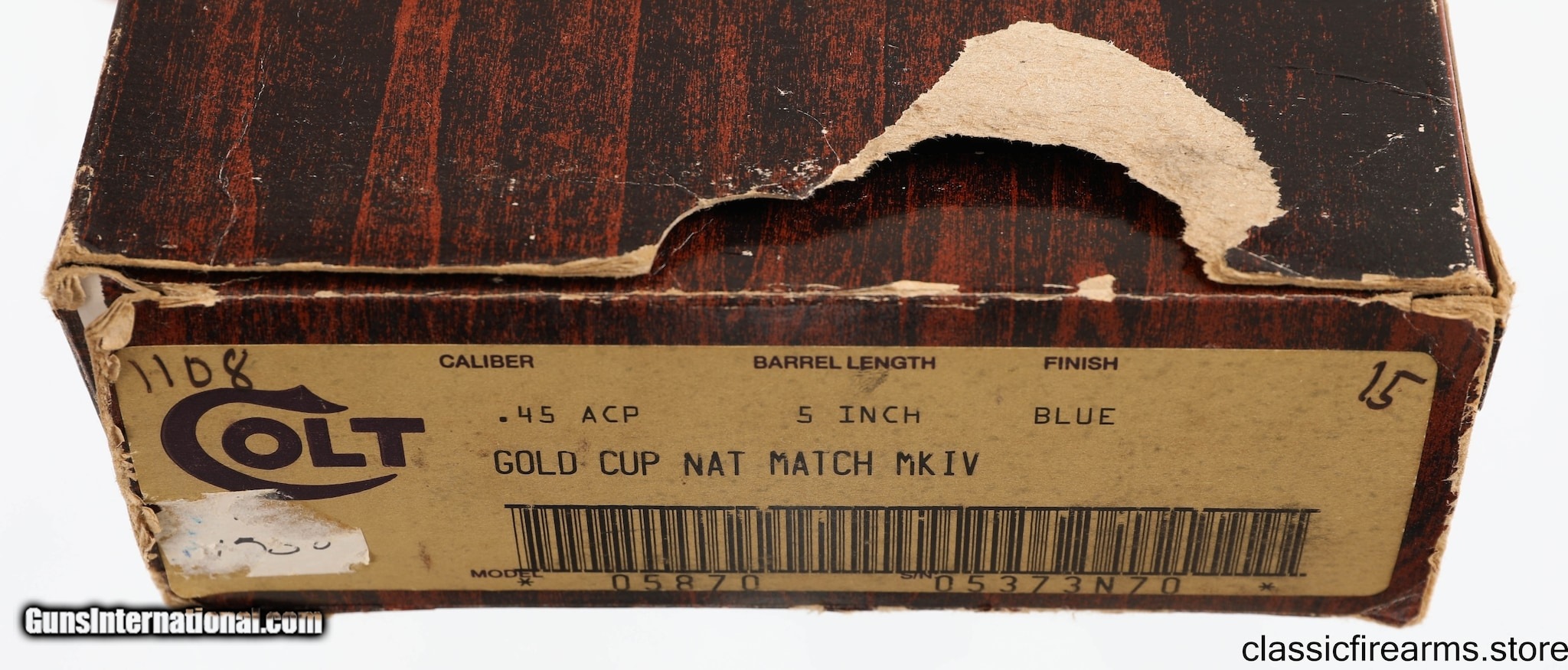 Description: Guns Listing ID: 632823 MAKE - COLT MODEL - 1911 GC NM FINISH - BLUED BARREL - 5\" CALIBER - 45 ACP CAPACITY - 7 GRIPS - WOOD CONDITION - EXCELLENT FEATURES - COMES WITH ORIGINAL BOX, PAPERS, & TOOL SOLD Manufacturer: COLT Model: 1911 Gold Cup National Match Series 70 MKIV Caliber Info: 45 ACP Condition: Used - Non-Certified Barrels: 5 BARREL Finish: BLUED |