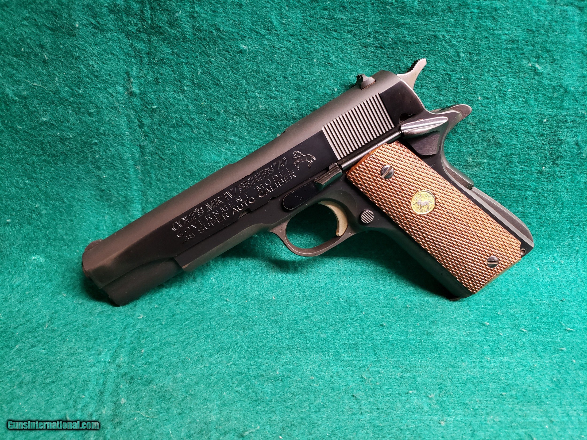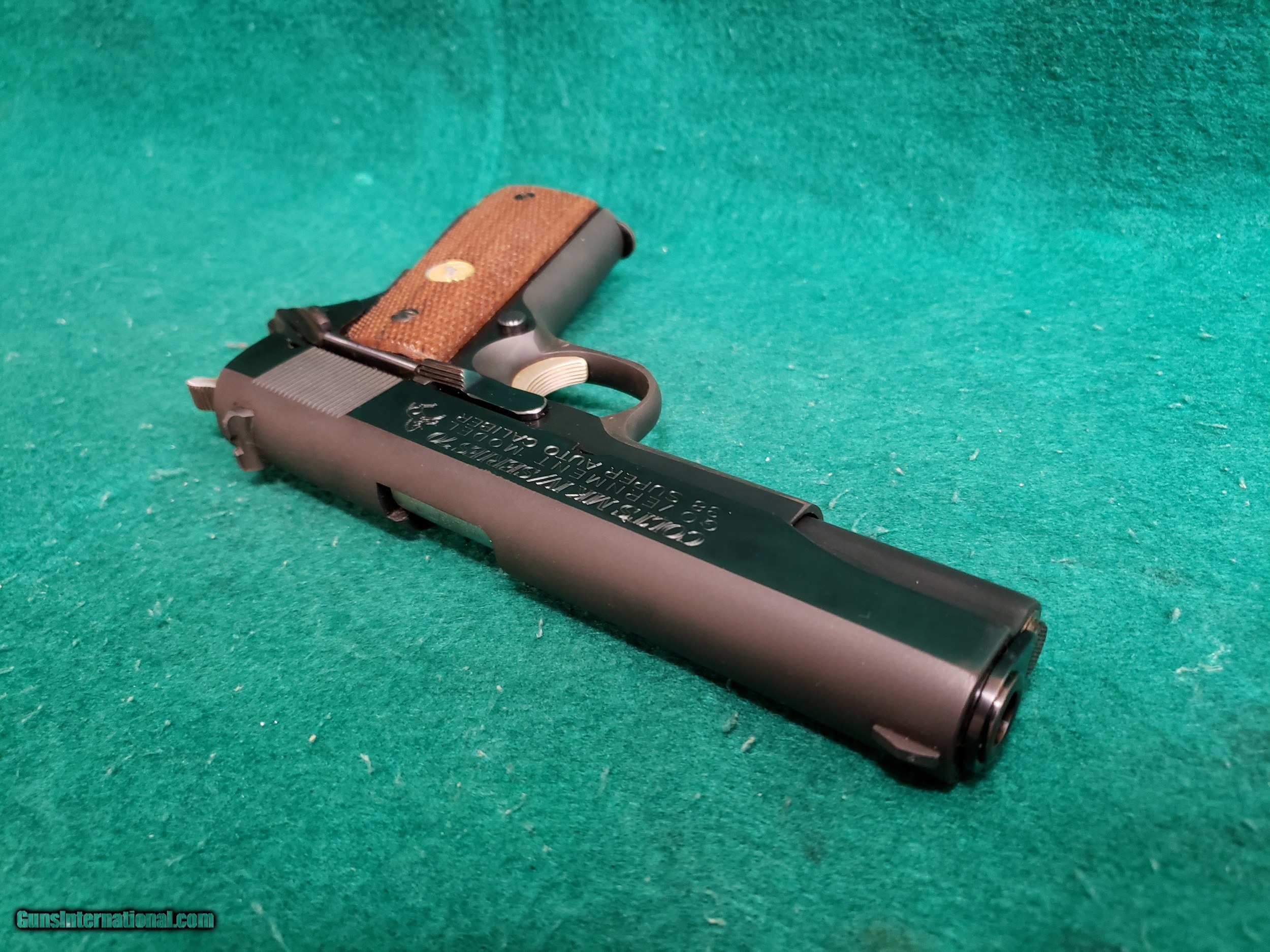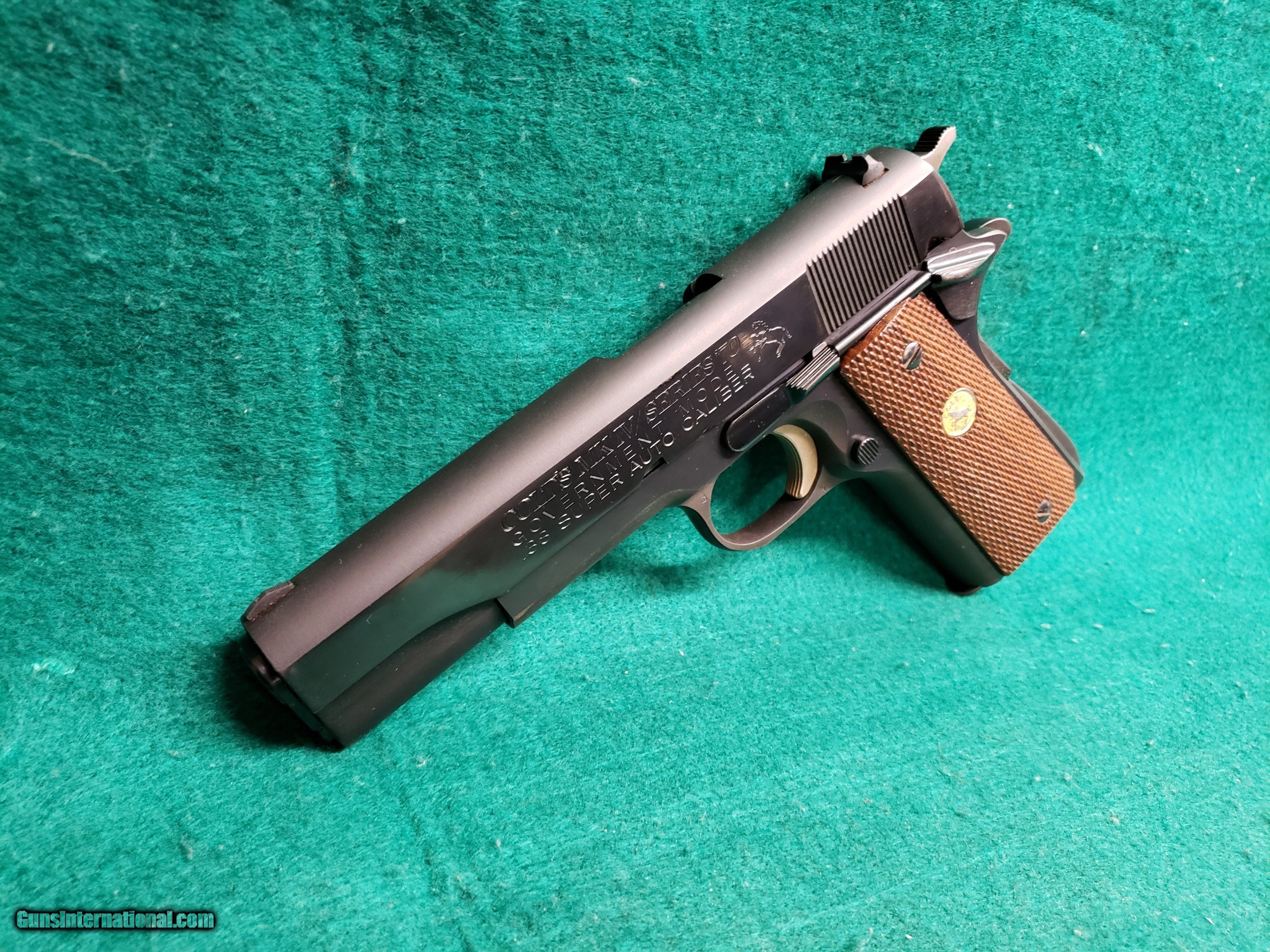 COLT - 1911 GOVERNMENT MODEL. MK IV/SERIES 70. BLUED. 5 INCH BARREL. W-ONE MAG. MINTY BORE! MFG. IN 1977 - .38 SUPER