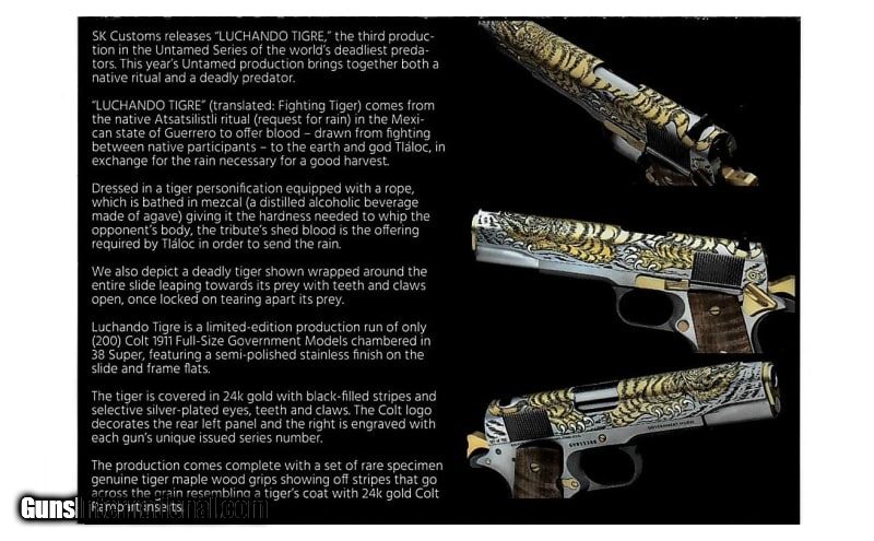 Description: SK Customs "Luchando Tigre." 38 Super Government Model represents the third edition of the Untamed series. "Luchando Tigre" comes from the native Atsatsilisti rain ritual in the Mexican state of Guerrero. Limited-edition product run of only 200 Colts, each feature a semi-polished stainless finish on the slide and frame flats. The tiger is covered in 24K gold and black-filled stripes with selective silver-plated eyes, teeth and claws. Grip panels of tiger Maple with 24 Gold Colt Stallions. New in Factory Box with manual and extra grip panels. .38 Super SOLD Handgun Caliber: .38 Super Auto Metal Condition: "Stainless, Gold Tiger Wood Condition: Tiger Stripe Maple Bore Condition: NEW Barrels: 5 Inch Triggers: Single Action Auto Sights: Fixed Item Location: Buda, TX |
