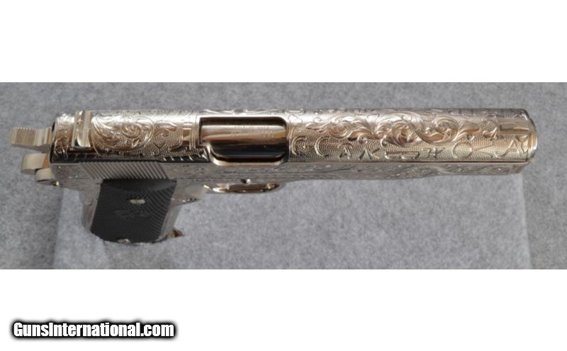 Description: This is a highly engraved Colt 70 Series Government Model in .45 ACP with Texas ranch brands depicted throughout the firearm. The engraving was done by Colorado Master Engraver Bertram Edmiston and includes a Certificate of Authenticity. SOLD Manufacturer: S/N 01833G70 Caliber Info: .45 ACP Metal Condition: Excellent condition. Extensive engraving done by Bertram Edmiston. Wood Condition: Grips are in excellent condition. Bore Condition: Excellent condition. Barrels: 5 Inches. Weight: 2 Lbs 6 Oz Sights: Fixed sights. Extras: Includes 1 magazine. Item Location: Lone Tree, CO |