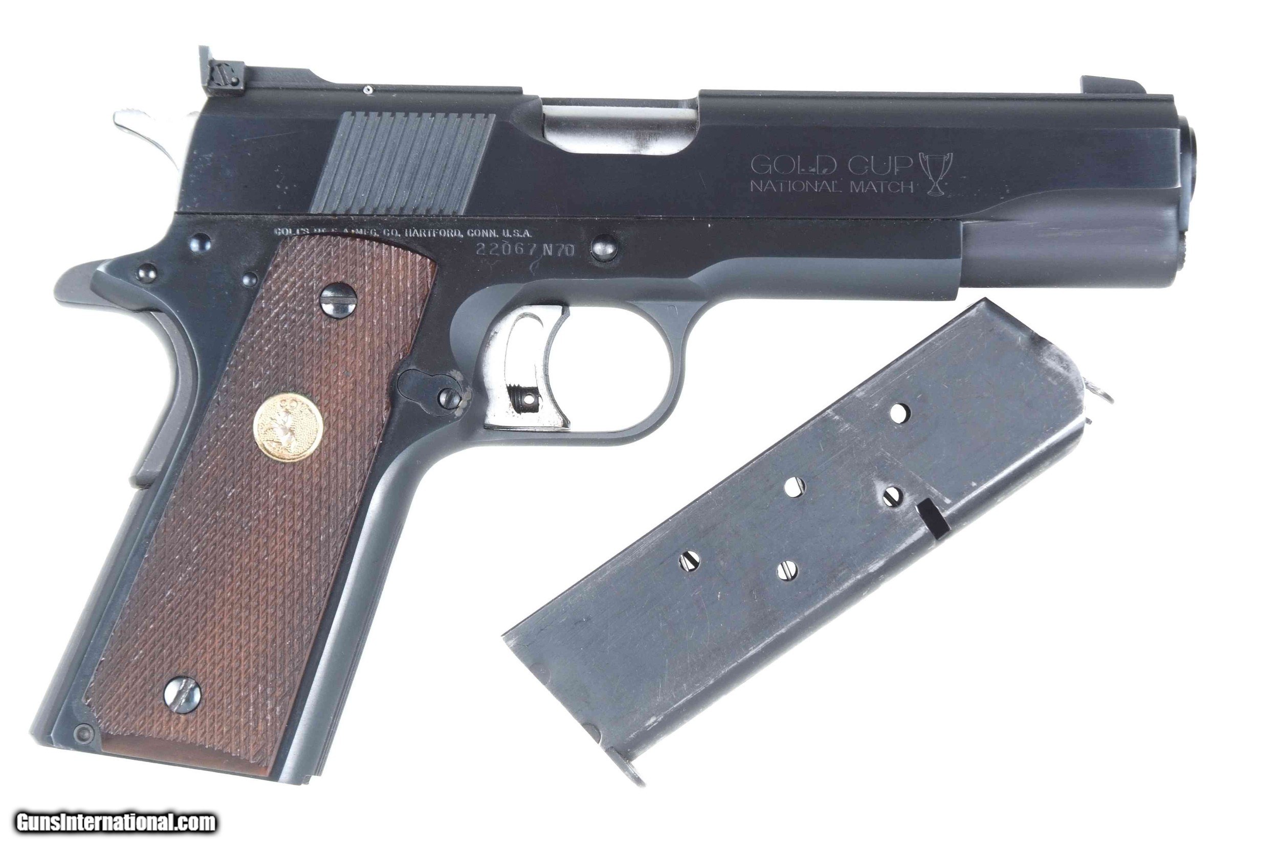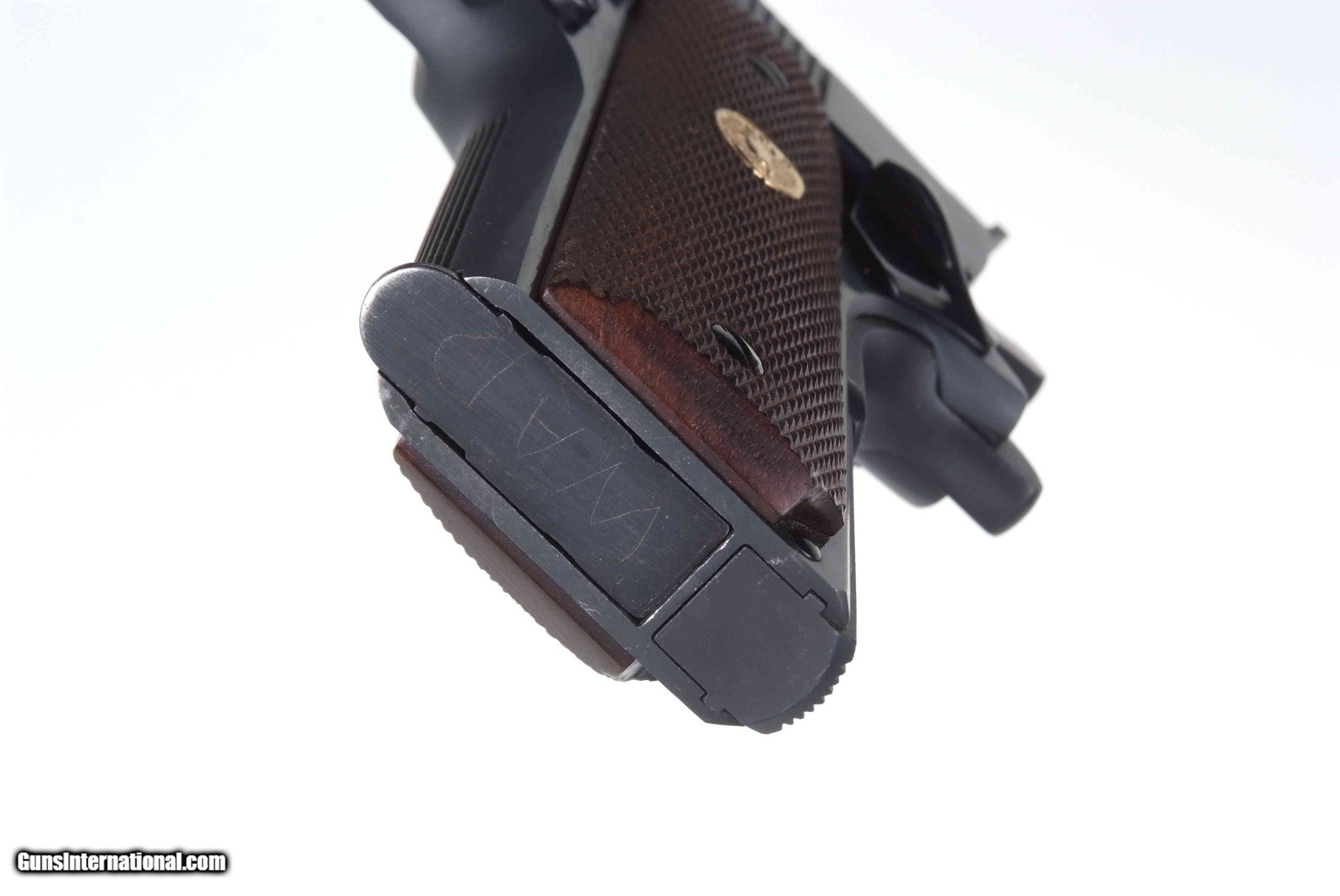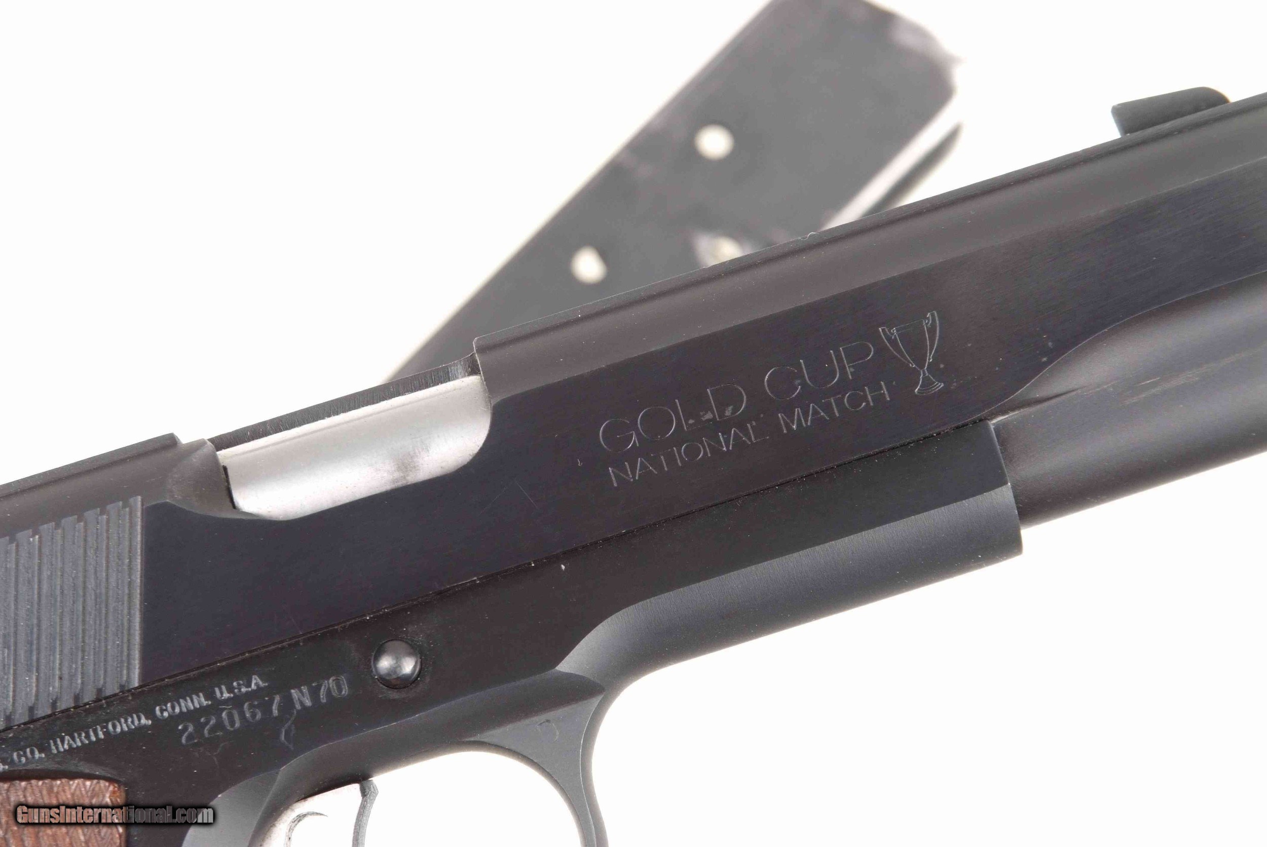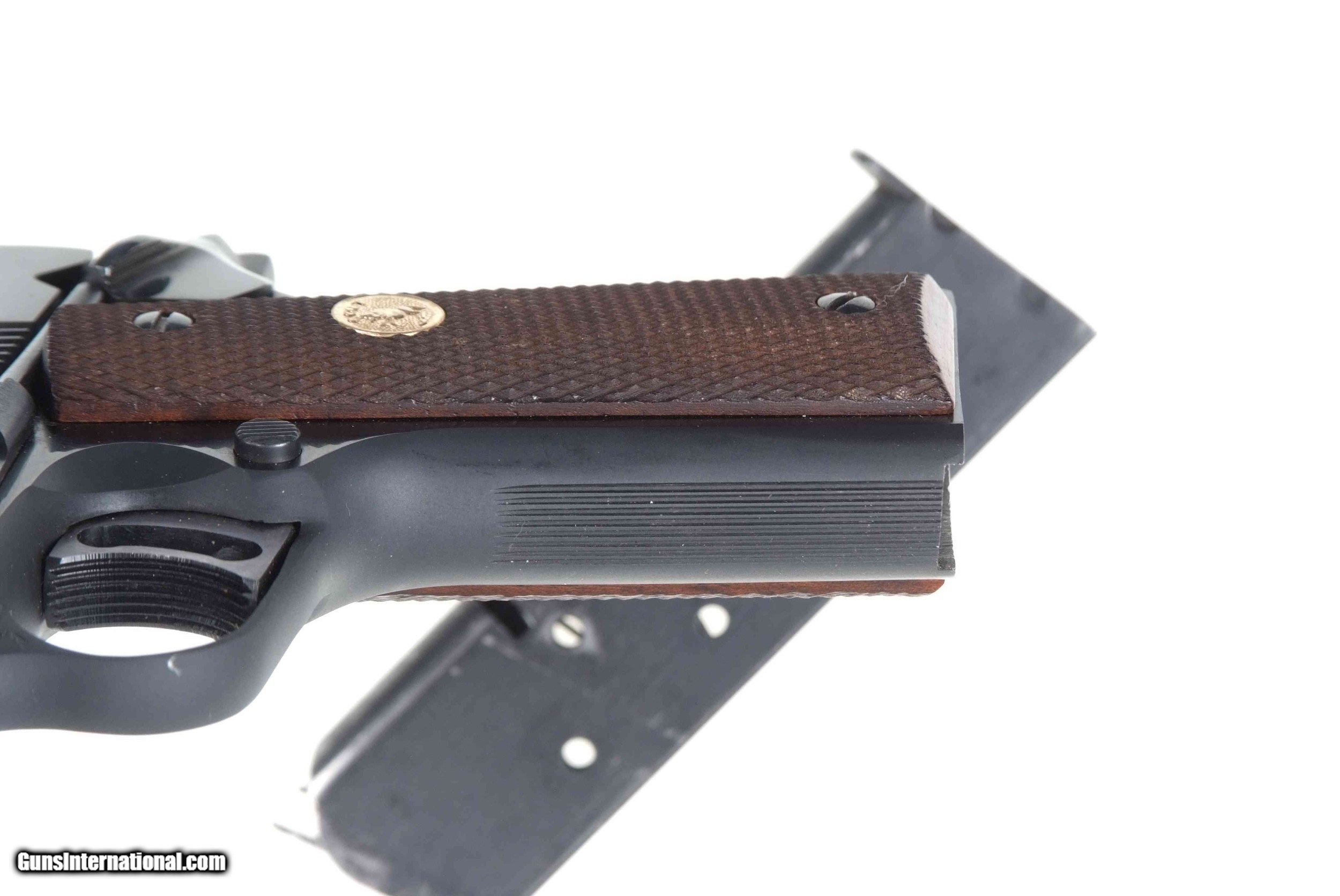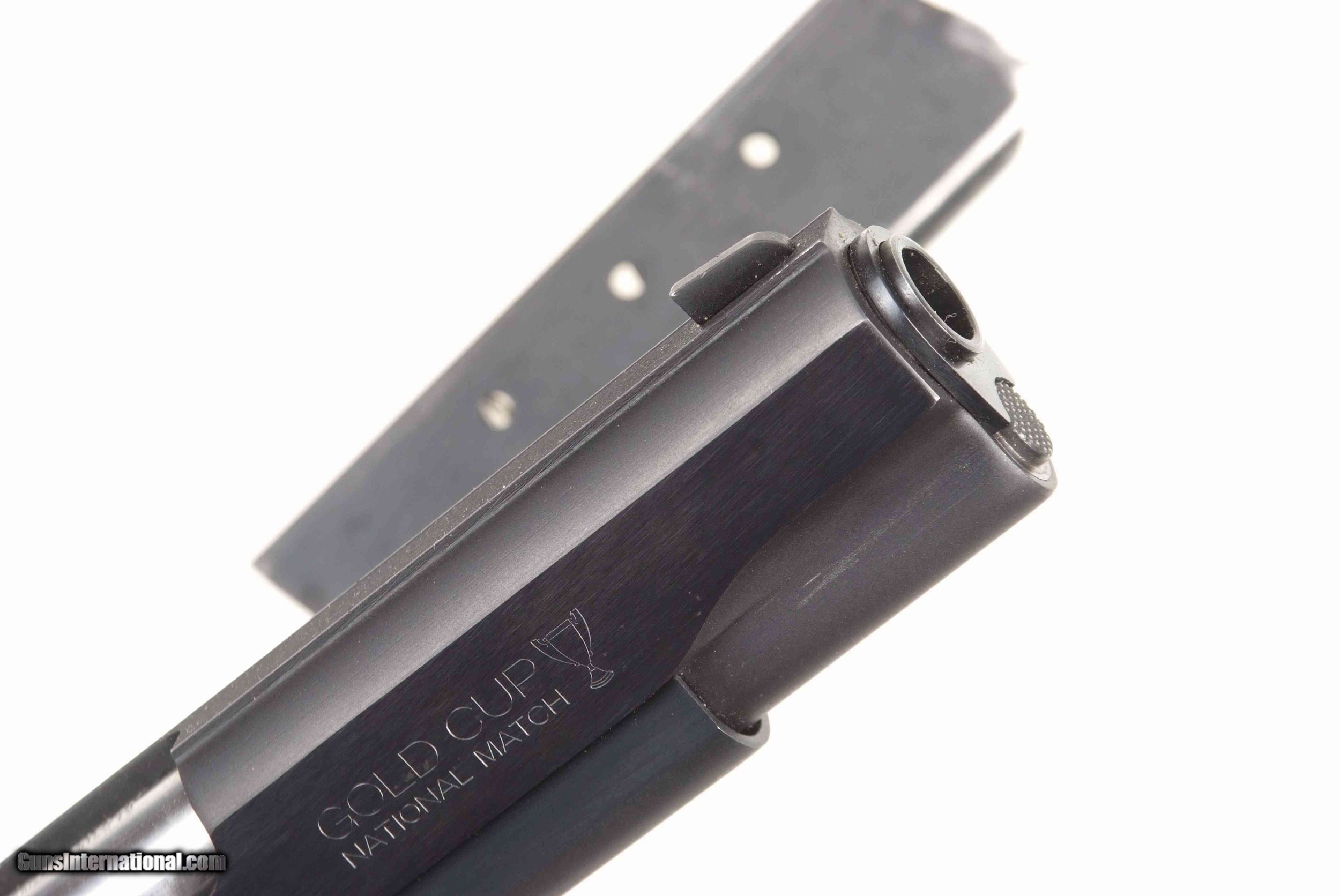 Description: Description: Standard configuration Colt Gold Cup, Series 70 , National Match with 5” barrel, fixed front sight and fully adjustable Elliason rear sight. Slide with usual three line address on left side denoting model and caliber followed by rampant Colt. Large print GOLD CUP/NATIONAL MATCH model denoted on right side of slide. Frame with usual manufacturers address and full serial number. Standard Gold Cup adjustable trigger and spur hammer. Two piece Colt monogrammed checkered walnut grips with factory flat main spring housing and forward grip serrations. Replacement magazine with very lightly initials on floorplate. Synopsis: Outstanding Colt Mark IV/Series 70 Gold Cup National Match .45 ACP Condition: Excellent with bright salt blue and only light sharp edge wear. Mirror bright bore. Perfect manual mechanics. VG+ replacement magazine. A extremely attractive Colt Gold Cup National Match, Series 70, equally at home on the range or in your collection. Buyer pays $55 insured 2nd day FedEx shipping fee. Visit our company by searching for Historic Investments online! We have more pictures of this gun on our . SOLD Handgun Caliber: .45 ACP (.45 Auto) Manufacturer: Colt Model: Gold Cup, MK IV Series 70 Serial Number: 22067N70 |