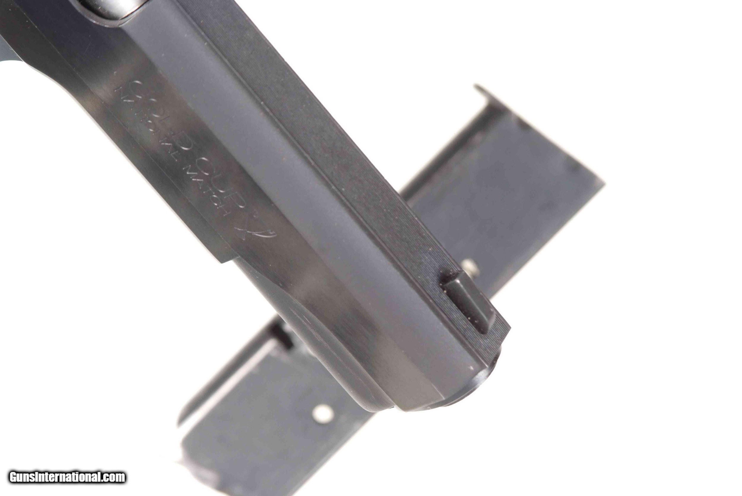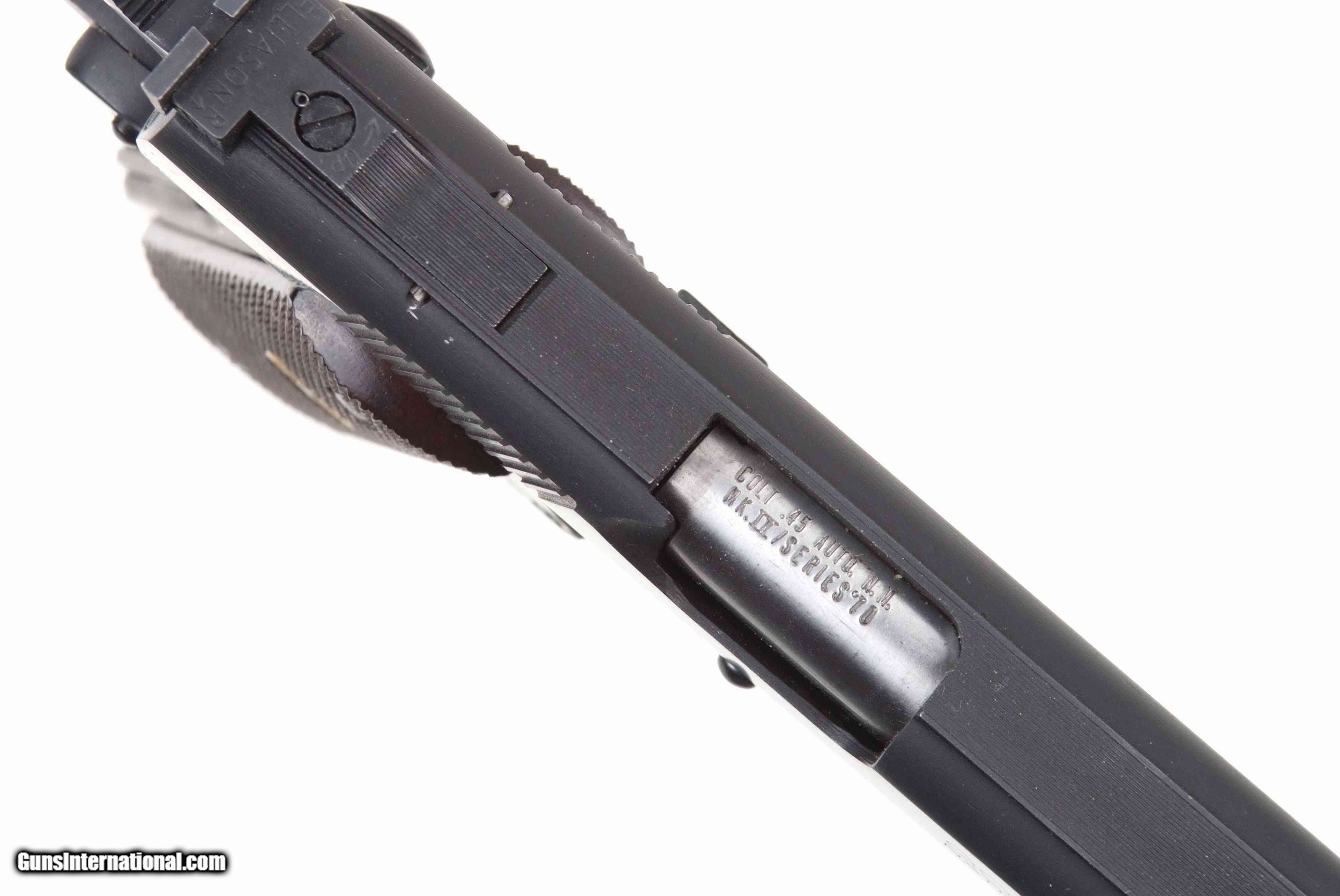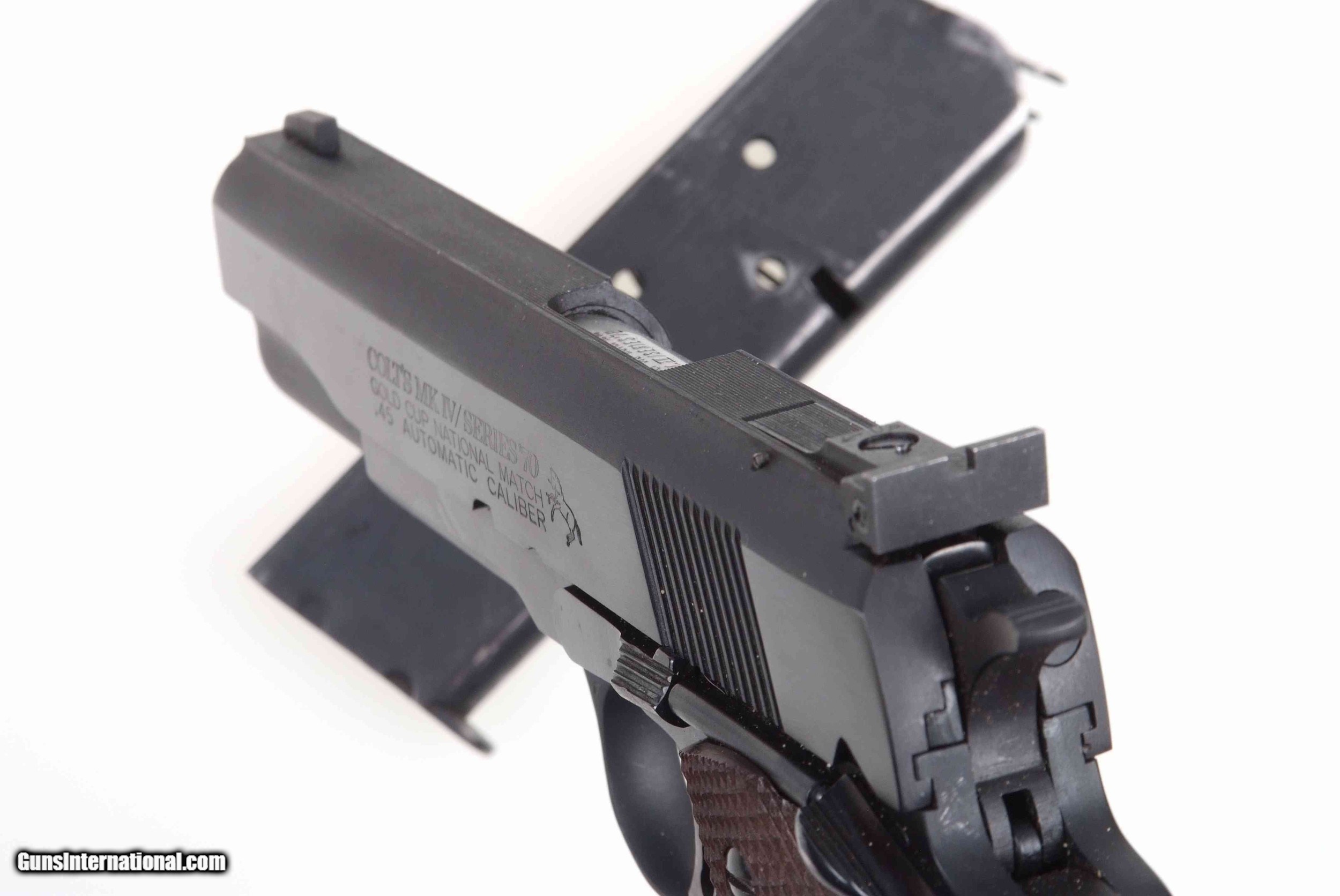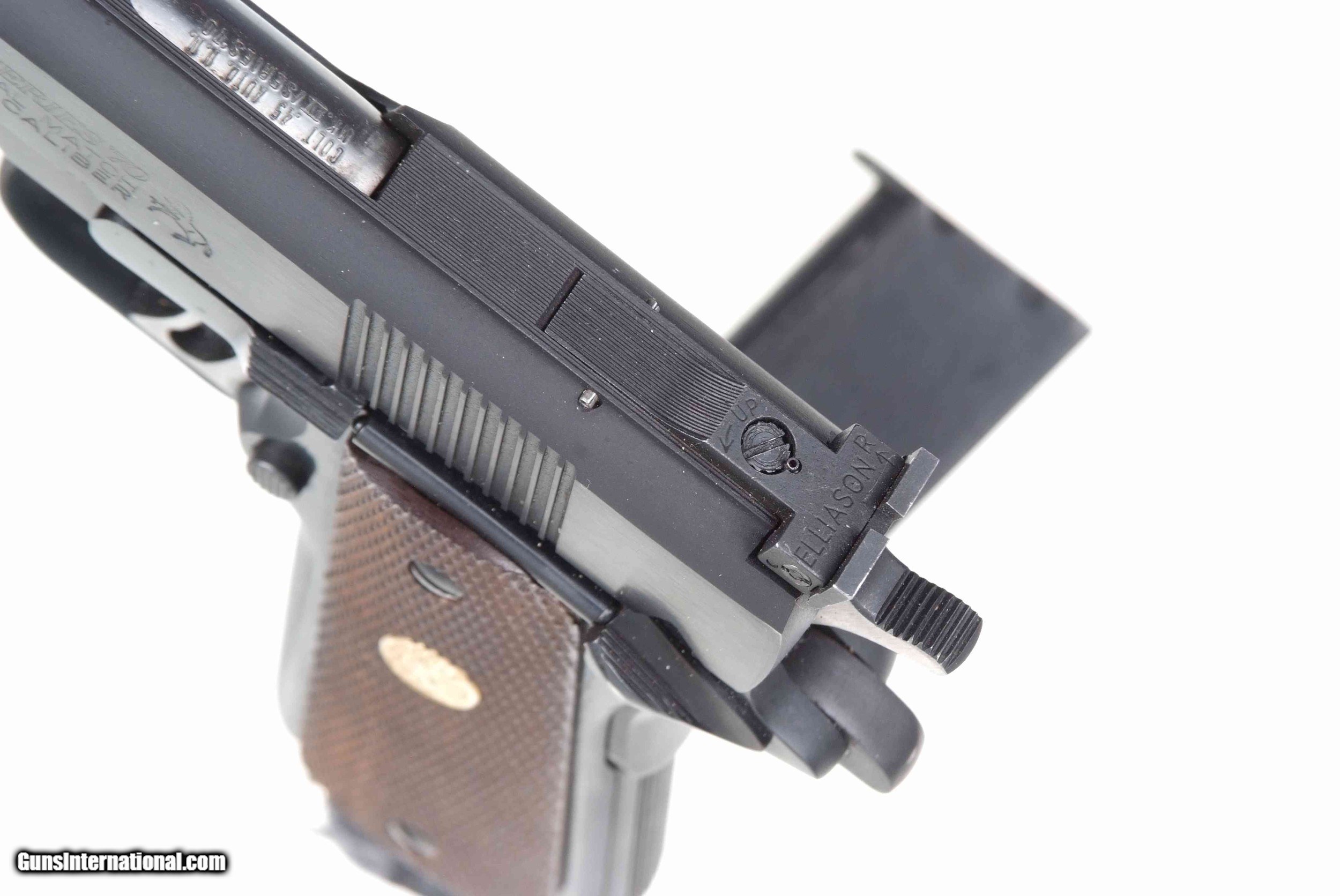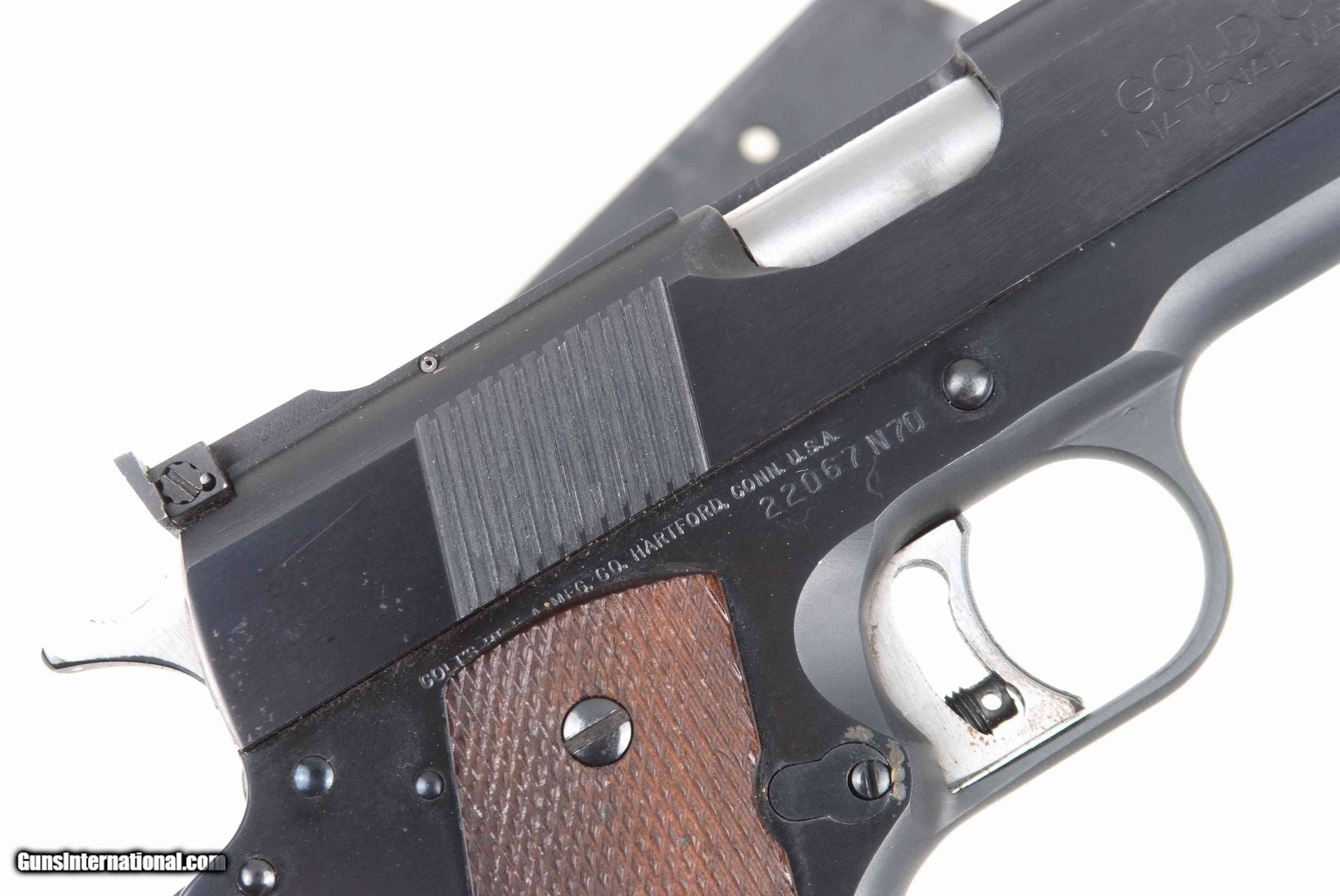 Description: Description: Standard configuration Colt Gold Cup, Series 70 , National Match with 5” barrel, fixed front sight and fully adjustable Elliason rear sight. Slide with usual three line address on left side denoting model and caliber followed by rampant Colt. Large print GOLD CUP/NATIONAL MATCH model denoted on right side of slide. Frame with usual manufacturers address and full serial number. Standard Gold Cup adjustable trigger and spur hammer. Two piece Colt monogrammed checkered walnut grips with factory flat main spring housing and forward grip serrations. Replacement magazine with very lightly initials on floorplate. Synopsis: Outstanding Colt Mark IV/Series 70 Gold Cup National Match .45 ACP Condition: Excellent with bright salt blue and only light sharp edge wear. Mirror bright bore. Perfect manual mechanics. VG+ replacement magazine. A extremely attractive Colt Gold Cup National Match, Series 70, equally at home on the range or in your collection. Buyer pays $55 insured 2nd day FedEx shipping fee. Visit our company by searching for Historic Investments online! We have more pictures of this gun on our . SOLD Handgun Caliber: .45 ACP (.45 Auto) Manufacturer: Colt Model: Gold Cup, MK IV Series 70 Serial Number: 22067N70 |