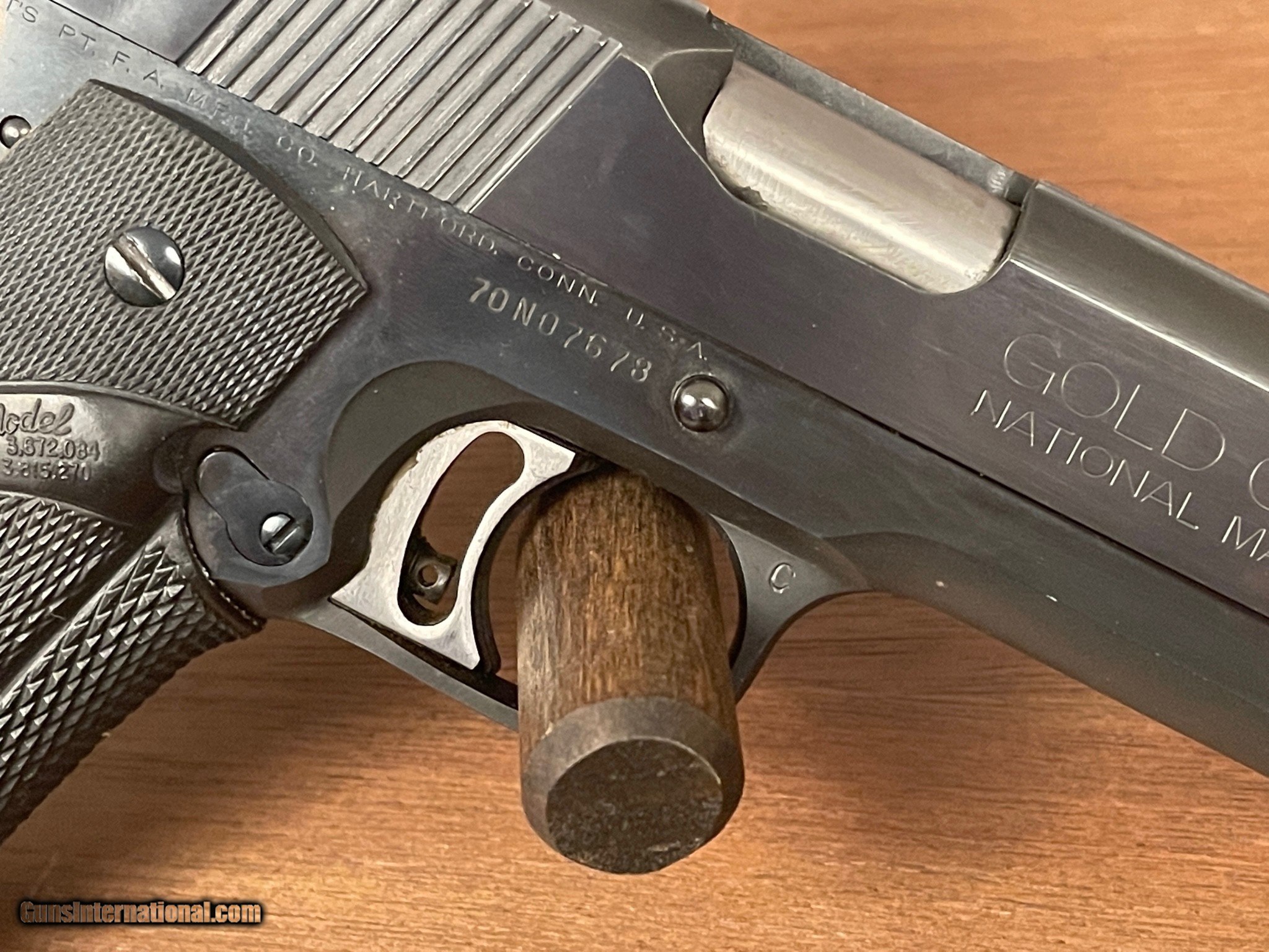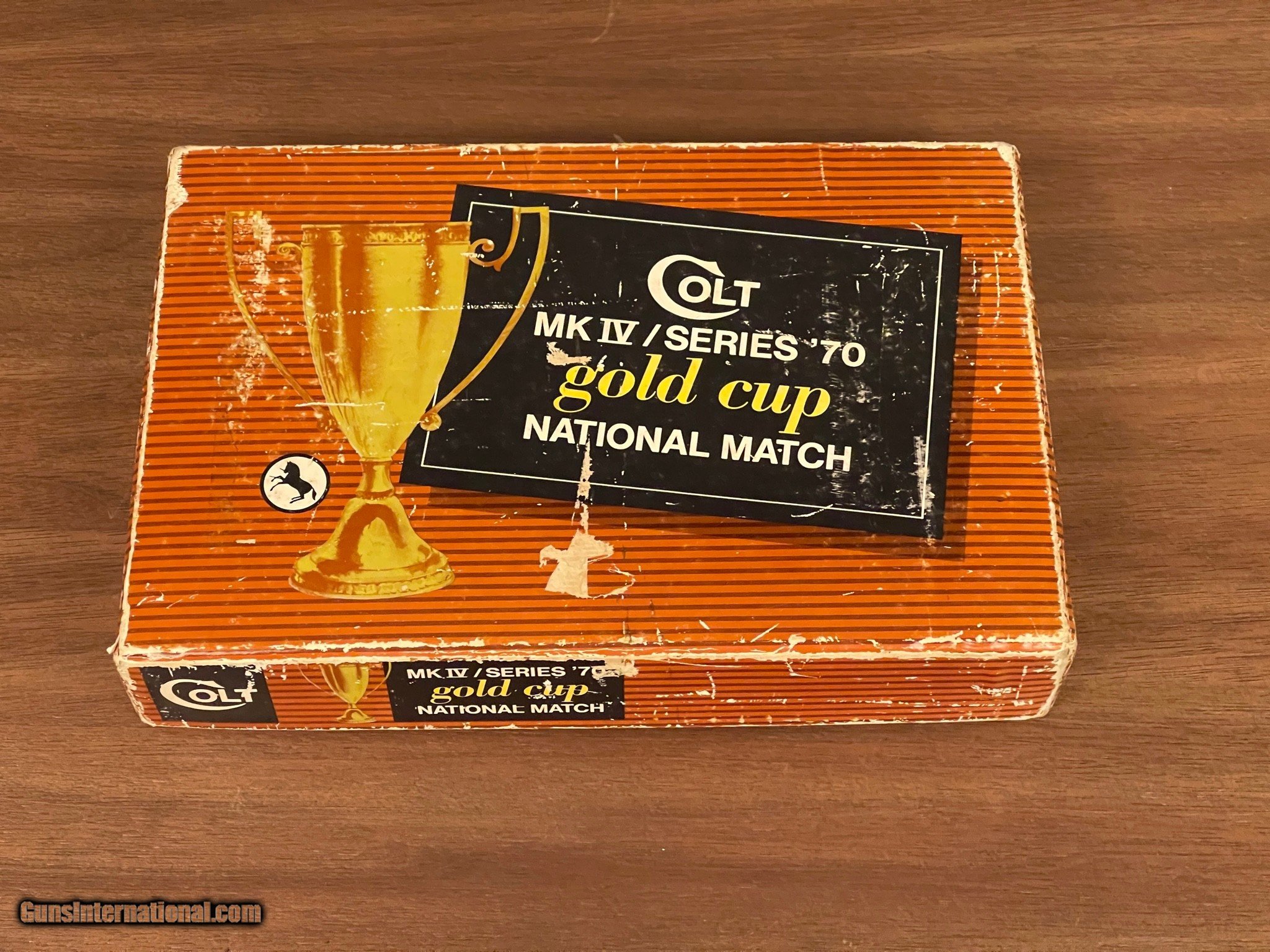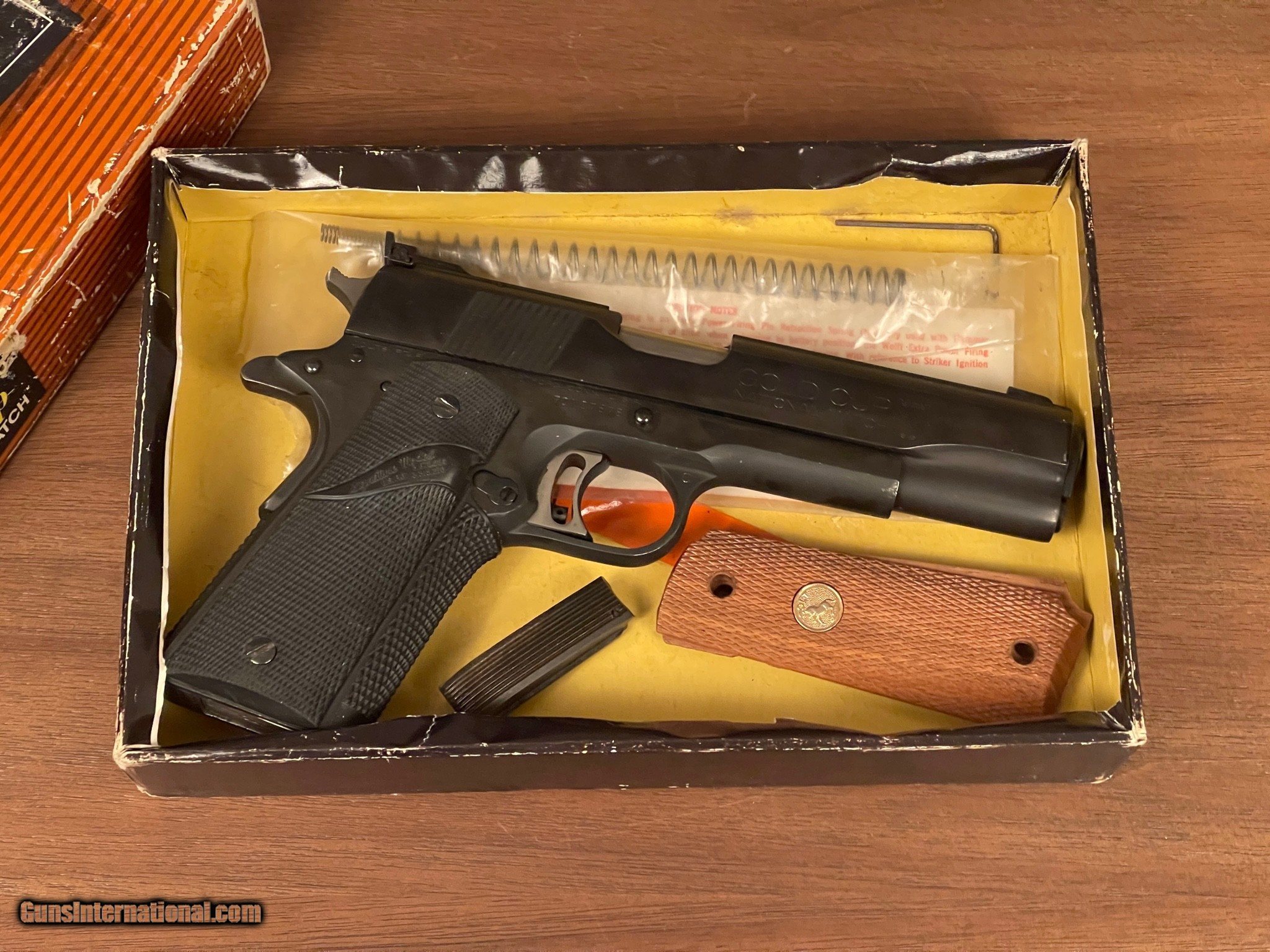 Description: In today on consignment from a private collection. 1972 Colt Gold Cup National Match 45ACP with orginal box and grips. come with 4 boxes of Federal High power 230gr fmj SOLD Handgun Caliber: .45 ACP (.45 Auto) |