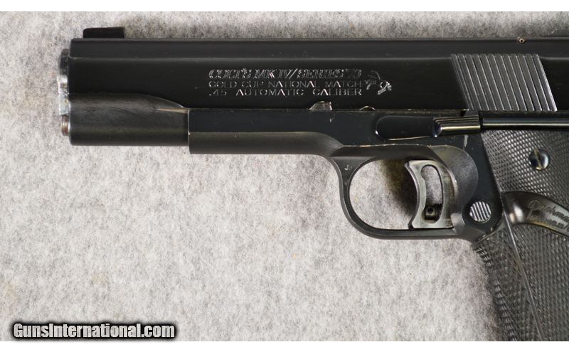 Description: MK IV Series 70 Gold Cup National Match, produced in 1979. Blue and bore are excellent. Comes with three Colt magazines. .45 ACP SOLD Metal Condition: Excellent Barrels: 5" National Match Triggers: Gold Cup Trigger Sights: Adjustable Item Location: short pump |