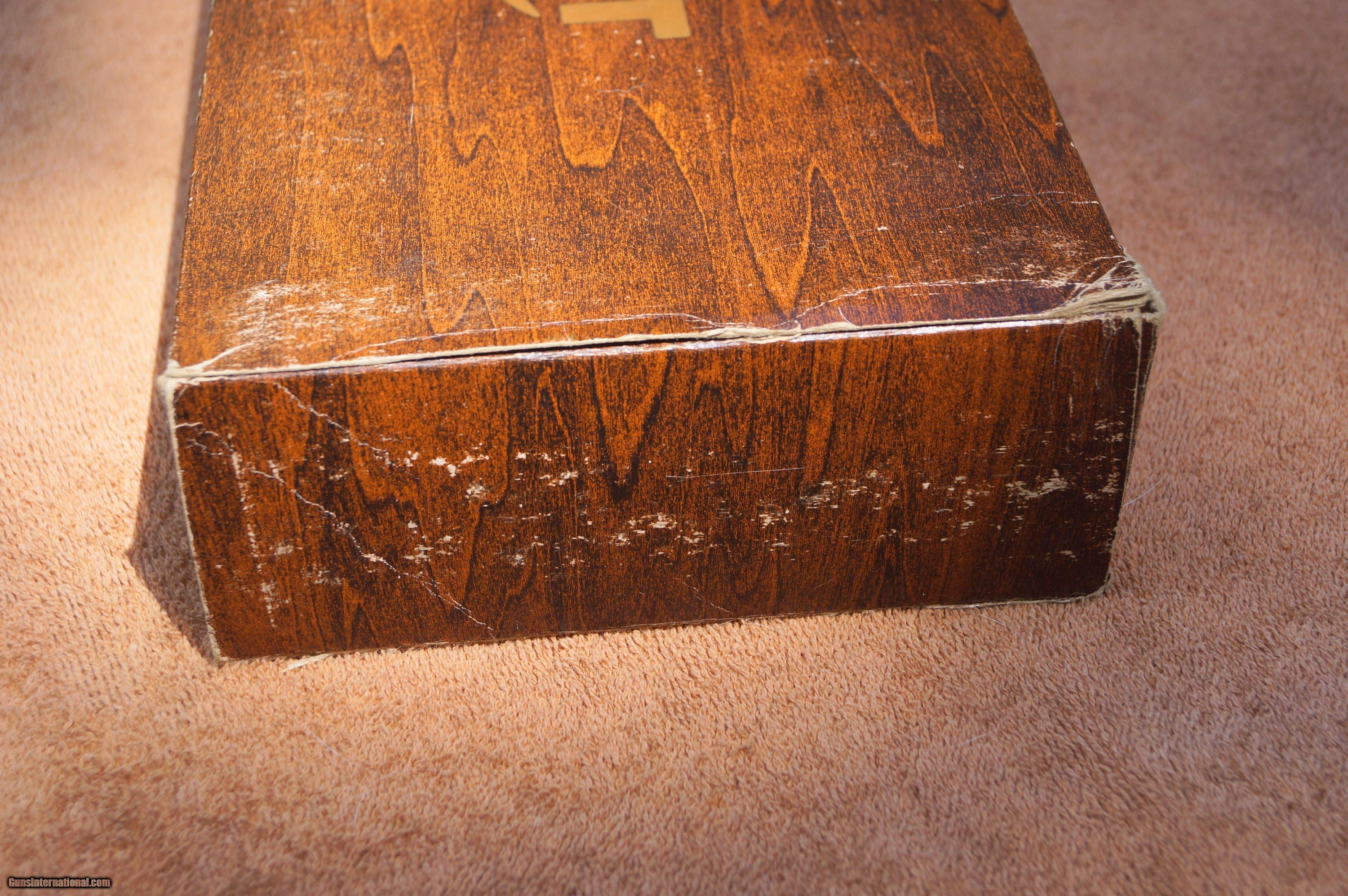 Description: SOLD PENDING FUNDS AND FFL This came out of the estate of retired dentist. He had a wonderful collection of vintage Smiths and Colts, many unfired. I cannot state that this pistol is unfired, but it could pass for it. I forgot to wipe the Rennisance Wax off of the breech block, that is why it looks a little hazy. The slight blue loss on the front hand grip caught the sunlight and makes it look worse than it does when you have the pistol in your hand. It is a dandy. The box has seen better days. The non label end flap is taped on. Also, tap was added to the label end to keep it from working loose. I do not hole an FFL so check with your receiving dealer to see if he will accept the pistol from me. If he won't, my dealer charges $25 to run a gun through his books. Make certain this is legal to own in your local. If it has to come back there will be a charge of $25 in addition to what it costs to ship it. Feel free to ask questions. I can email the pictures to you if you would like to use a program to see more detail. I will not send any pictures by phone. SOLD |