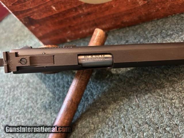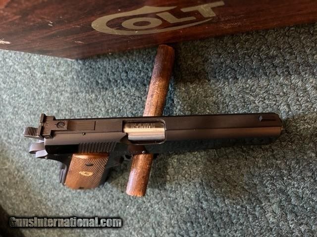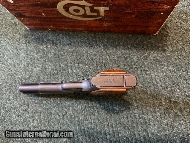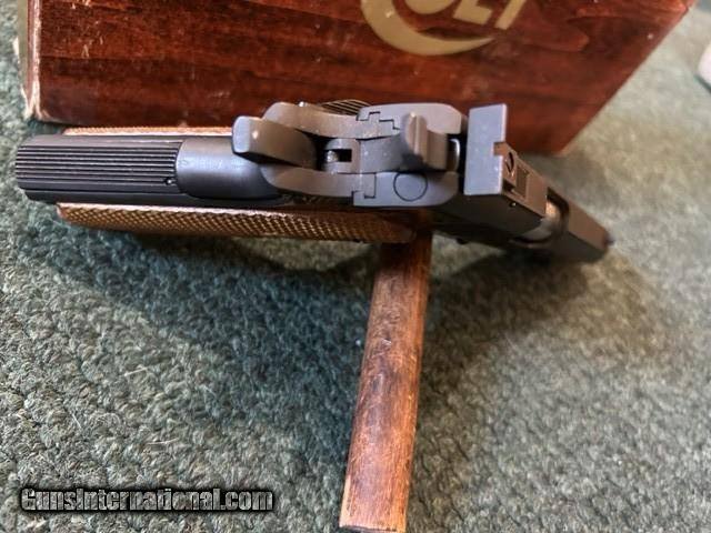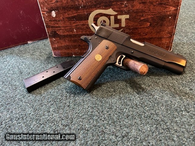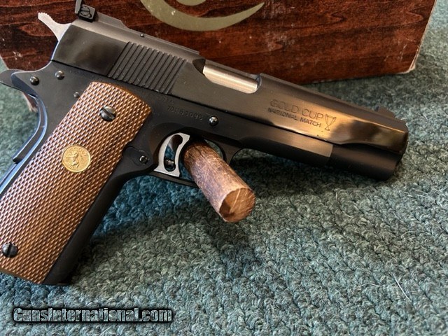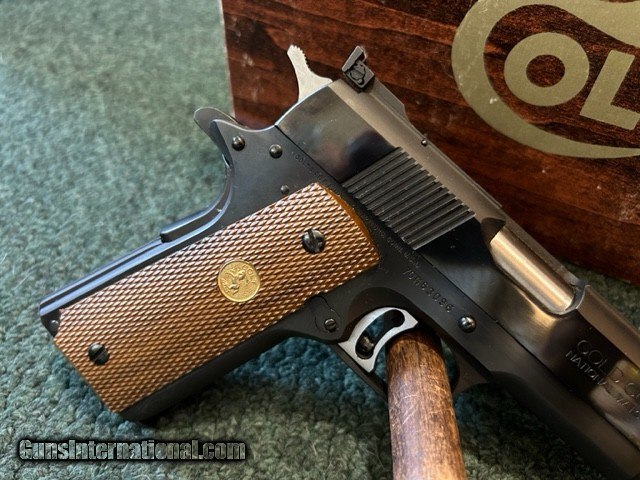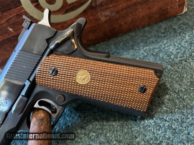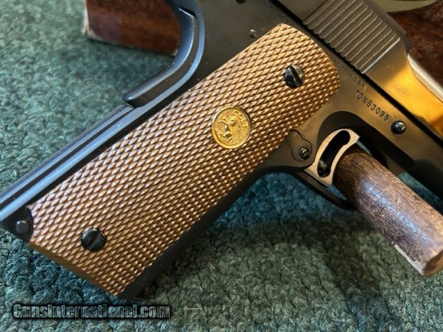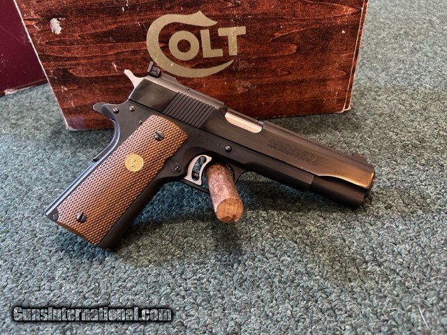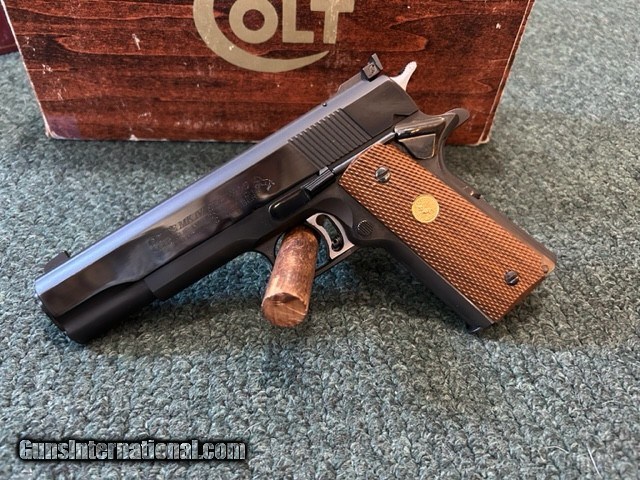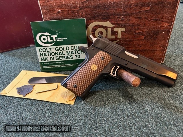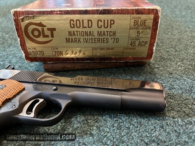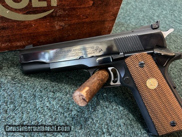 Description: Colt, Gold Cup National Match, Mark IV/Series 70, 45 ACP, 5" barrel, blued finish, adjustable rear sight, checkered walnut grips, new in box. Serial Number 63096. For further information and faster service call John at 941-224-5563. SOLD |