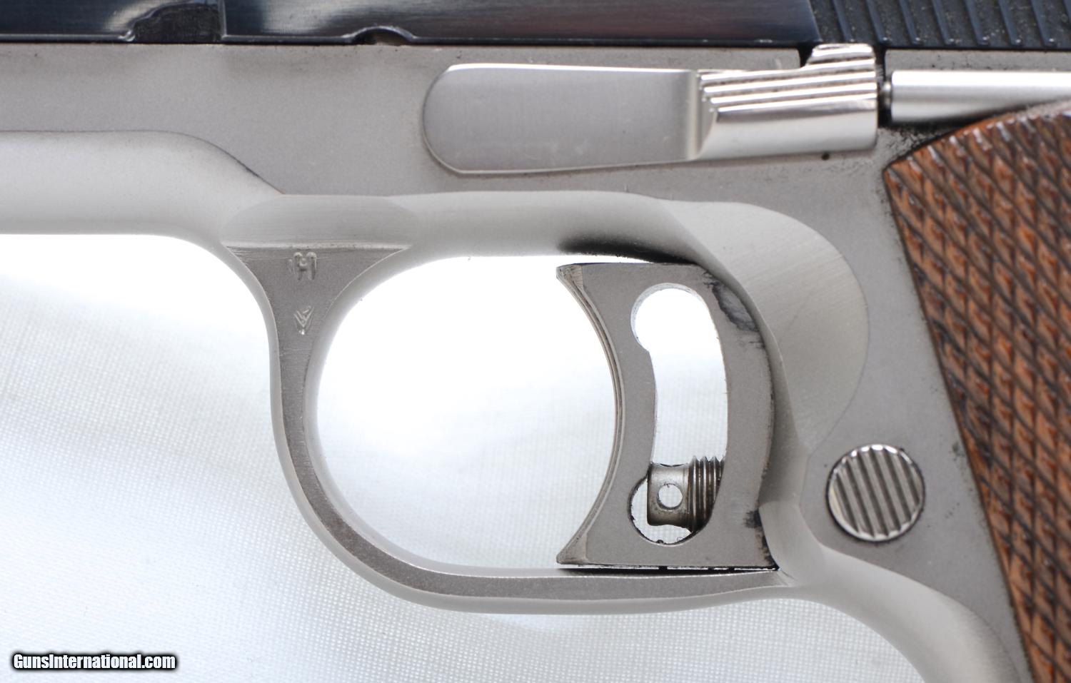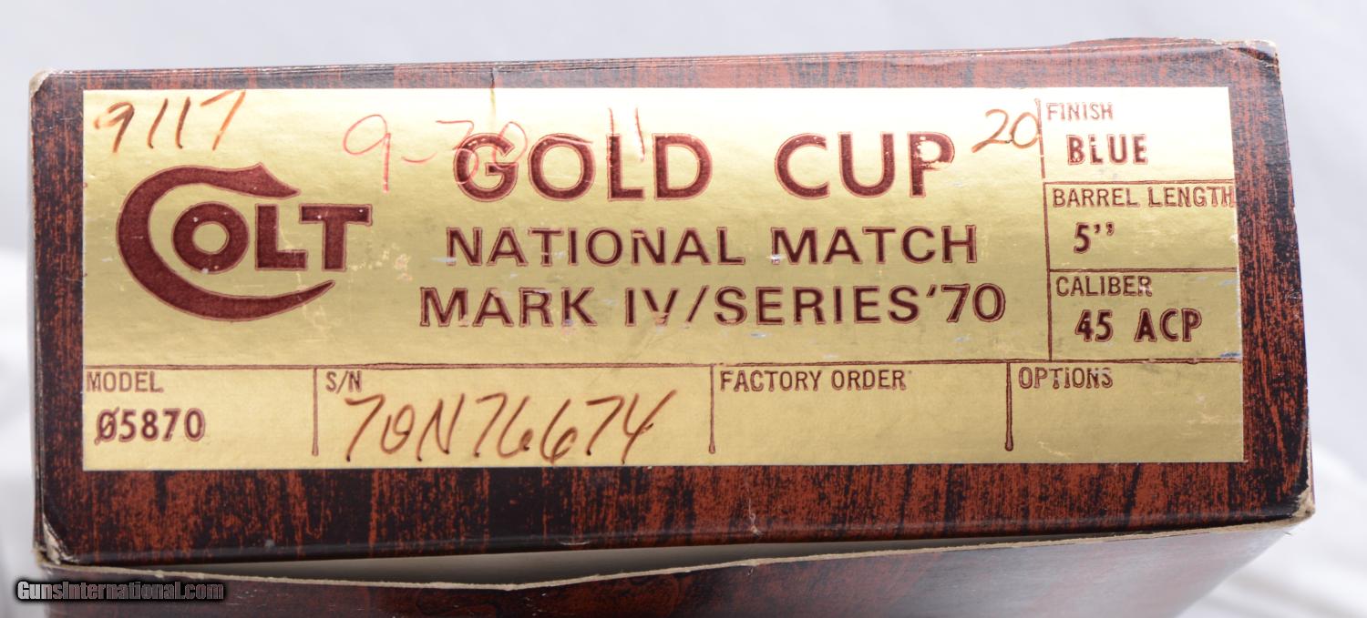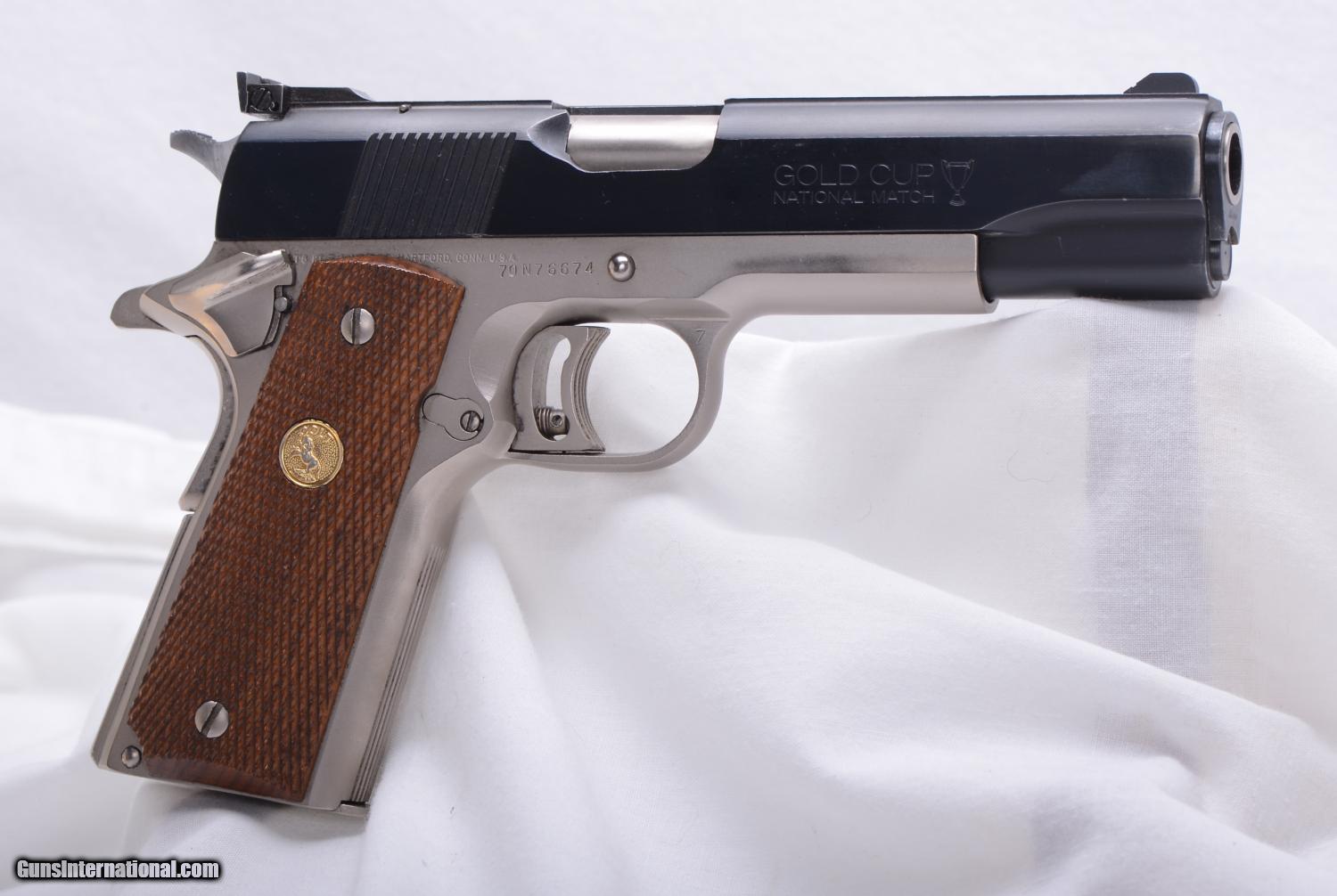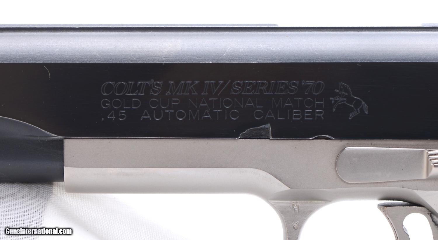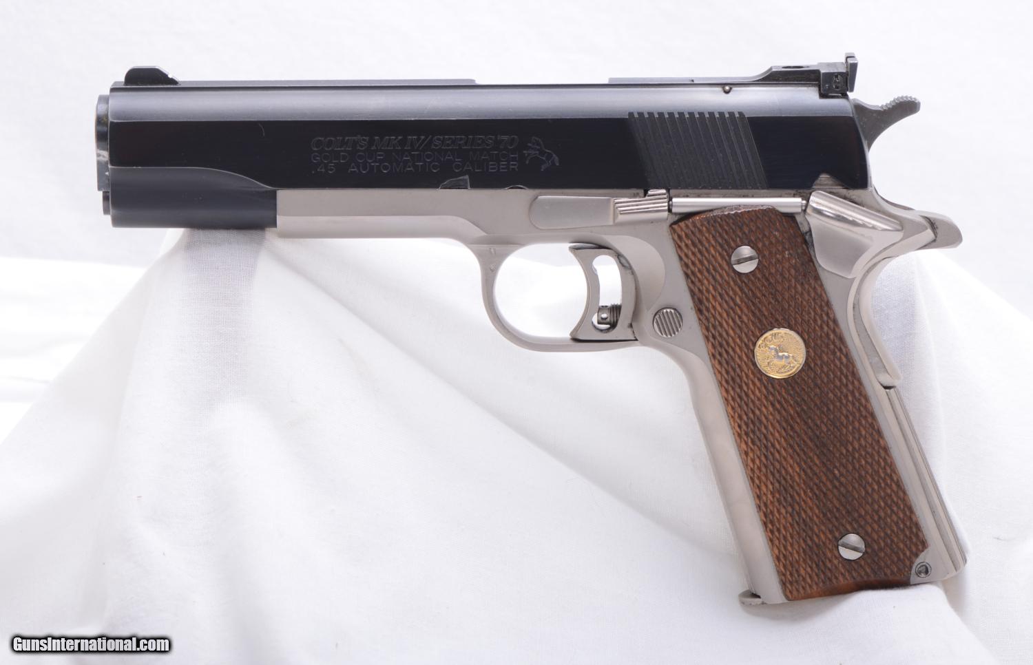 Description: SOLD Colt Gold Cup National Match MK IV Series 70 two-tone .45 acp pistol in the original box with paperwork. This pistol has been shot sparingly and only very minor edge wear from the box is noticeable. Hard to find with all original packing components. The two-tone, the abi-safety, the bushing and the front sight are aftermarket...still a great Gold Cup. SOLD |