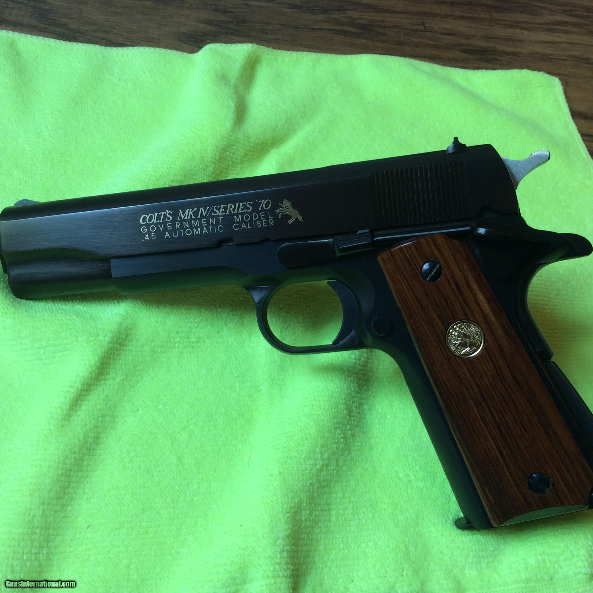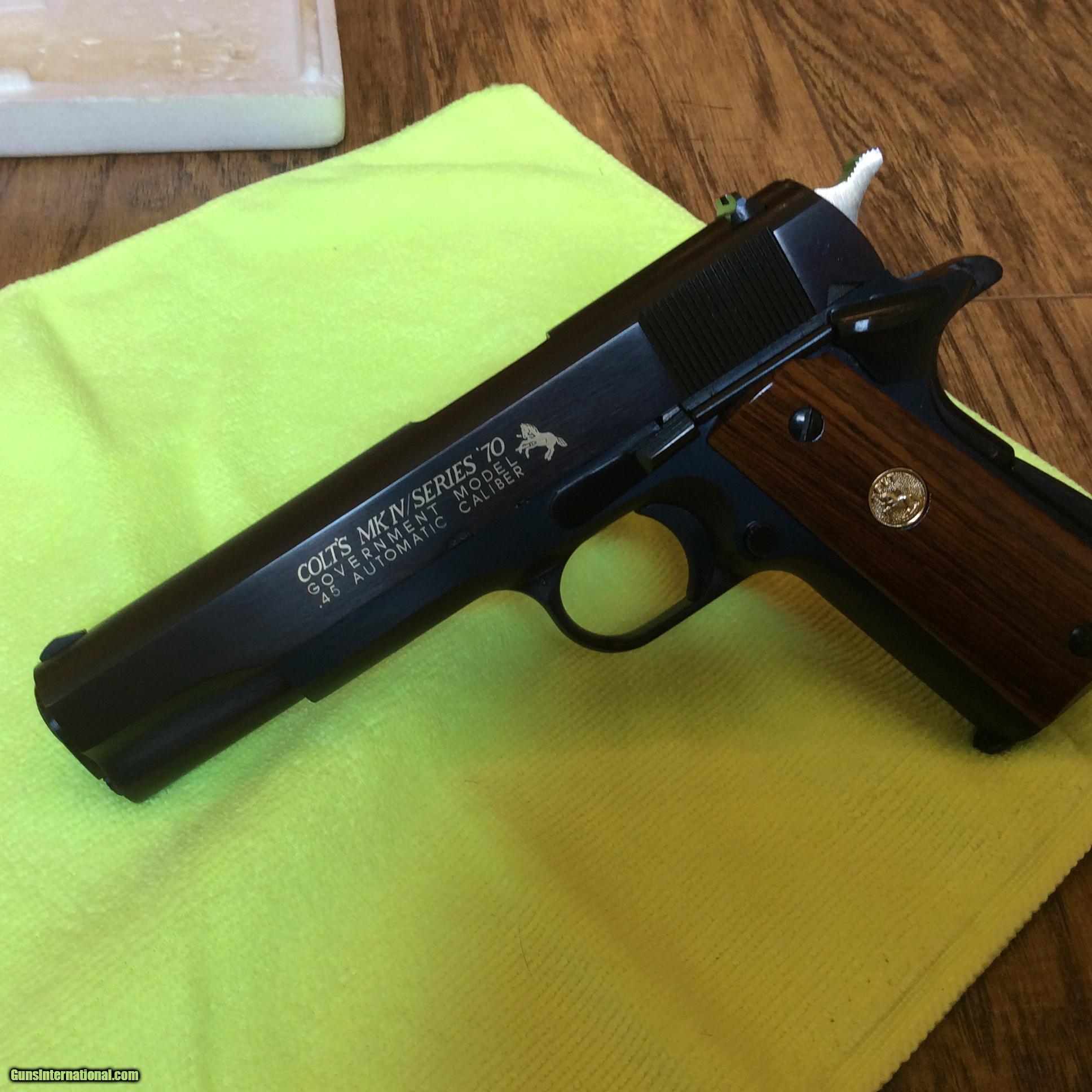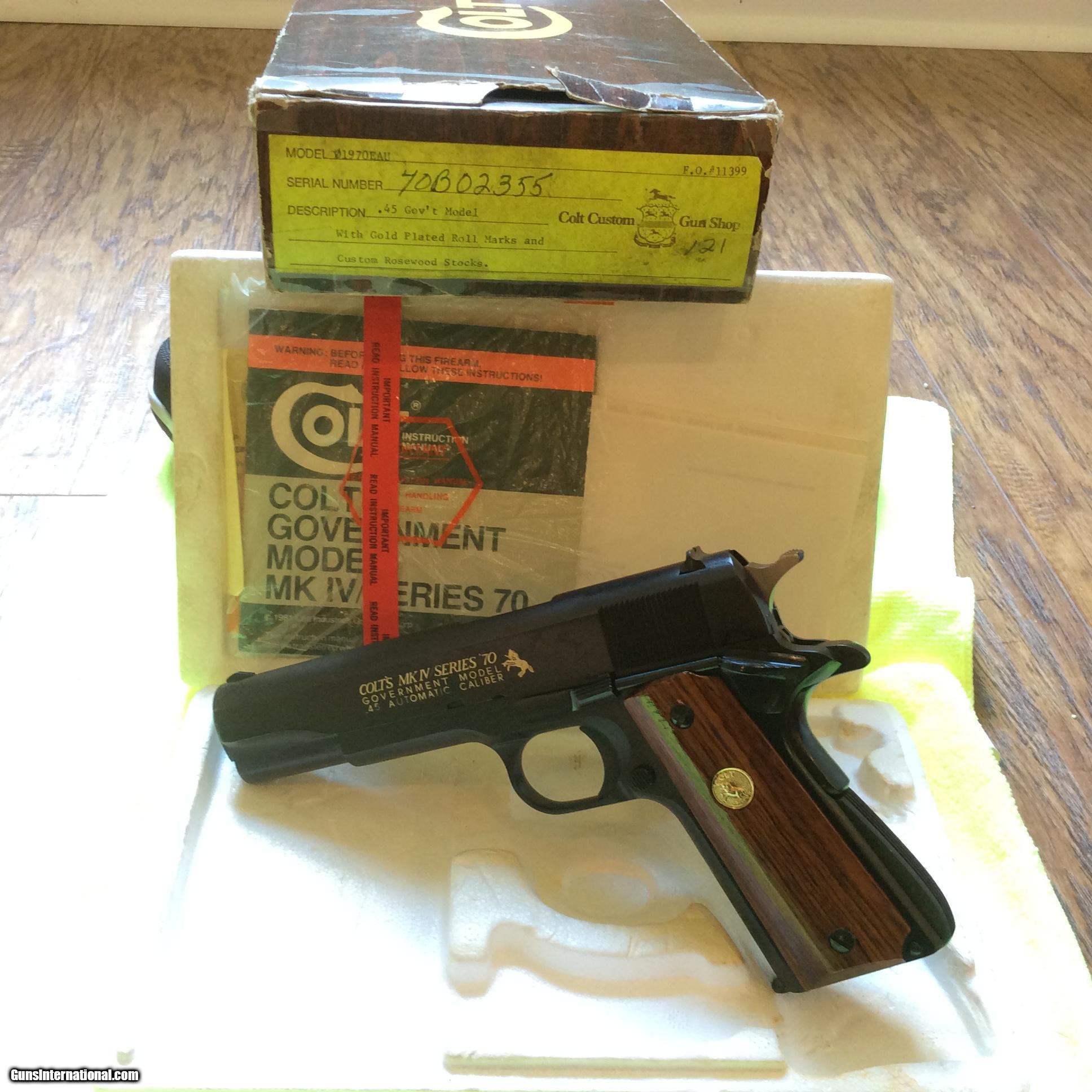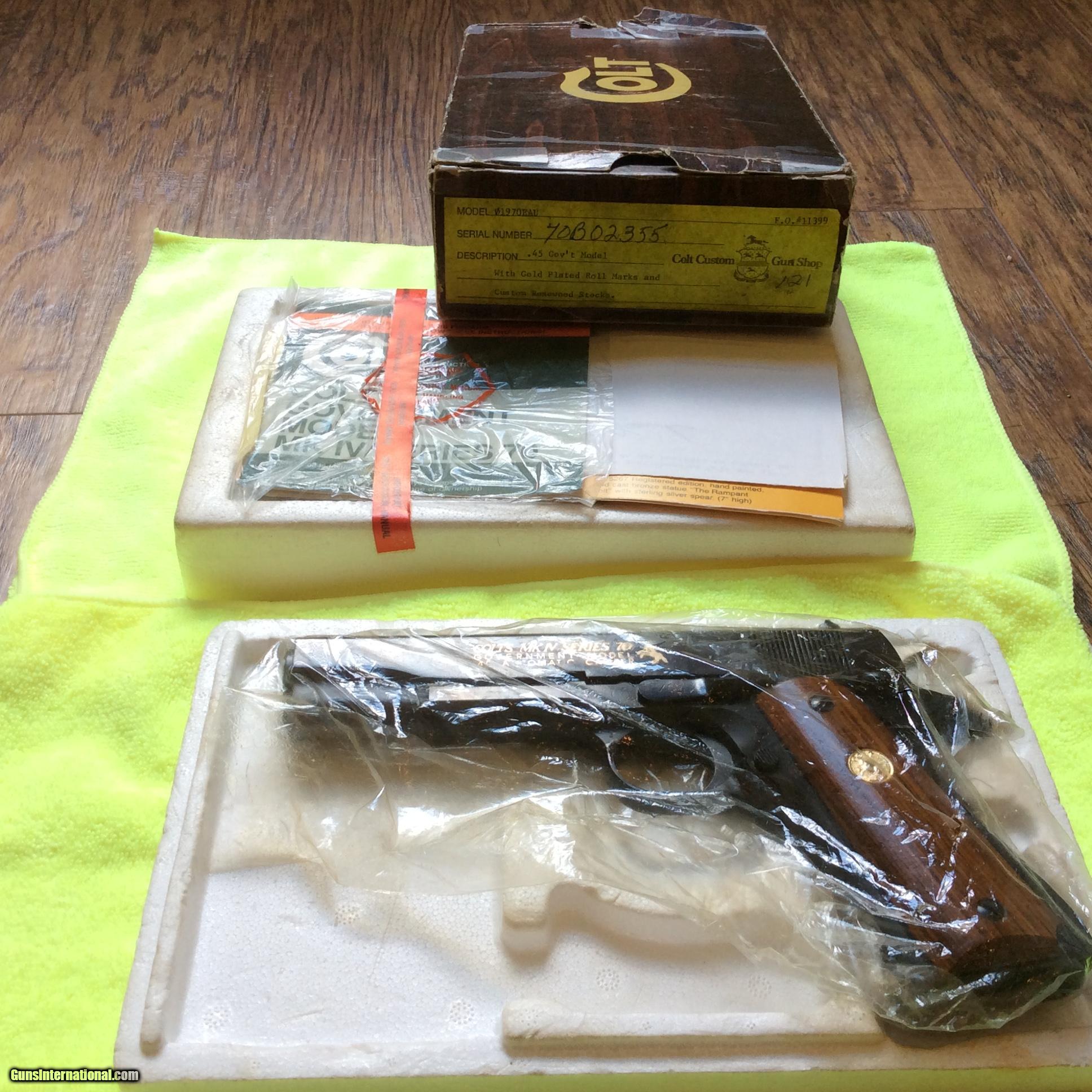 Description: SOLD Colt 70 series MKIV .45 Government Custom Shop. Wow! What a beauty. I am going to say NIB. Does not look like it has ever been racked so I did not rack it either. Comes in the original serialised Colt Custom Shop box labeled Gold Plated Roll Marks with Rosewood stocks. Box has all of the original doucumentation still red taped in place. Perfect! Bluing is extroadinary. Heck, you pay more than this for a new Talo or Lew Horton pimp gun. Ooops, I will be listing some of them too. Shipping ffl to ffl $25. SOLD Manufacturer: Colt Model: Government Custom Shop Caliber Info: .45 ACP Condition: EX Metal Condition: EX Wood Condition: EX Bore Condition: EX |
