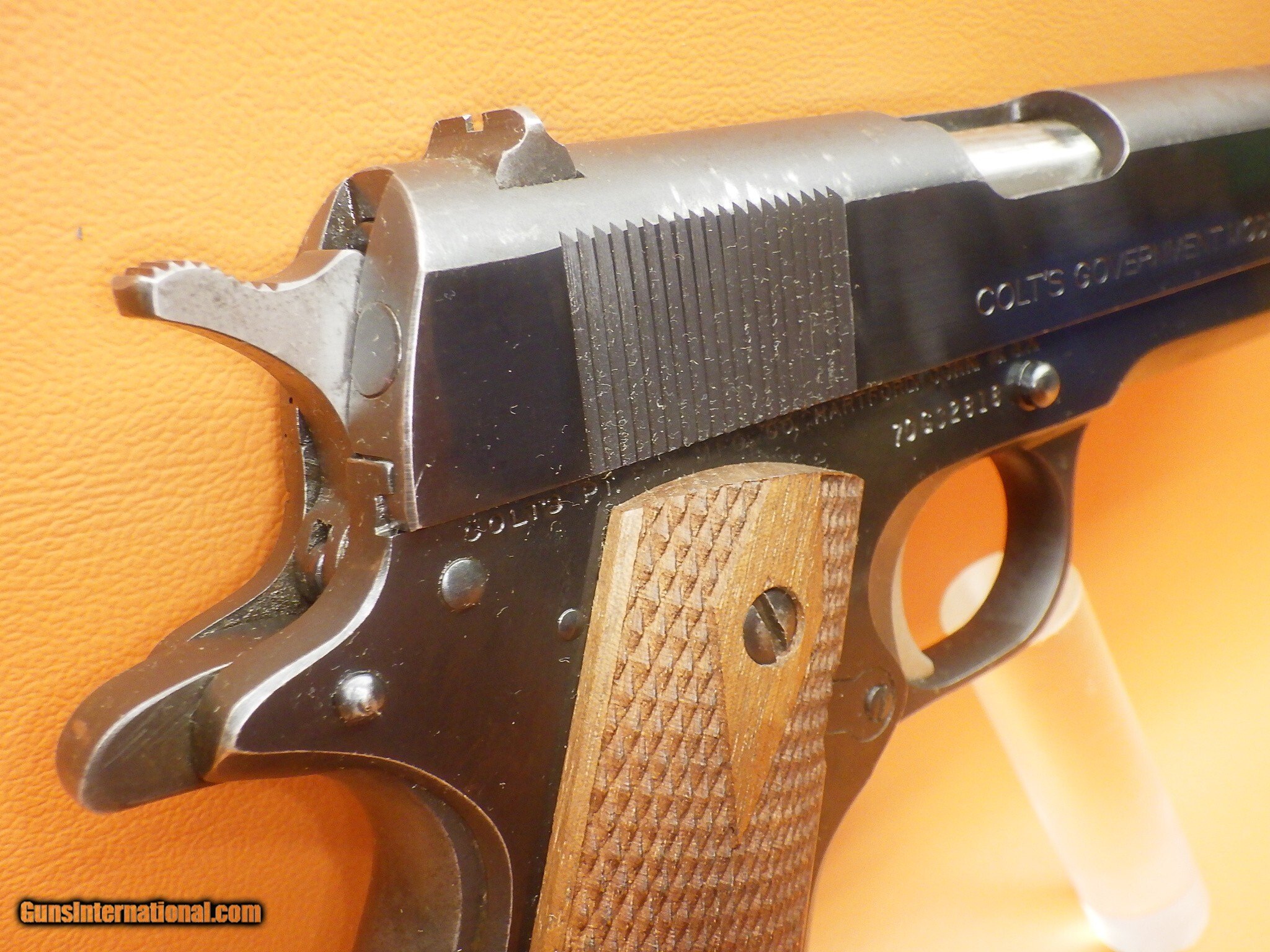 Own a true Colt classic — the Series 70 Government Model, known for its exceptional craftsmanship and smooth single-action trigger. This particular pistol features the original Series 70 collet-style barrel bushing, a design that improves accuracy and lock-up, yet is no longer in production. Its deep Colt factory blued finish, paired with checkered walnut grips, gives it timeless visual appeal, whether displayed or carried. This 1911 offers not only historical value but also reliable performance, making it a standout piece for collectors, 1911 enthusiasts, or shooters looking for the real feel of an all-steel, American-made Colt. With no Series 80 firing pin safety, the clean trigger pull remains faithful to the original design. Increasingly rare on the market, this Colt represents the golden era of 1911 manufacturing — a legacy of quality and function you can hold in your hands. SOLD Handgun Caliber: .45 ACP (.45 Auto) Manufacturer: Colt Model: Government Barrel Length: 5 |