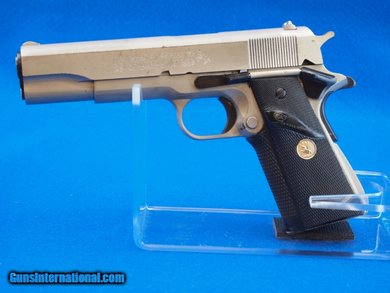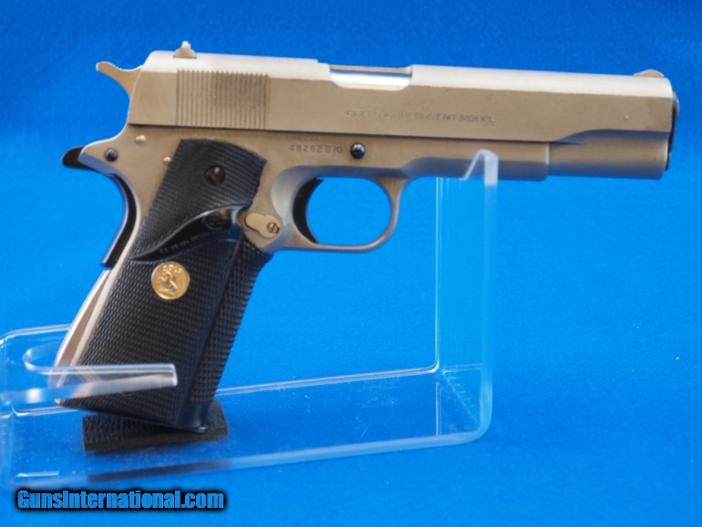 Description: Colt Government Mark IV Series 70 .45 ACP, 5 inch barrel, shiny bore, satin finish, slide shows wear, solid action, original rubber Colt grips. Add 3% for credit cards $25.00 S&H SOLD |