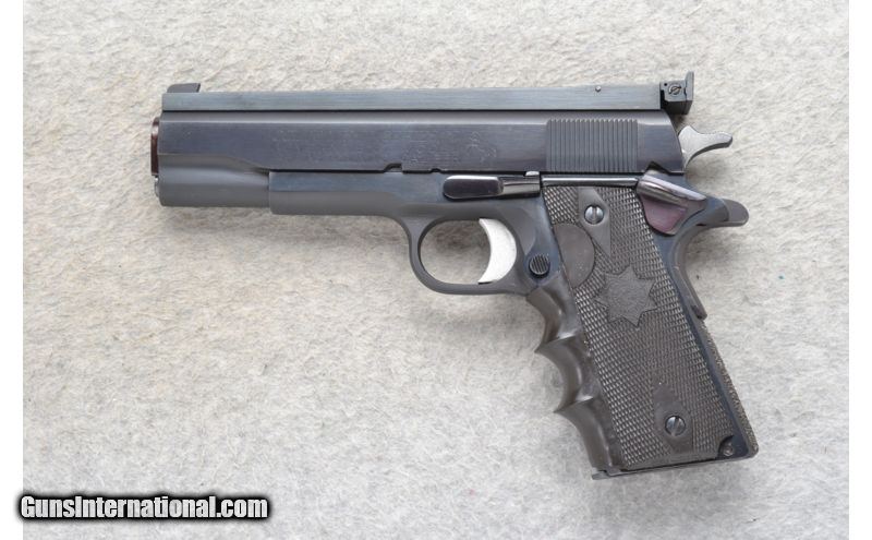 Description: This Colt Model Government MK IV Series 70 is a right hand semi-automatic pistol in .45 ACP Cal. It has a 5 inch barrel with a rear serrated slide. The slide has a solid rib on it with a blade front and adjustable notch rear sight. The diamond checkered b .45 ACP SOLD Caliber Info: .45 ACP Chambers: Semi-Auto 7 round magazine. Metal Condition: Very good with some minor handling marks and wear.. Wood Condition: Grips are very good. Barrels: 5 inch barrel with a rear serrated two tone finish black slide. The slide has a BO-MAR solid rib on it with a front and rear sight. Triggers: Grooved. Adjustable. Solid. Sights: Blade front. Adjustable notch rear. Item Location: Richfield, WI |