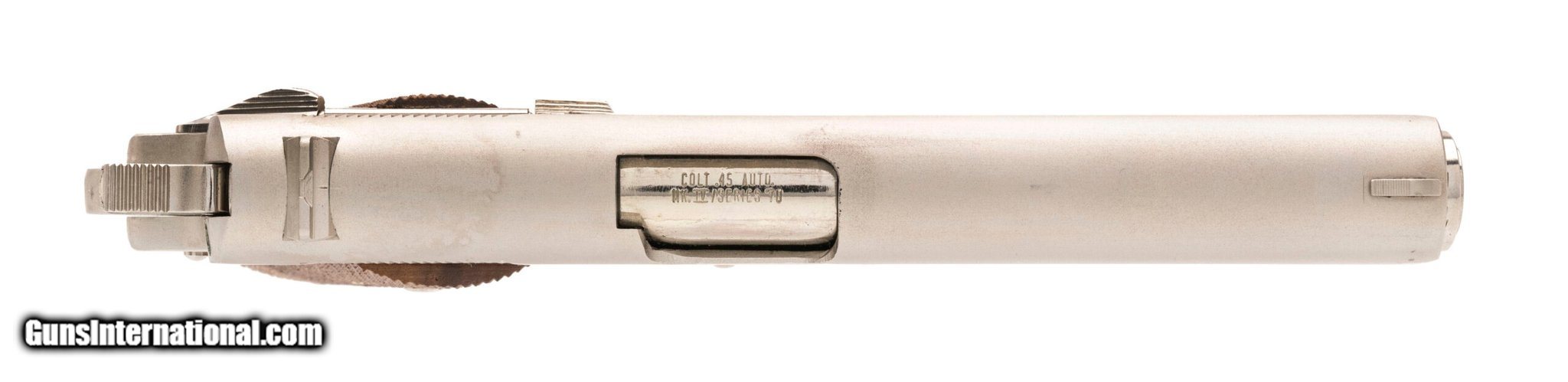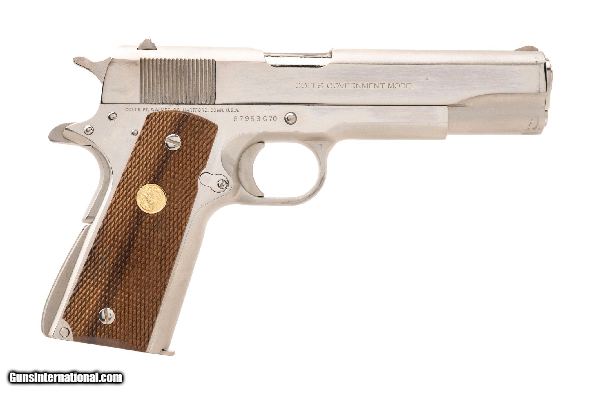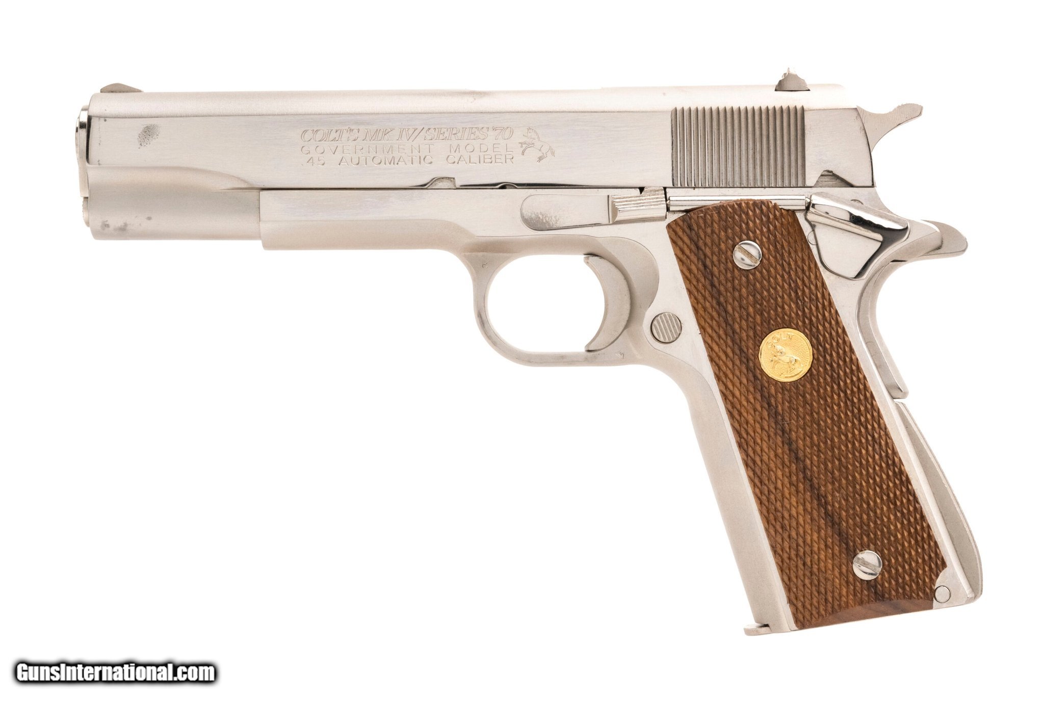 Description: Guns Listing ID: 530896 SN: 87953G70. Made in 1978, .45 Auto with a 5\" barrel. Rare nickel finished government model 1911 pistol with checkered wood grips. Overall condition is very good. (C20965) SOLD Manufacturer: COLT Model: GOVERNMENT MK IV SERIES 70 Caliber Info: .45 ACP Condition: Used - Non-Certified Barrels: 5 Action: SEMI AUTOMATIC Finish: nickel |