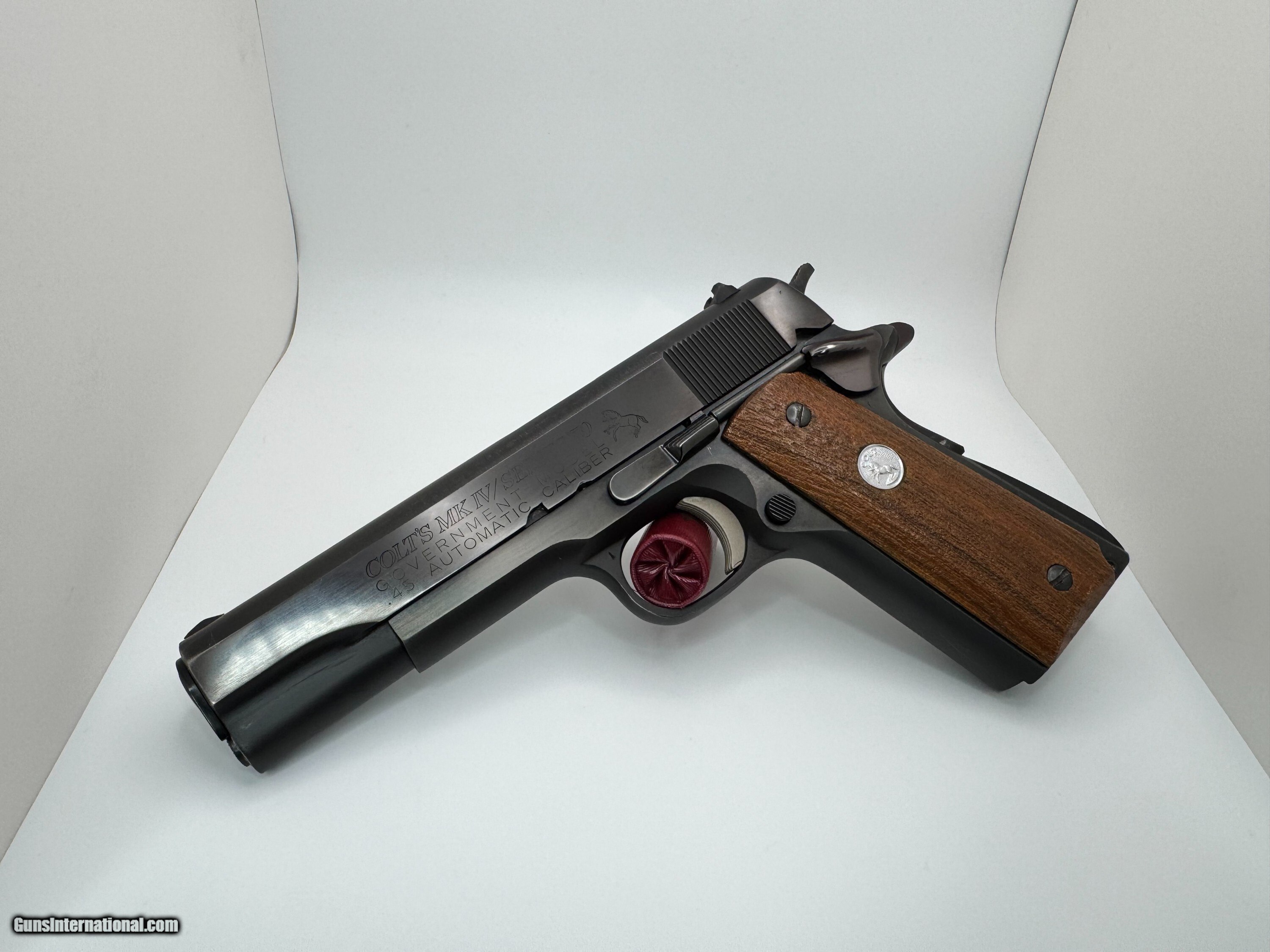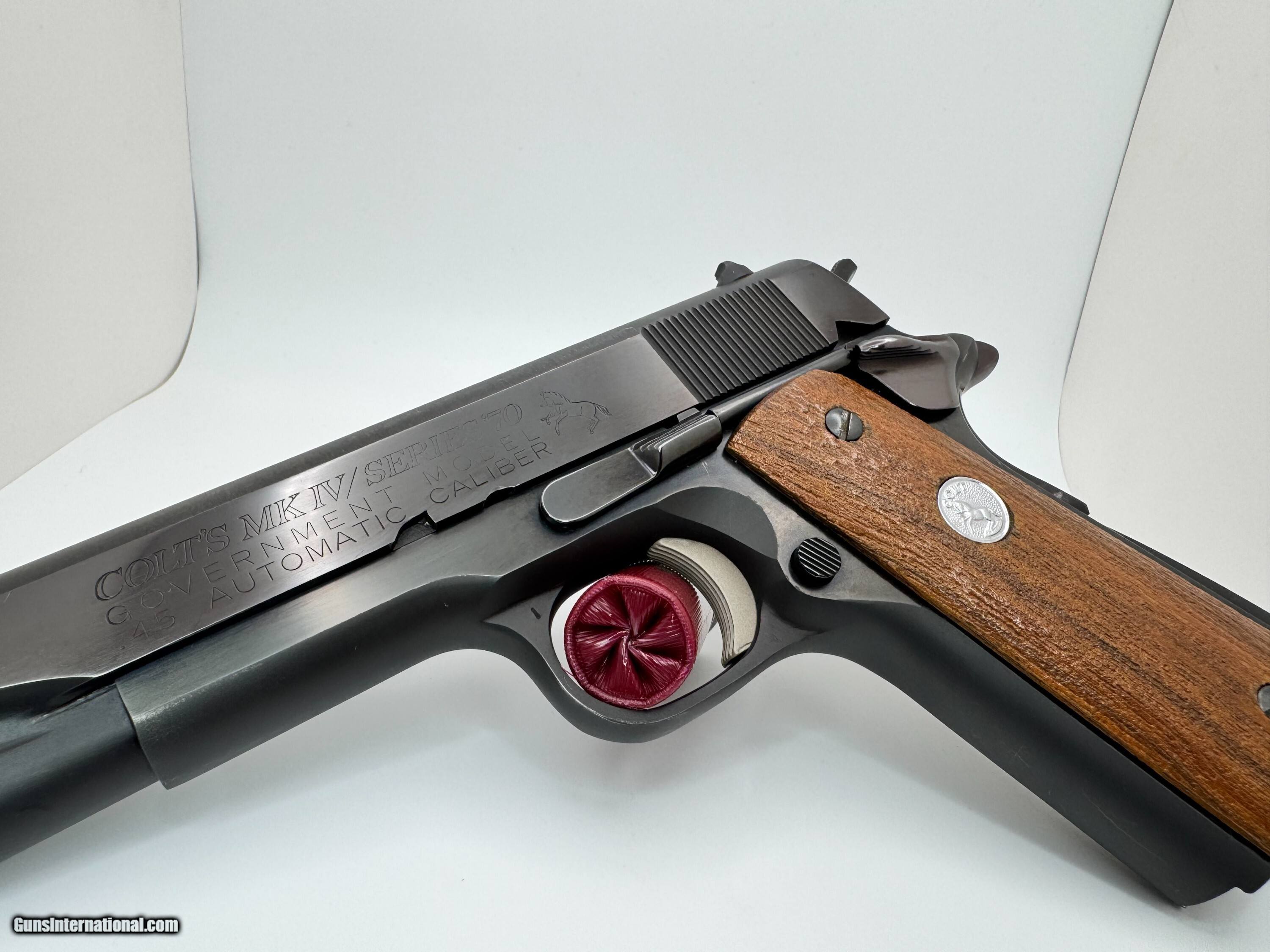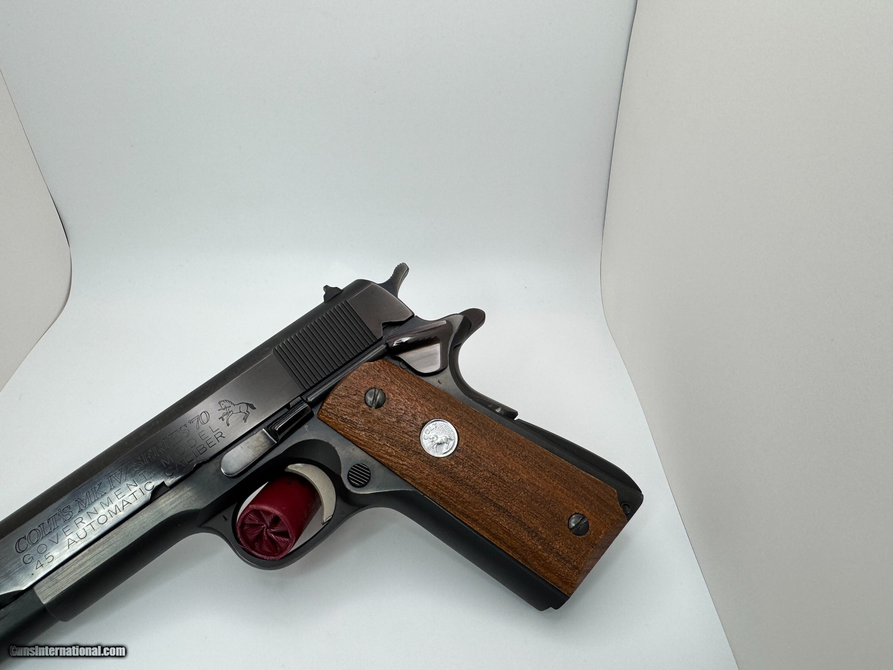 Description: Colt Government MKIV Series 70 Blue manufactured circa 1974. Large roll mark on slide. All original with grips, manual, screwdriver and early 70’s woodgrain vintage original box missing end label. Correct Series 70 magazine marked “Colt .45 Auto.” with drain hole and NO Colt’s logo. Colt’s logo was added to the magazine base in the early 80’s Handgun Caliber: .45 ACP (.45 Auto) Price: $1,450.00 Shipping: $35.00 Contact Seller |