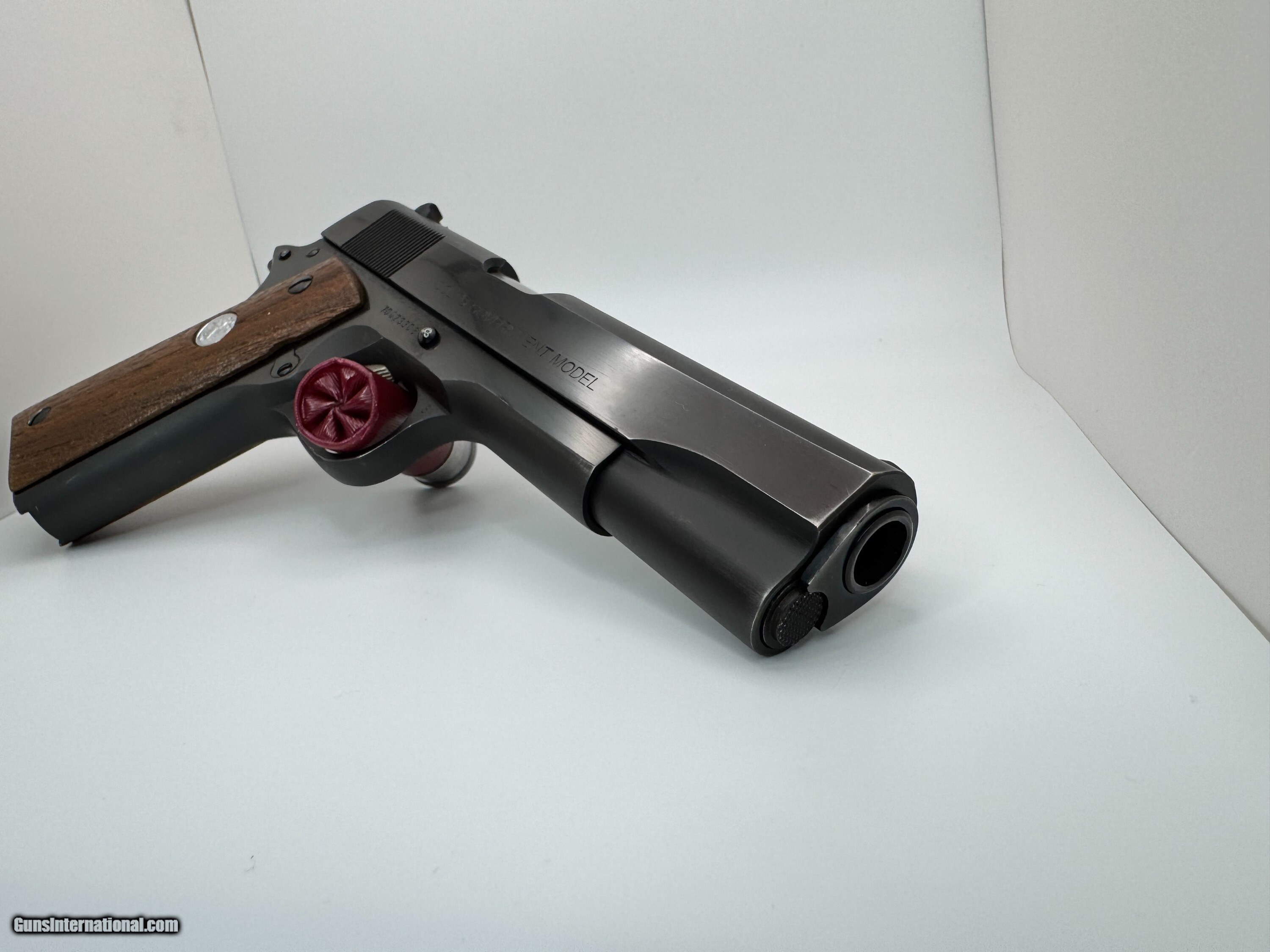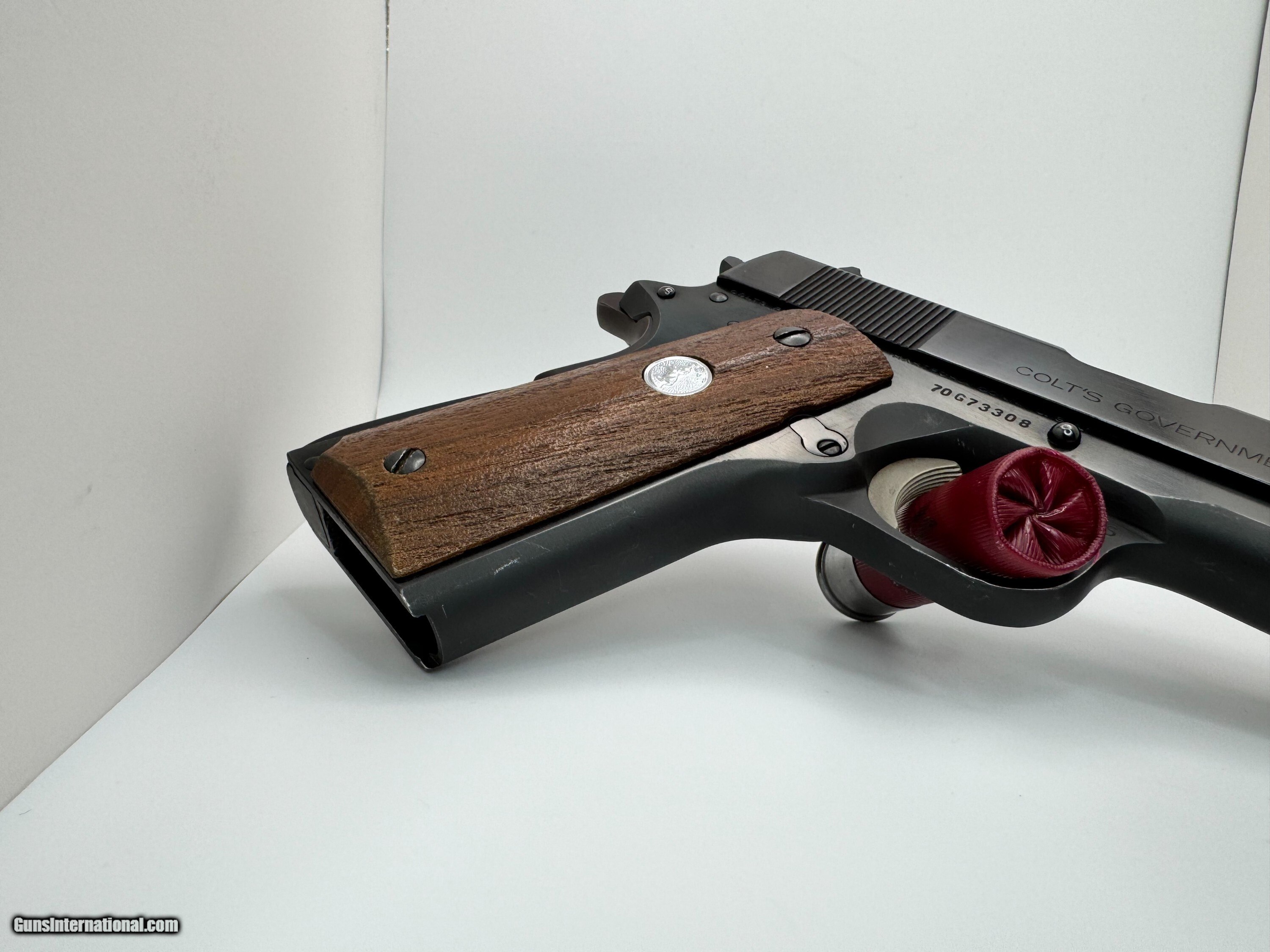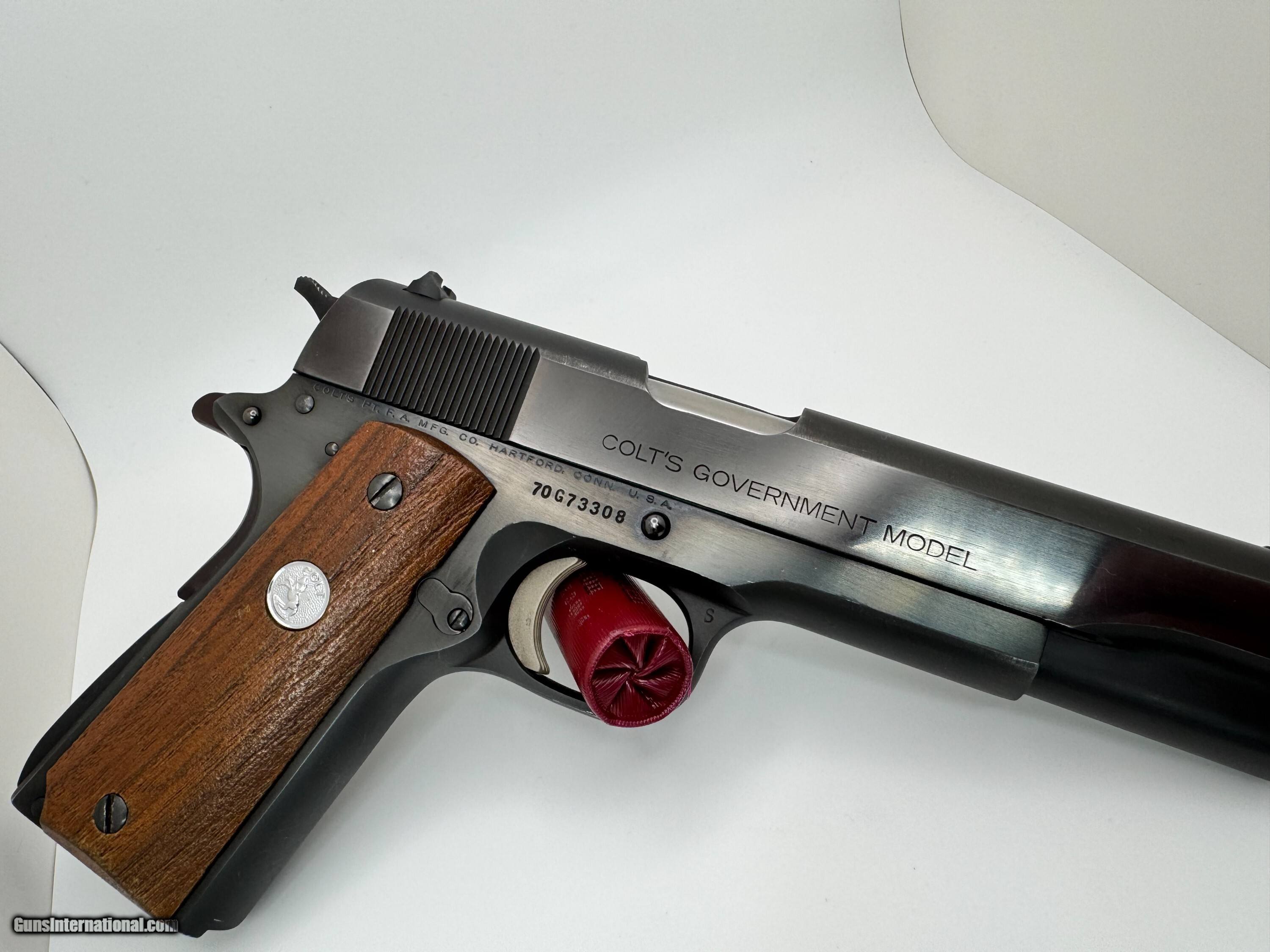 Description: Colt Government MKIV Series 70 Blue manufactured circa 1974. Large roll mark on slide. All original with grips, manual, screwdriver and early 70’s woodgrain vintage original box missing end label. Correct Series 70 magazine marked “Colt .45 Auto.” with drain hole and NO Colt’s logo. Colt’s logo was added to the magazine base in the early 80’s Handgun Caliber: .45 ACP (.45 Auto) Price: $1,450.00 Shipping: $35.00 Contact Seller |