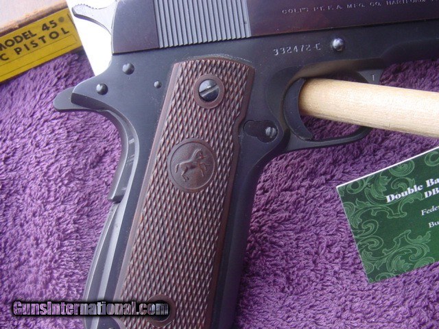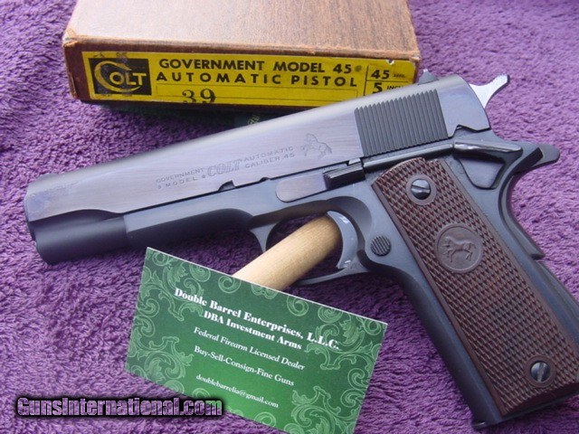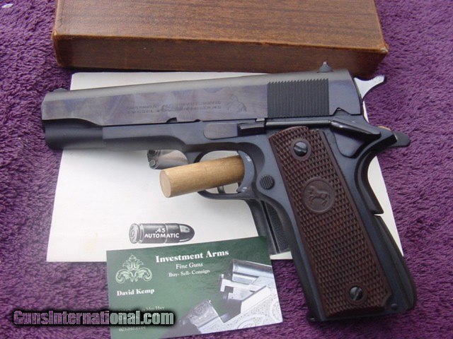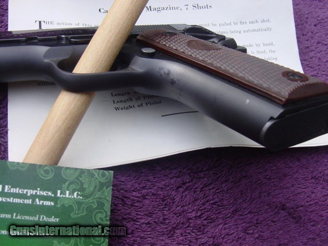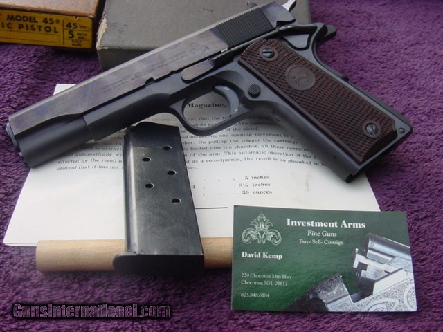 Description: SOLD ! Colt Government Model C Series with box and manual. Real nice Colt Government Model in factory box-serial numbered to the gun underneath in grease pencil as it should be. S/N 3324xx-C ,born 1969. About 97% original blue with some minor freckling on the frontstrap couple operation marks on slide. Slide is now a nice dark plum color. Factory correct brown Colt composite grips Original-factory numbered box with manual-has masking tape label on side showing cust name and ready for p/u 1/3/70. Maybe a late Christmas present to himself Offered at Reduced $1725 plus shipping-should be $35 Insured USPS Priority to FFL dealer- This Colt is C&R qualifed,shipping will be a bit more to C&R as it must go common carrier. Happy to send along more pic’s, answer questions over phone or email. Please email your phone number so I can call back if I miss the call-do not have text sorry, thanks. Be sure to look at my other offerings for more guns,Merkel'sMannlicher Schoenauer's, Drillings, Combo's, Colt Saa's, Colt’s, Ruger’s, Browning’s,Kimber’s, Les Baer, Uberti'sby both Taylor and Cimarron, and Ferlib, Merkel G&H-Arrieta,Beretta,Parker Repro shotguns and other fine guns. Inventory always changing be sure to check with us for any needs. Local New Hampshire Buyer can view/purchase gun in person-after 4473/ NICS check, at Investment Arms business premise in New Hampshire Country Store, Rt 16 Chocorua NH. Please email/call 603.848.6184 Business or (603.323.8200 ) first to be sure its not sold. We also Buy and Consign Guns Payment by bank check, UPS money order-personal check held until clear 10 days. Buyer must provide dealers signed 01 FFL-email or hard copy, I will include a copy of my FFL with shipment. 3 day non firing inspection period(gun must be in same condition if returned)-starts when gun arrives at your dealer, on used guns only-not new guns sorry-they are under factory warranty, buyer pays shipping and insurance both ways if returned. SAFETY NOTICE: Buyer is solely responsible for determining that a used gun is safe to shoot. The firearms offered has been given a visual inspection for collection purpose only. It is a requirement that any used firearm be inspected by a qualified gunsmith before firing. By purchasing the firearm, the buyer agrees to hold seller harmless against damages, injury, or death caused by defective merchandise. SOLD Curio/Relic: Yes |