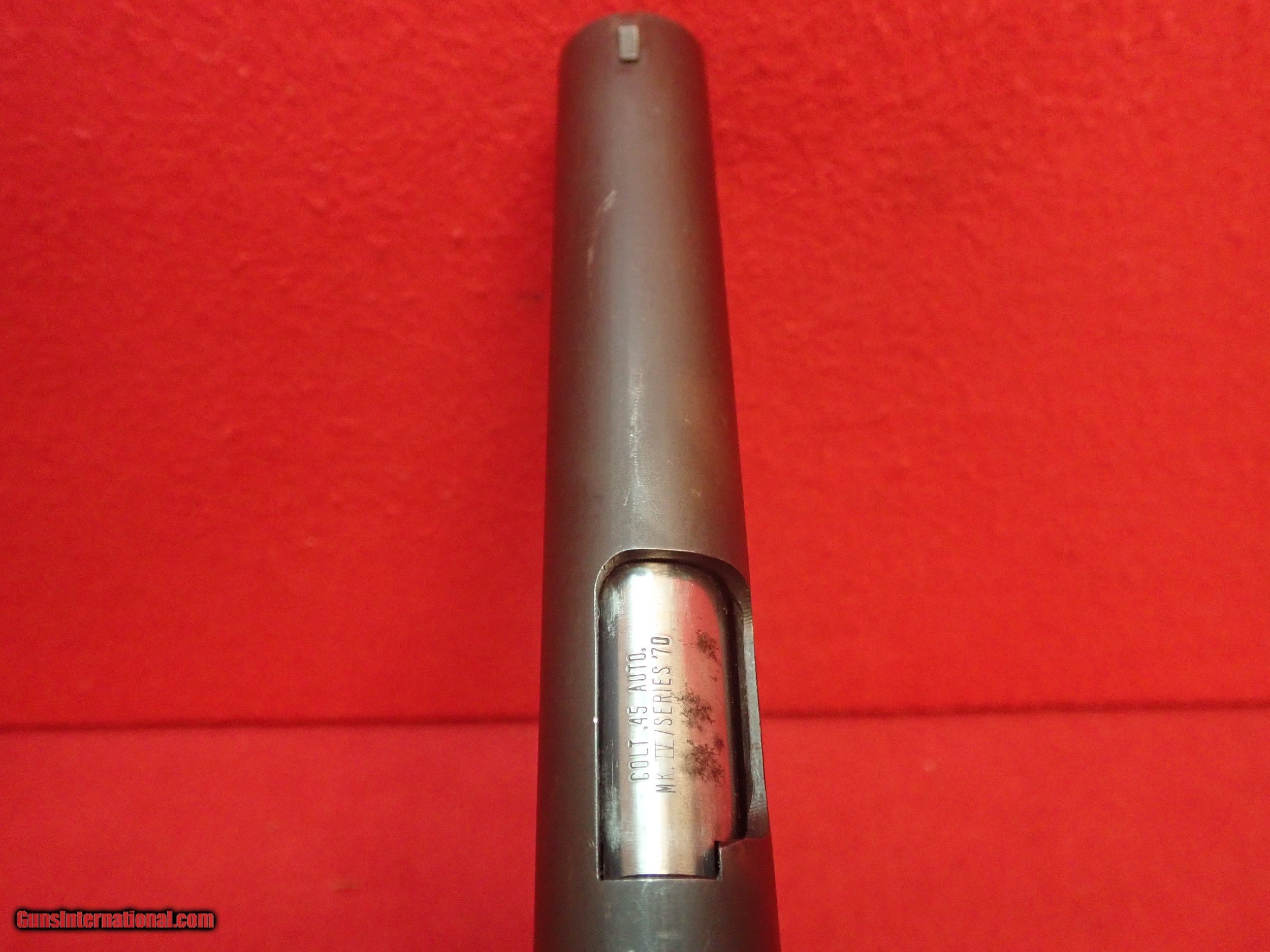 Description: **SOLD**Colt Government Model MKIV Series 70 .45ACP semi automatic pistol, dated to 1976. This pistol features a steel construction with a fine blued finish, checkered walnut grip panels with the Colt brand medallions, and the classic 1911-style design and controls. The pistol has a fixed front sight and a dovetailed rear, in addition to a very crisp and light single action trigger. The pistol is in great condition with some signs of normal use and signs of its' age, as shown in the photos. Please refer to the photos to further assess the condition of the pistol. Includes one Colt branded magazine. A wonderful collectors item, that would certainly turn some heads at the range! No handgun sales in MA.**SOLD** SOLD Manufacturer: Colt Model: MKIV/Series 70 Serial Number: 10642G70 Caliber Info: .45ACP |