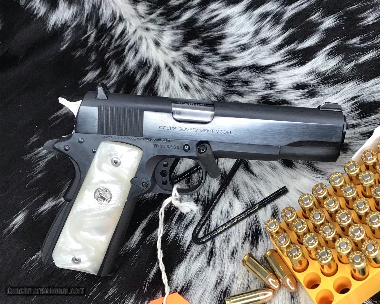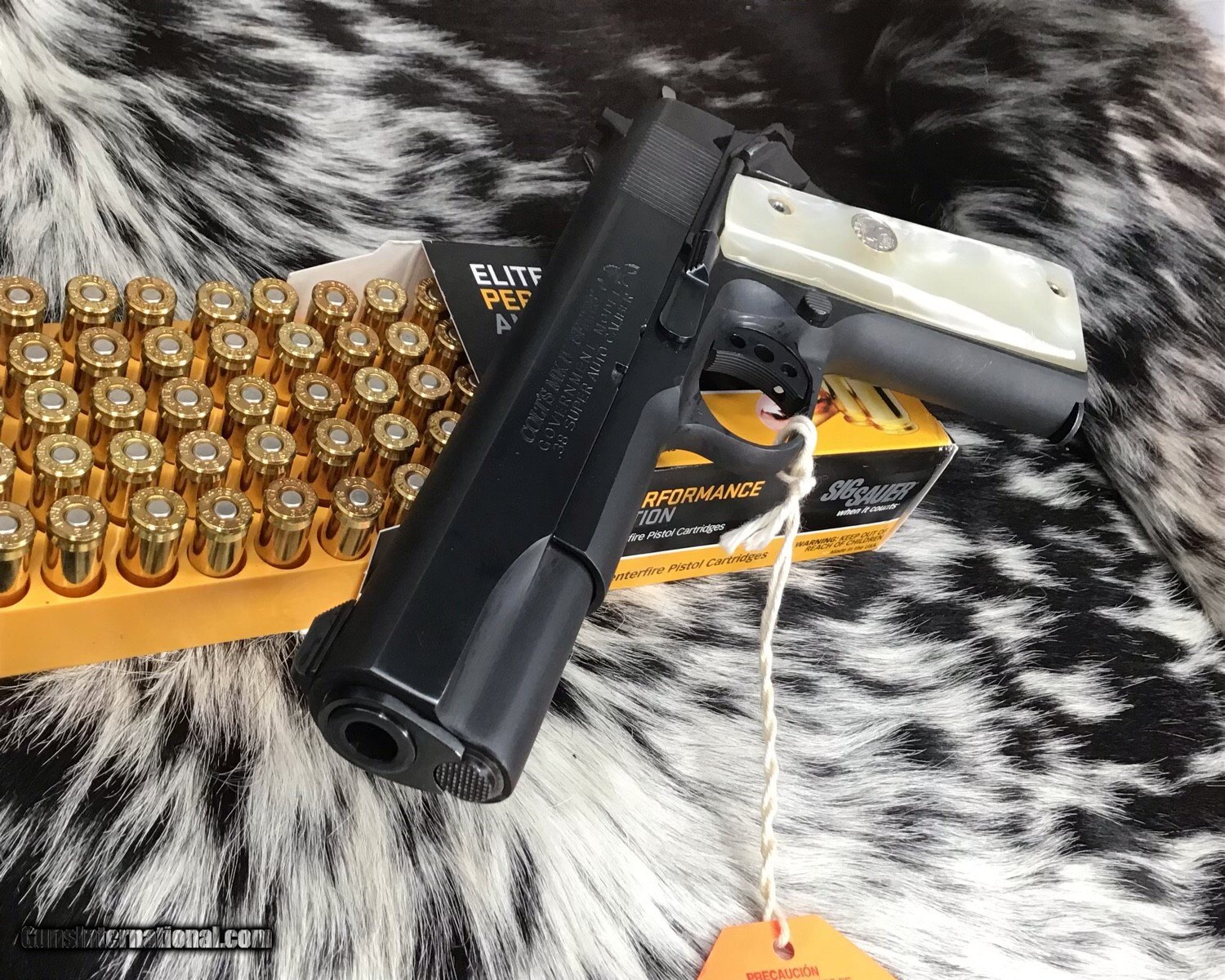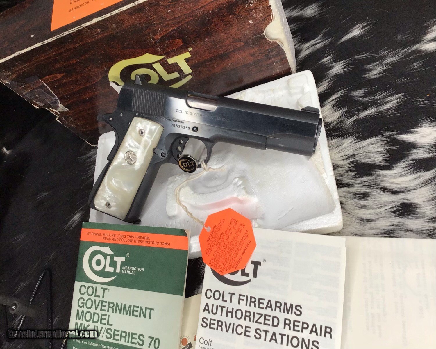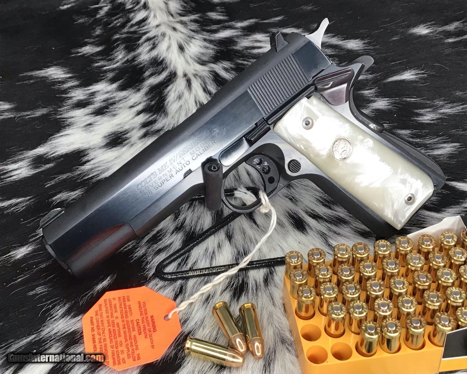 Description: 1980 Colt Government model, 70 Series chambered in .38 Super caliber. Colt Pearlite Grips with Silver Ramparts medallions . 97% or better finish remaining with various light handling marks. Aftermarket sights with White dots. Box is very good with normal age related distress and heavy rubbing to corners. 1 apron missing. A very nice 70 serial in the desirable .38 Super caliber. Add 3% if paying with credit card. God Bless America from a proud American, and a Viet Nam Vet , thankful for our freedoms.. paid for by the Blood ,Sweat and Tears of our brave men and women in uniform. Ten Below Firearms is a Veteran owned and operated business. We specialize in out of production models of high quality firearms. We love to ship! If you are out of state or can't make it to our store, just give us a call! Handguns normally ship for $30 and Long guns for $40 to $55 for extra length long guns. That's 2-3 day USPS Priority shipping, Delivery conformation and with tracking number. Optional Postal insurance is additional $1.50 per $100 and highly recommended. We are OPEN BY APPOINTMENT ONLY FOR IN PERSON VISITS. SOLD Handgun Caliber: .38 Super Auto Manufacturer: Colt Model: 1911 70 Series Serial Number: 70S36359 Barrel Length: 5 inch Condition: Very good Metal Condition: Very good Bore Condition: Very good Action: Single action semi-auto Finish: Blued Manufacture Date: 1980 |