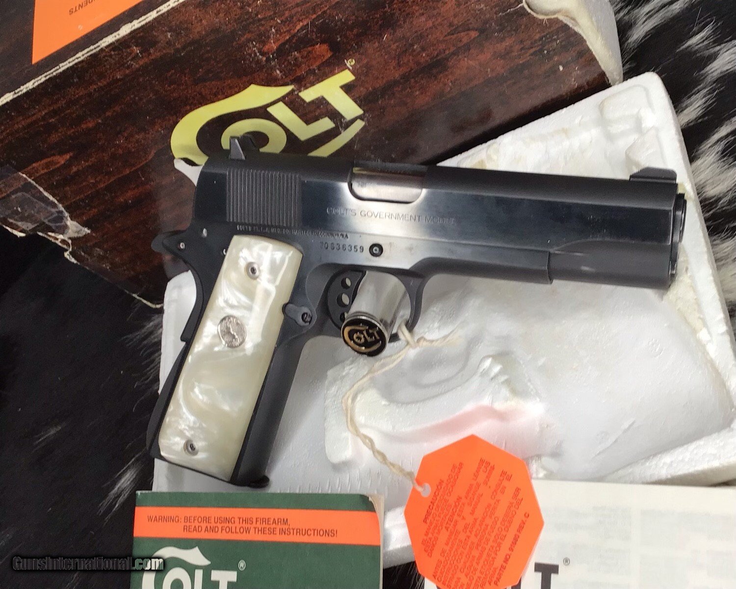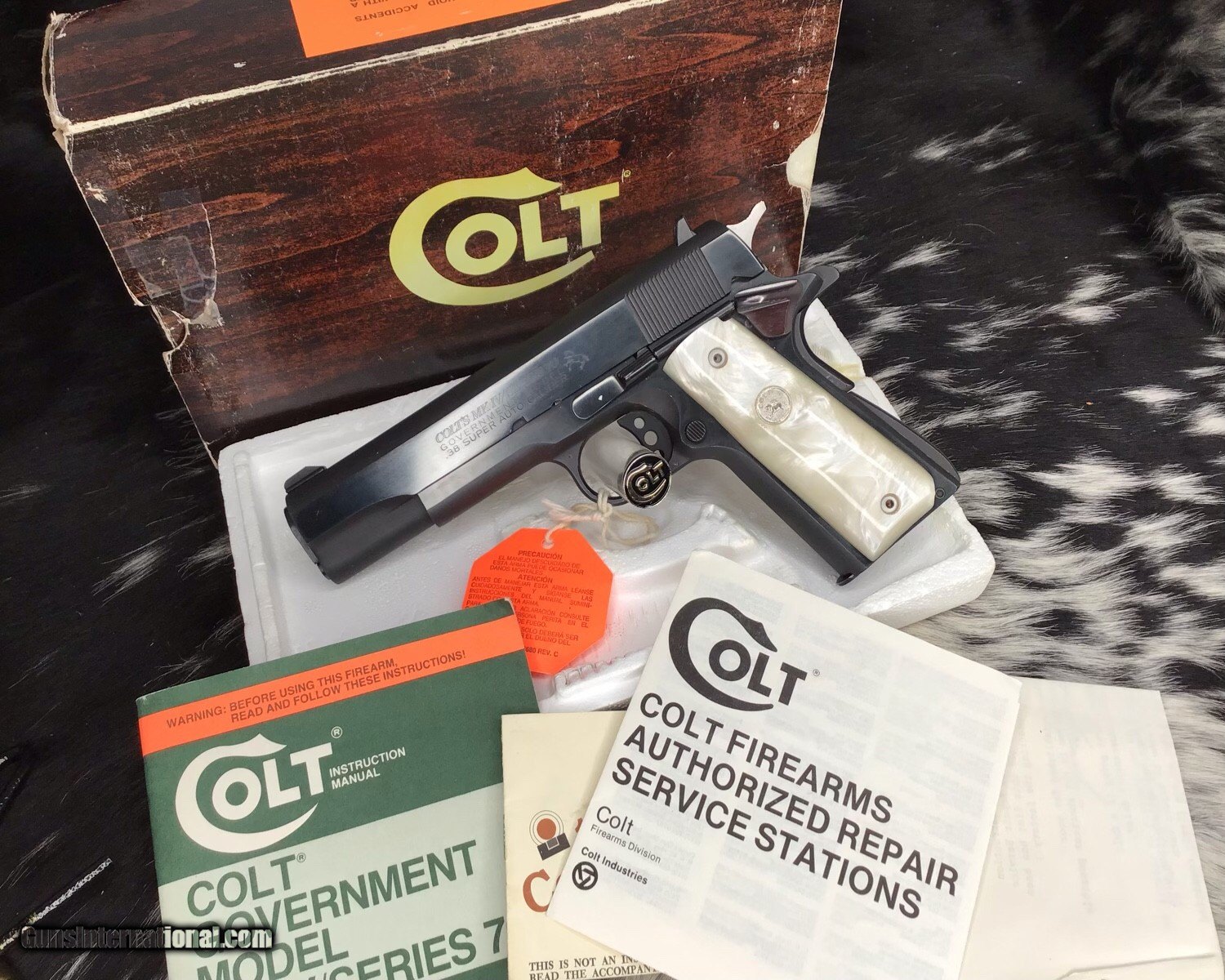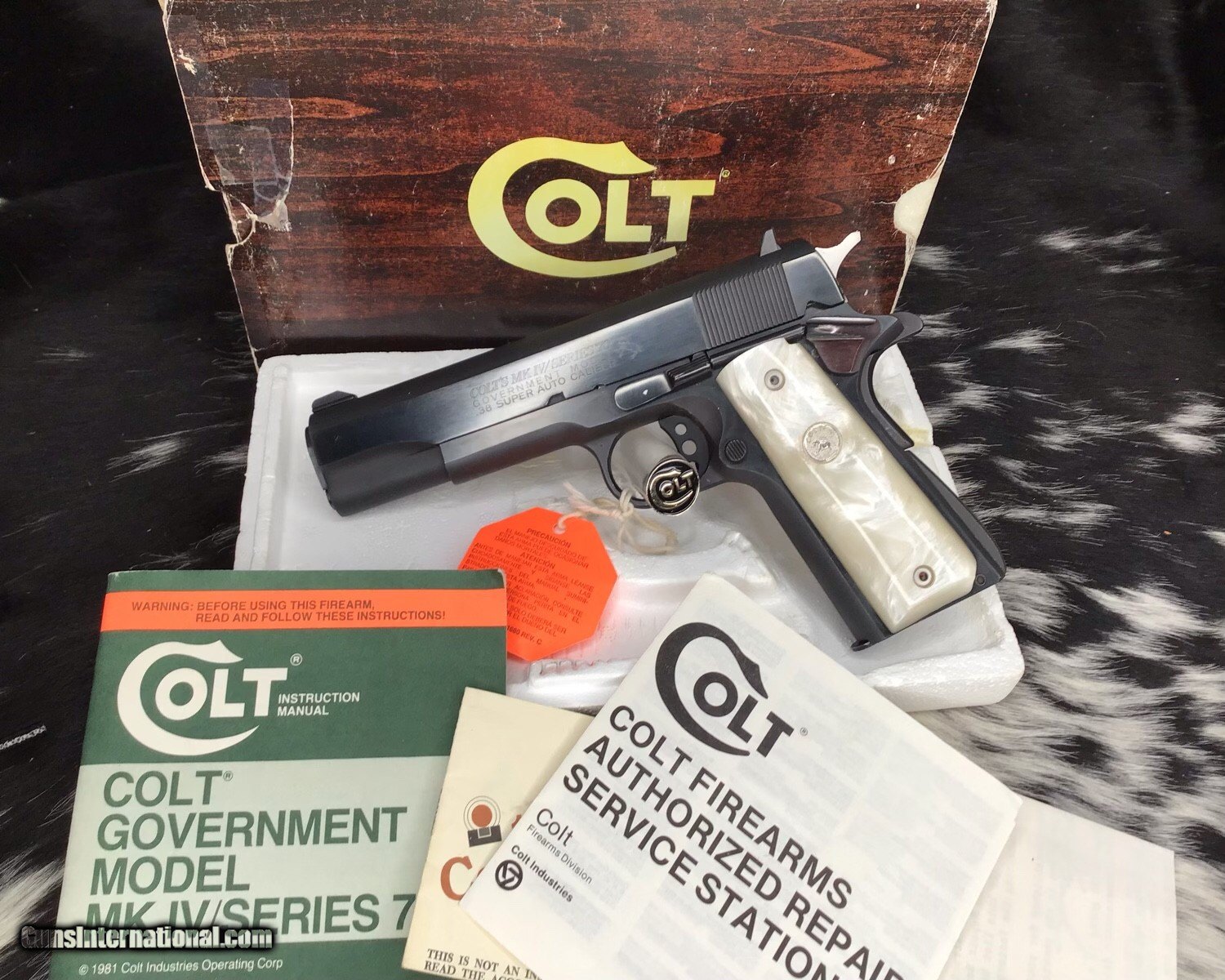 Description: 1980 Colt Government model, 70 Series chambered in .38 Super caliber. Colt Pearlite Grips with Silver Ramparts medallions . 97% or better finish remaining with various light handling marks. Aftermarket sights with White dots. Box is very good with normal age related distress and heavy rubbing to corners. 1 apron missing. A very nice 70 serial in the desirable .38 Super caliber. Add 3% if paying with credit card. God Bless America from a proud American, and a Viet Nam Vet , thankful for our freedoms.. paid for by the Blood ,Sweat and Tears of our brave men and women in uniform. Ten Below Firearms is a Veteran owned and operated business. We specialize in out of production models of high quality firearms. We love to ship! If you are out of state or can't make it to our store, just give us a call! Handguns normally ship for $30 and Long guns for $40 to $55 for extra length long guns. That's 2-3 day USPS Priority shipping, Delivery conformation and with tracking number. Optional Postal insurance is additional $1.50 per $100 and highly recommended. We are OPEN BY APPOINTMENT ONLY FOR IN PERSON VISITS. SOLD Handgun Caliber: .38 Super Auto Manufacturer: Colt Model: 1911 70 Series Serial Number: 70S36359 Barrel Length: 5 inch Condition: Very good Metal Condition: Very good Bore Condition: Very good Action: Single action semi-auto Finish: Blued Manufacture Date: 1980 |