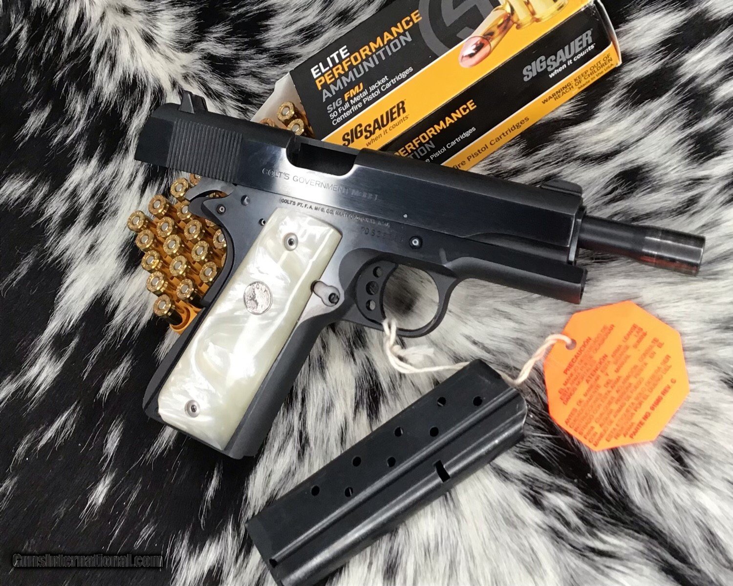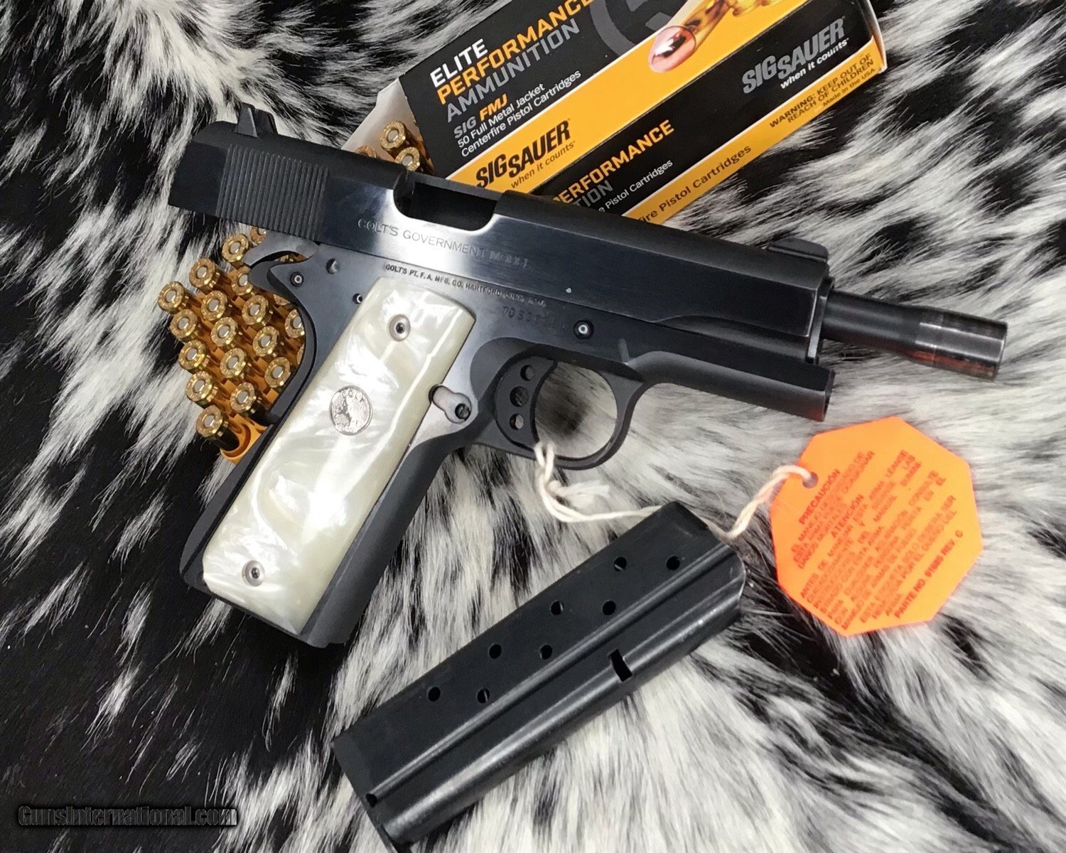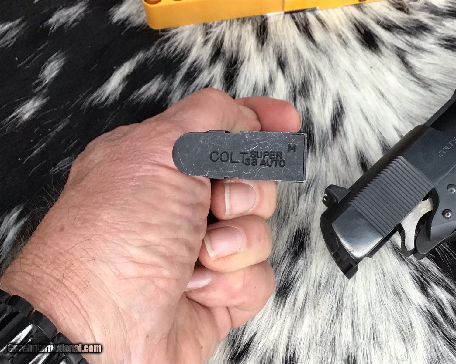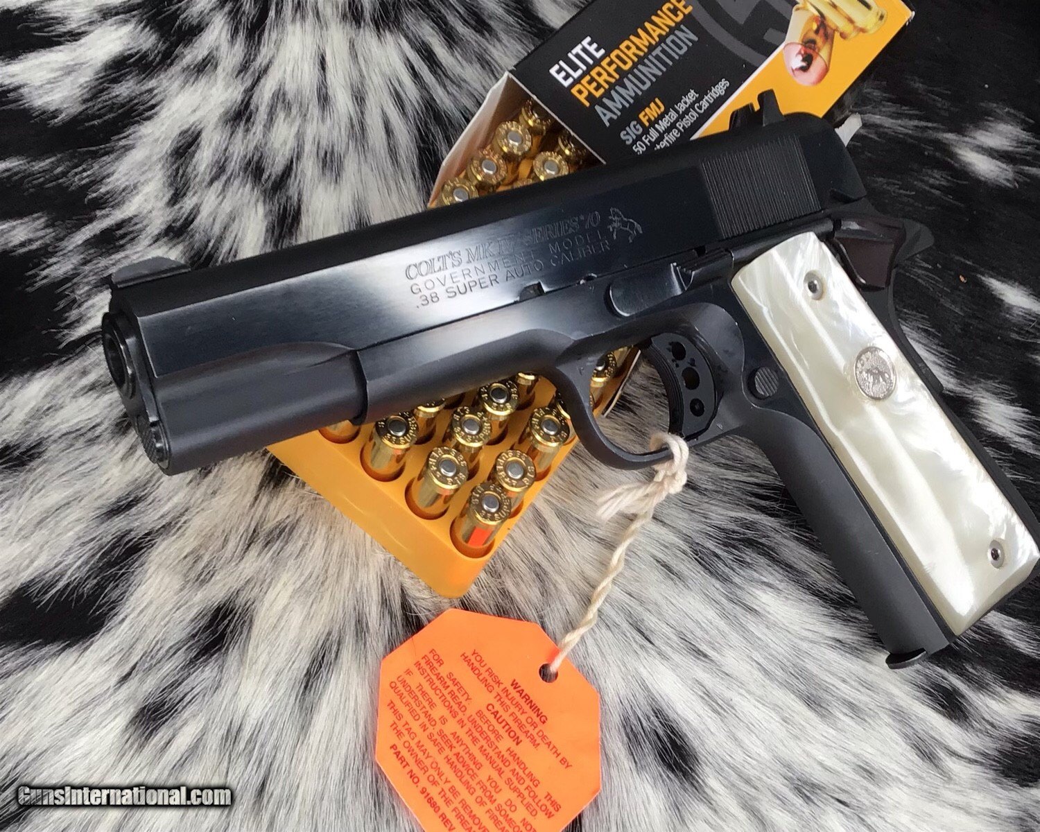 Description: 1980 Colt Government model, 70 Series chambered in .38 Super caliber. Colt Pearlite Grips with Silver Ramparts medallions . 97% or better finish remaining with various light handling marks. Aftermarket sights with White dots. Box is very good with normal age related distress and heavy rubbing to corners. 1 apron missing. A very nice 70 serial in the desirable .38 Super caliber. Add 3% if paying with credit card. God Bless America from a proud American, and a Viet Nam Vet , thankful for our freedoms.. paid for by the Blood ,Sweat and Tears of our brave men and women in uniform. Ten Below Firearms is a Veteran owned and operated business. We specialize in out of production models of high quality firearms. We love to ship! If you are out of state or can't make it to our store, just give us a call! Handguns normally ship for $30 and Long guns for $40 to $55 for extra length long guns. That's 2-3 day USPS Priority shipping, Delivery conformation and with tracking number. Optional Postal insurance is additional $1.50 per $100 and highly recommended. We are OPEN BY APPOINTMENT ONLY FOR IN PERSON VISITS. SOLD Handgun Caliber: .38 Super Auto Manufacturer: Colt Model: 1911 70 Series Serial Number: 70S36359 Barrel Length: 5 inch Condition: Very good Metal Condition: Very good Bore Condition: Very good Action: Single action semi-auto Finish: Blued Manufacture Date: 1980 |