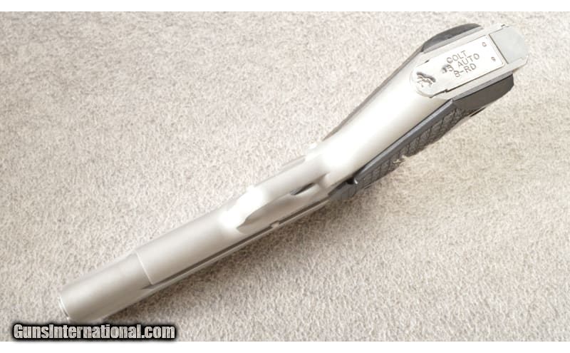 Description: Lightly used Colt Government Model Series 70 with a 5" barrel. This latest series colt is marked on the left side of the slide "GOVERNMENT / *MODEL*", "COLT", "AUTOMATIC / CALIBER .45" and with a rampant colt. The right of the frame is marked "COLT'S PT. F.A. MFG. CO. HARTFORD, CONN. U.S.A." with the serial number "GV036876". The right side of the slide is marked "COLT GOVERNMENT MODEL". The top of the barrel is marked "-COLT .45 AUTO N.M.-". The left of the trigger guard is marked "VP" in triangle and "F". The front sight is a fiber optic blade fixed to the front of the slide. The rear sight is a square-notch dovetailed to the rear of the slide. The grips are two-piece checkered wood with double diamonds and the rampant Colt pony. .45 ACP SOLD Chambers: 8 round semi auto. Metal Condition: 95% + with light surface marks in the brushed finish and operational wear on the barrel. Wood Condition: "No nicks, dings or chips. Does show excess glue around the colt pony. Bore Condition: Bright strong bore. Triggers: Single action trigger. Weight: 2.5 lbs Sights: "Fiber optic, drift adjustable. Item Location: Owatonna, MN |