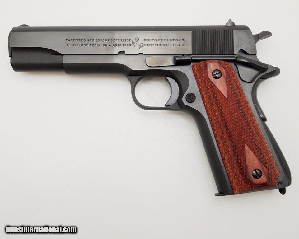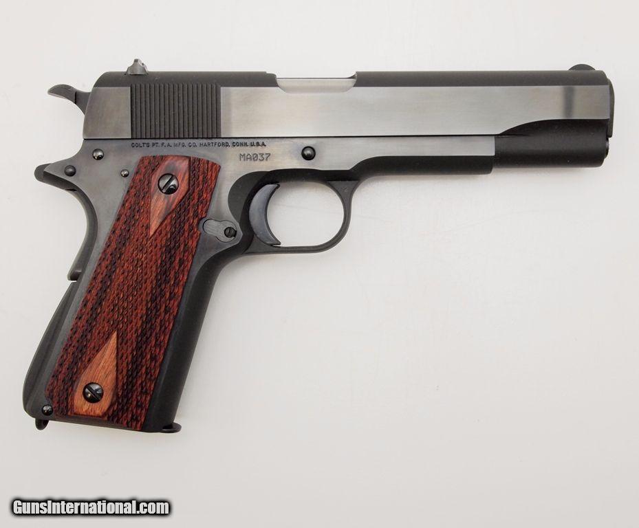 Description: Colt Government Wbox .45 ACP, 5" bbl, bright shiny bore, strong rifling, low profile rear notch with blade front sights, black finish, very nice checkered wood grips. This pistol is in excellent condition. Add 3% for Credit Card Shipping $25.00 SOLD |