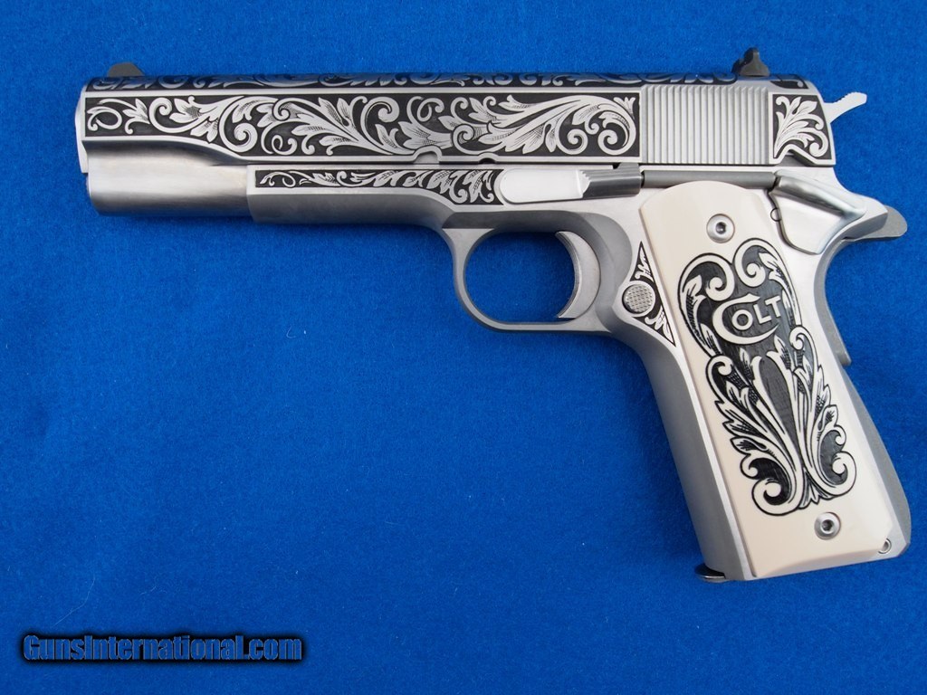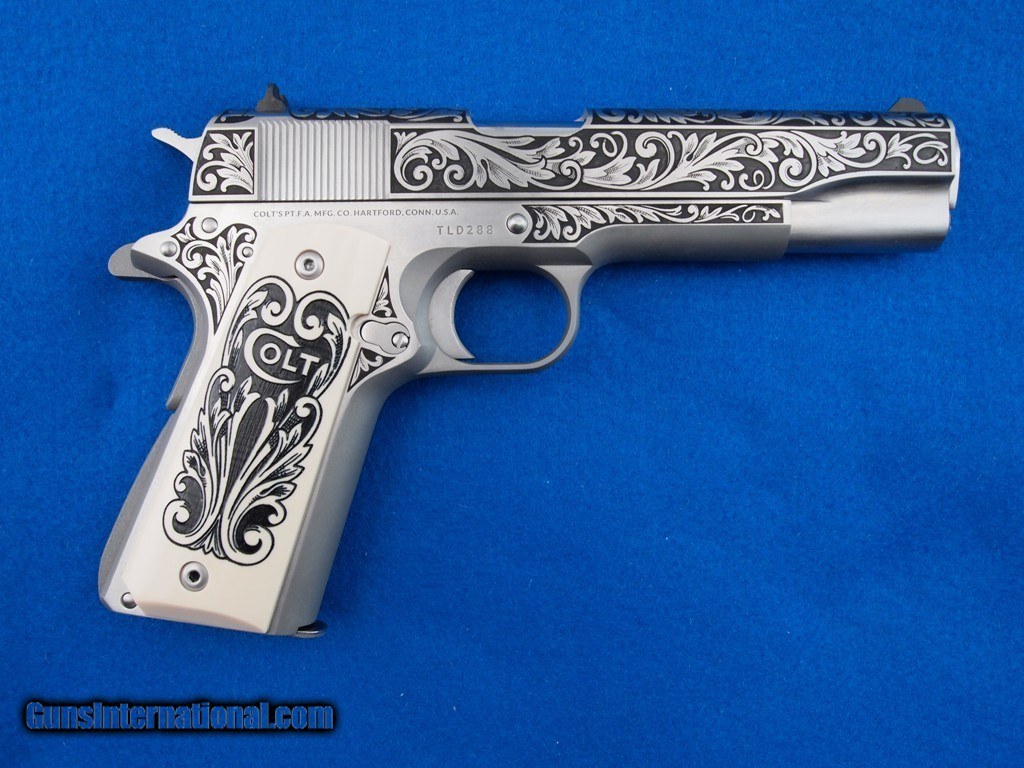 Description: Colt Govt TALO 01070A1CS-TLD .45 ACP NIB, The Engravers Series, The Lisa Tomlin Colt, Number 288 of 400, the slide sides - top - lug are polished and detailed with black filled deep etch scroll, frame is bright polished with black filled deep etching, the hammer - slide stop - mag catch - mag catch lock - barrel bushing - thumb safety - pins - hex grip screws - plunger tube are bright polished, very unique engraved grips, original grips, and two 8 round magazine. This is a very distinctive pistol with Master Engraver Lisa Tomlin designed floral engraving! Add 3% for Credit Card Shipping $25.00 SOLD |