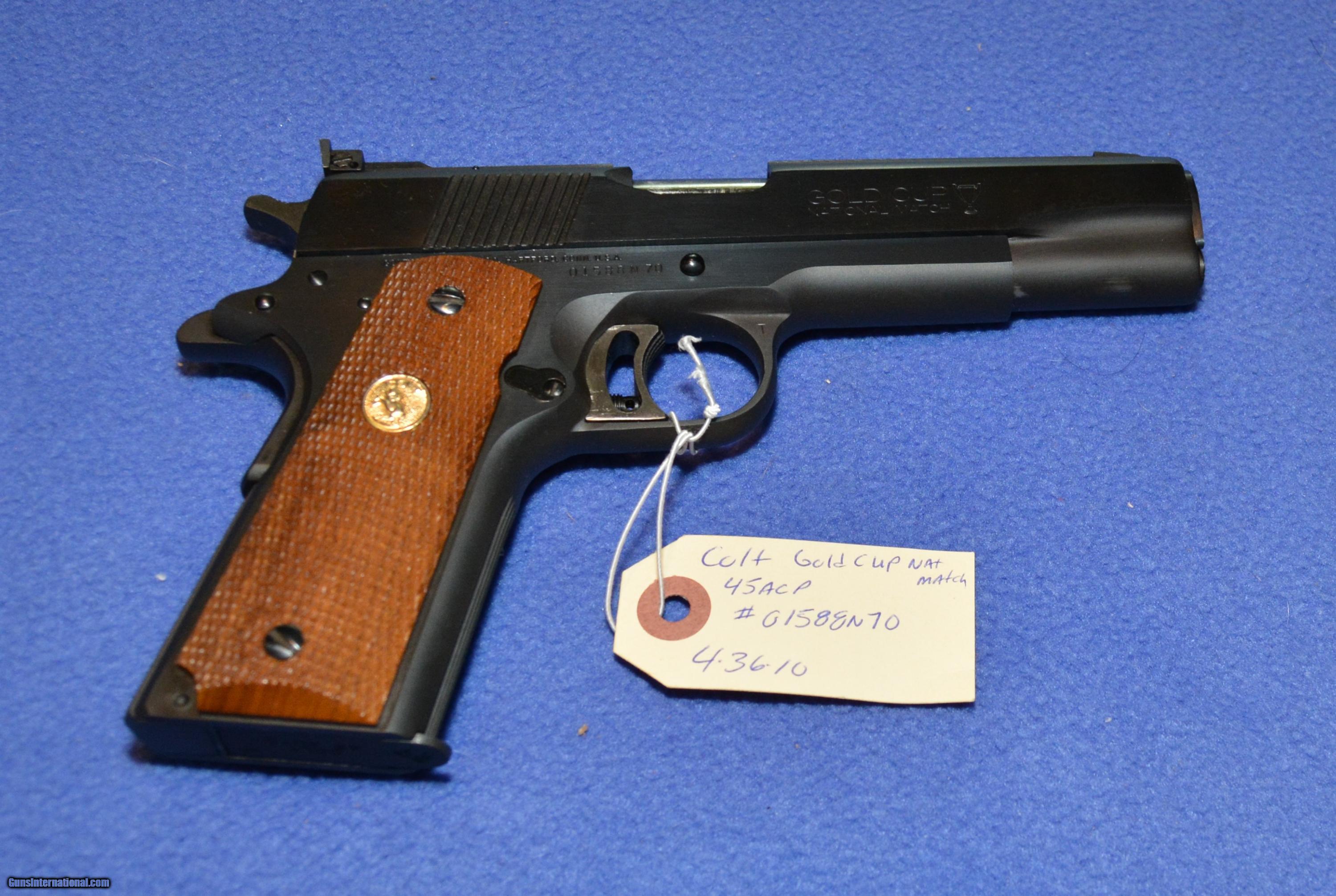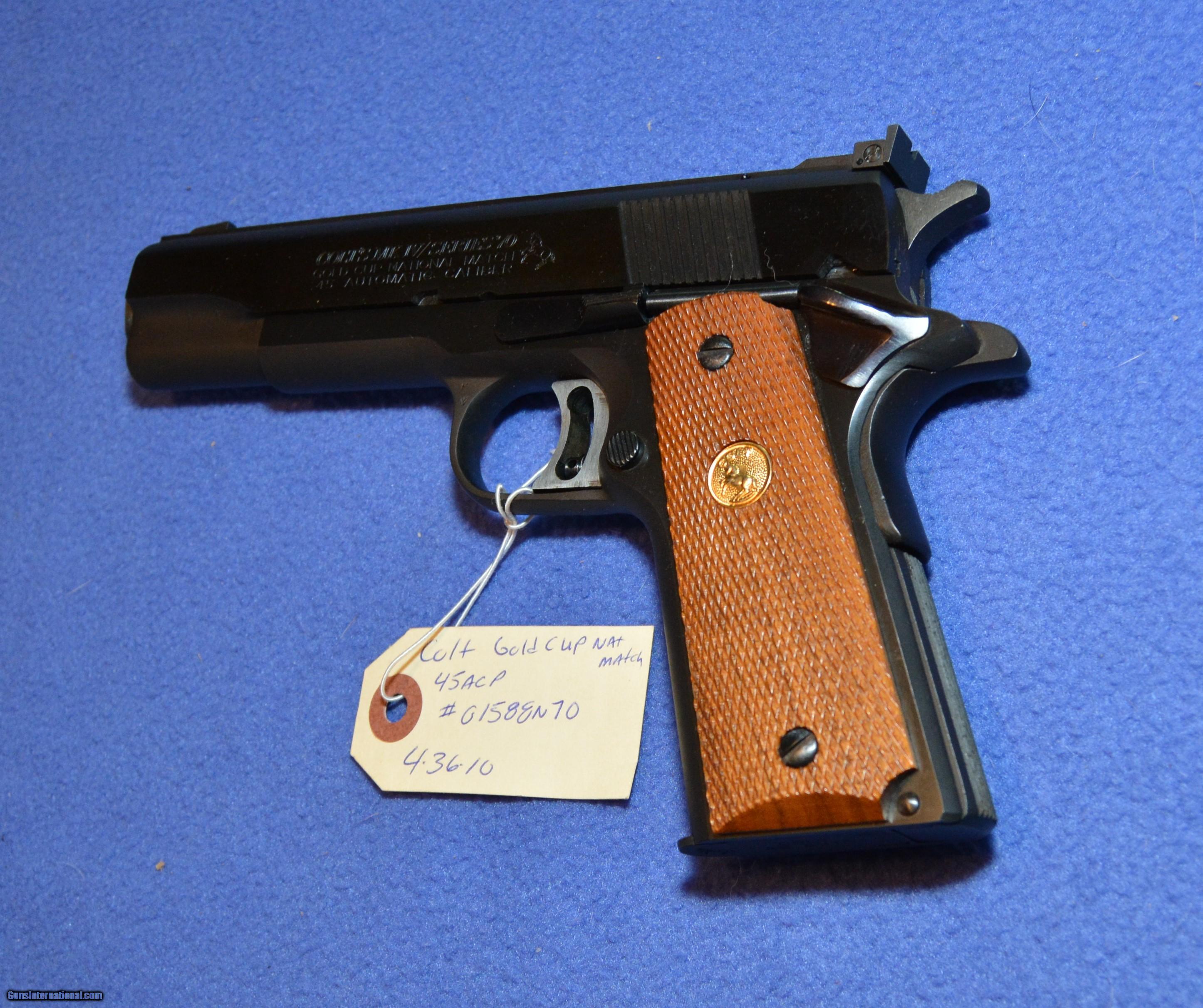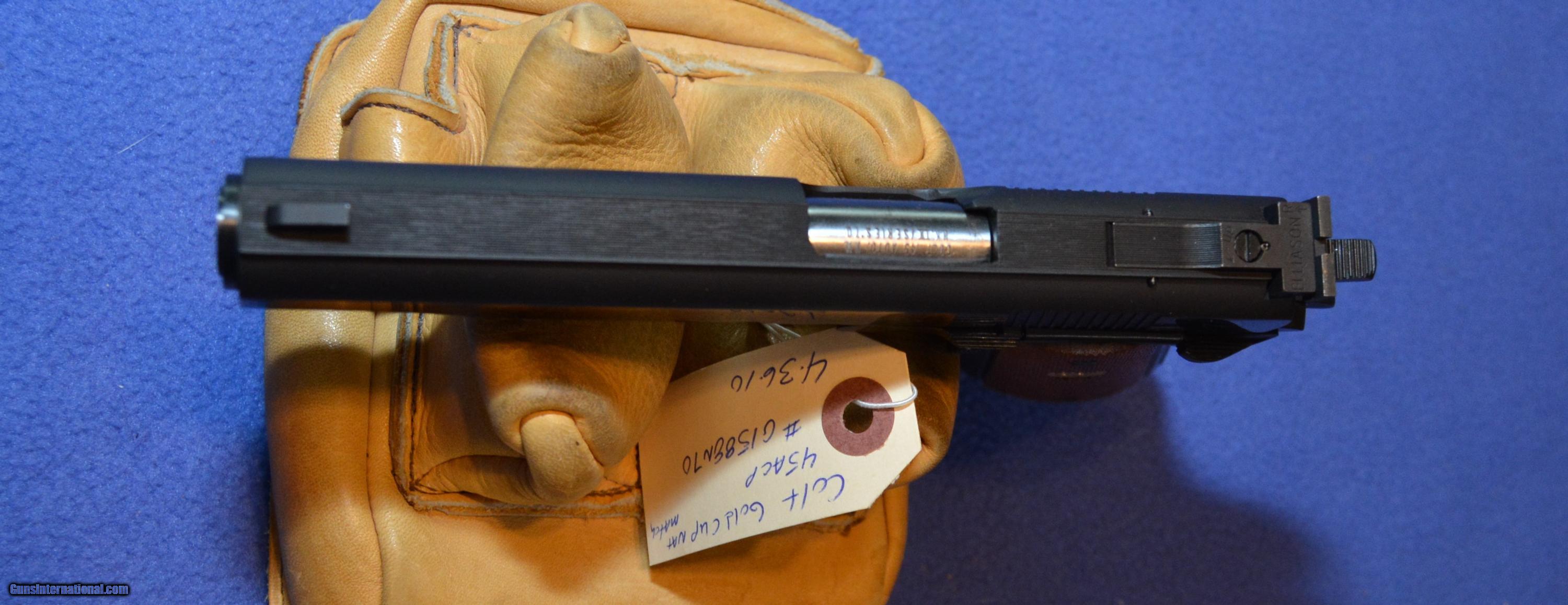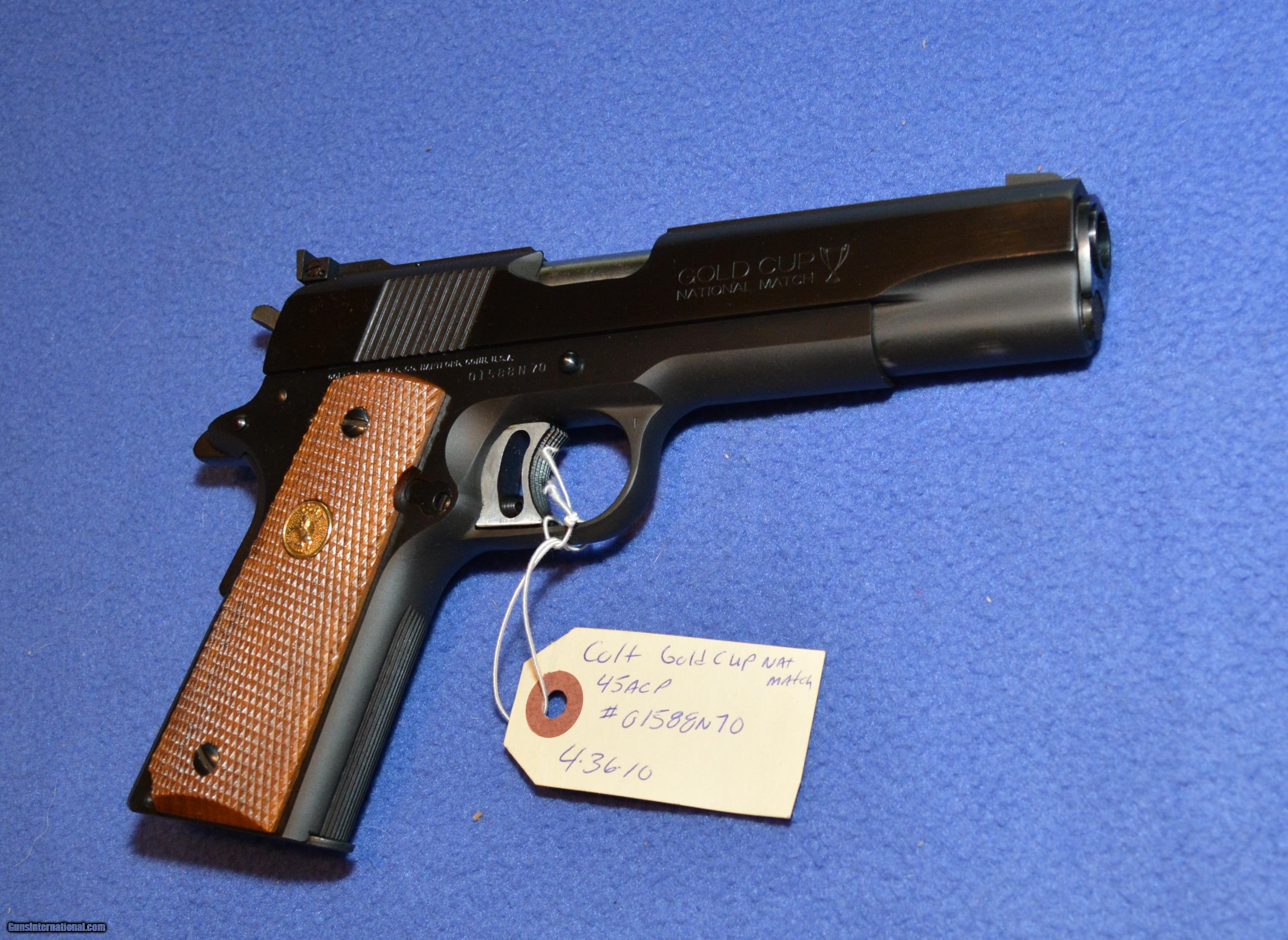 Description: Colt Mark IV / Series 70 Gold Cup National Match This Colt Gold Cup National Match 45 ACP appears to be unfired. The pistol bears serial # 01588N70. Buyer will receive the box and papers and a bushing wrench for this fine pistol. (I added the wrench from another Colt) Previous owner bought out the inventory of a store and at his passing his estate has asked us to sell off his collection. This is a 100% unmolested Colt with 100% all factory Colt parts. Factory issued Elliason sights. The exterior finish is virtually mint, there are only the faintest surface marks on the bottom of the slide. These are probably from the pistol being hand cycled either in the store or whilst in the possession of the previous owner for maintenance wipe downs. Bore is mint and again appears unfired. Magazine follower shows no indication of a cartridge having ever been installed or cycled into the chamber. Yes, we gladly ship to California if legal there. Shipping will be $20.00 USPS Priority Mail. If illegal to own in your area don’t bid. Payment with US Funds from US Banks ONLY!!! We accept Cash, Checks, Money Order and US Postal Money Orders. We also accept Visa, MasterCard, American Express and Discover at 2.8% service fee. All items ship when payment clears, no exceptions. We cannot accept PayPal for firearms or ammunition, their policy not ours. Call 865-805-1187 for details or questions. Out of state buyers no sales tax yet. Local buyers must pay TN sales tax and $10.00 TBI state back ground check fee. Please encourage your congressman and senator to vote against an internet sales tax and instead encourage local shops to hire persons to post on the web. I’ve done both! SOLD Manufacturer: Colt Model: Series 70 Gold Cup National Match Serial Number: 01588N70 Caliber Info: 45 ACP Condition: 98.999 Metal Condition: 98.99 Wood Condition: 99.9% Bore Condition: Mint Barrels: 5 inch Action: Semi Auto |