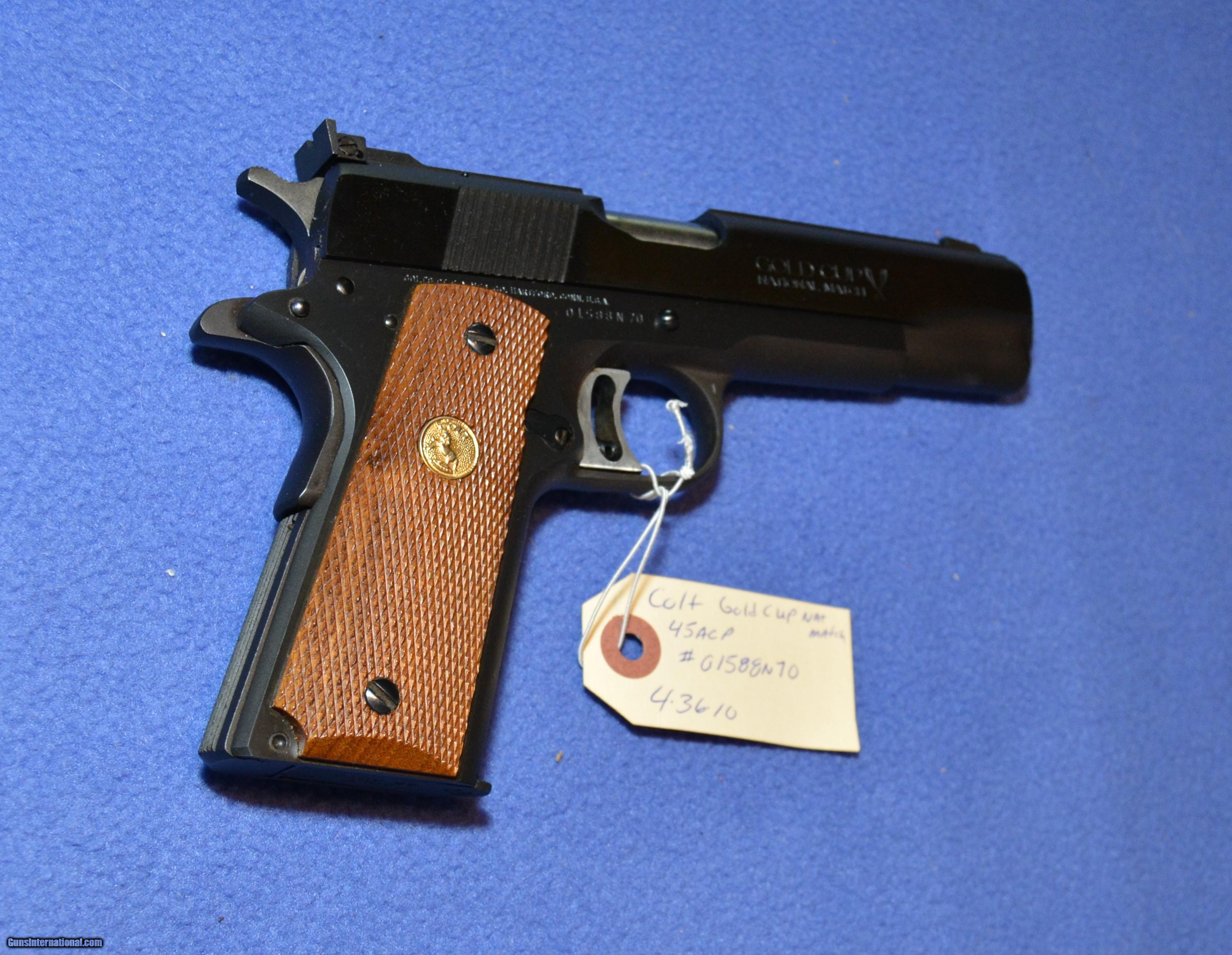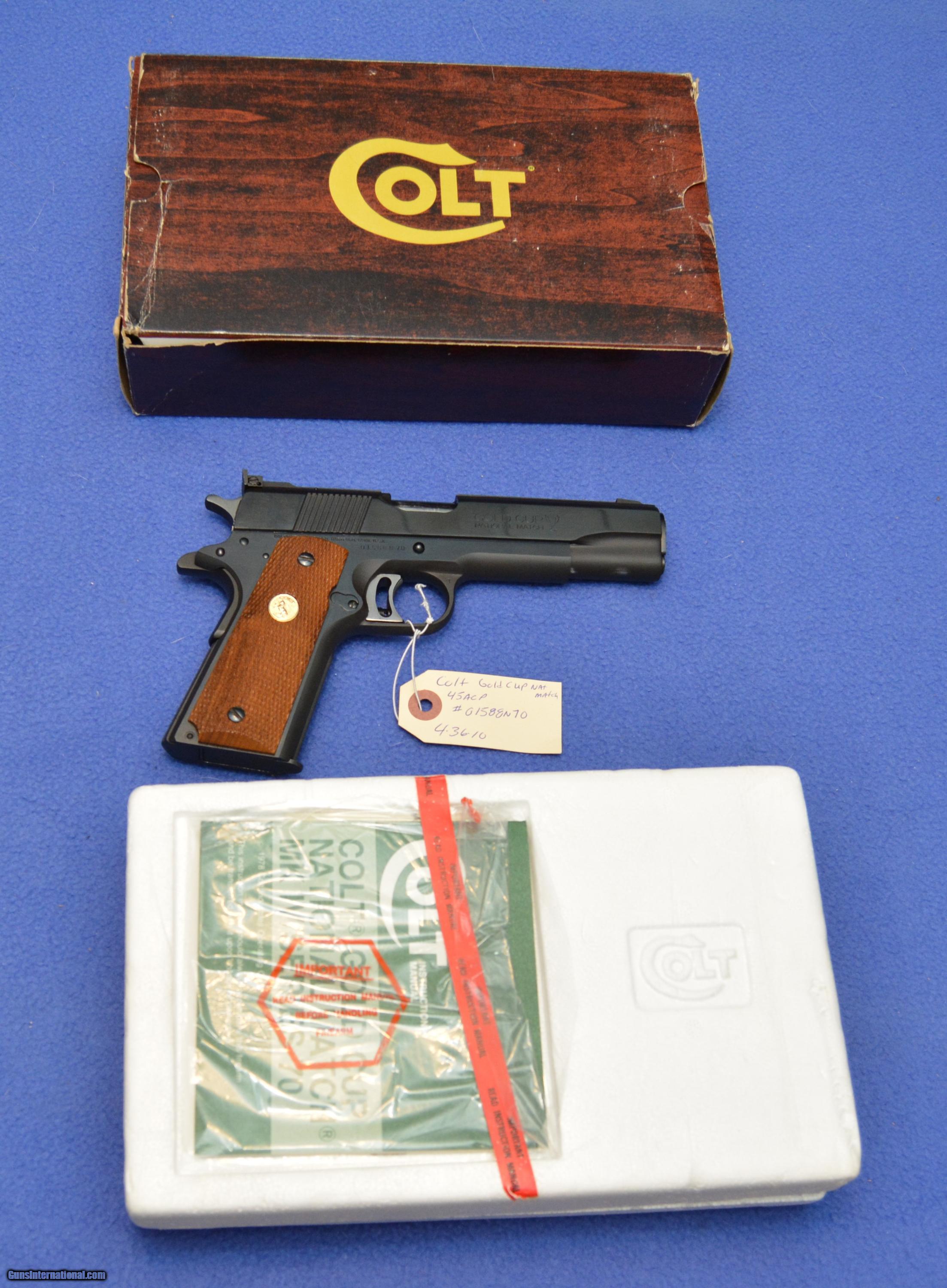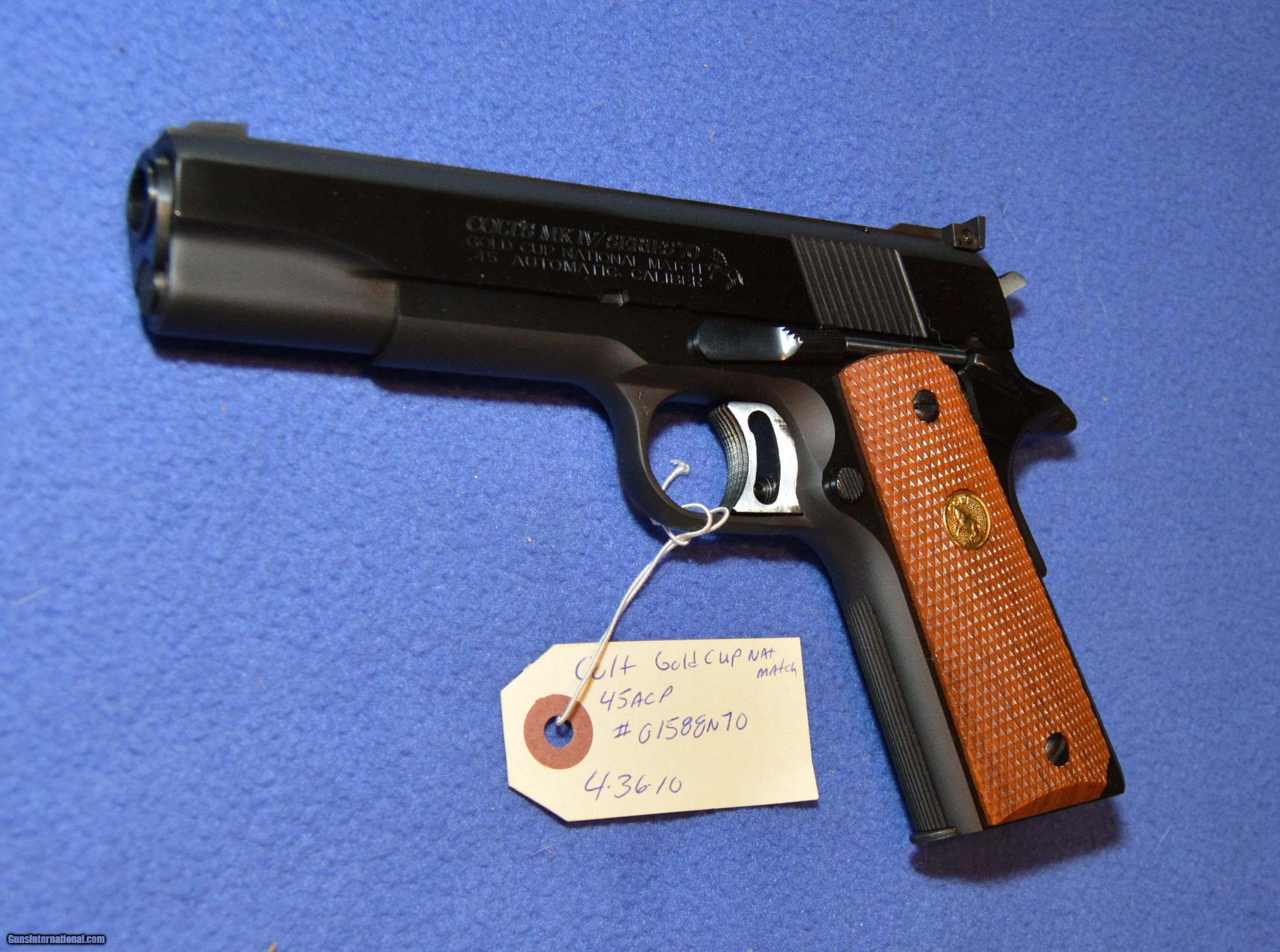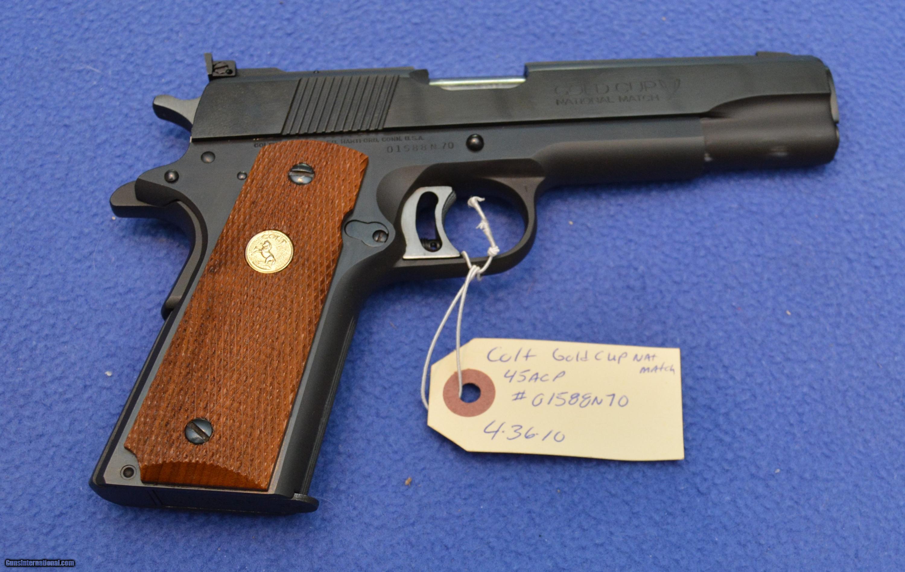 Description: Colt Mark IV / Series 70 Gold Cup National Match This Colt Gold Cup National Match 45 ACP appears to be unfired. The pistol bears serial # 01588N70. Buyer will receive the box and papers and a bushing wrench for this fine pistol. (I added the wrench from another Colt) Previous owner bought out the inventory of a store and at his passing his estate has asked us to sell off his collection. This is a 100% unmolested Colt with 100% all factory Colt parts. Factory issued Elliason sights. The exterior finish is virtually mint, there are only the faintest surface marks on the bottom of the slide. These are probably from the pistol being hand cycled either in the store or whilst in the possession of the previous owner for maintenance wipe downs. Bore is mint and again appears unfired. Magazine follower shows no indication of a cartridge having ever been installed or cycled into the chamber. Yes, we gladly ship to California if legal there. Shipping will be $20.00 USPS Priority Mail. If illegal to own in your area don’t bid. Payment with US Funds from US Banks ONLY!!! We accept Cash, Checks, Money Order and US Postal Money Orders. We also accept Visa, MasterCard, American Express and Discover at 2.8% service fee. All items ship when payment clears, no exceptions. We cannot accept PayPal for firearms or ammunition, their policy not ours. Call 865-805-1187 for details or questions. Out of state buyers no sales tax yet. Local buyers must pay TN sales tax and $10.00 TBI state back ground check fee. Please encourage your congressman and senator to vote against an internet sales tax and instead encourage local shops to hire persons to post on the web. I’ve done both! SOLD Manufacturer: Colt Model: Series 70 Gold Cup National Match Serial Number: 01588N70 Caliber Info: 45 ACP Condition: 98.999 Metal Condition: 98.99 Wood Condition: 99.9% Bore Condition: Mint Barrels: 5 inch Action: Semi Auto |